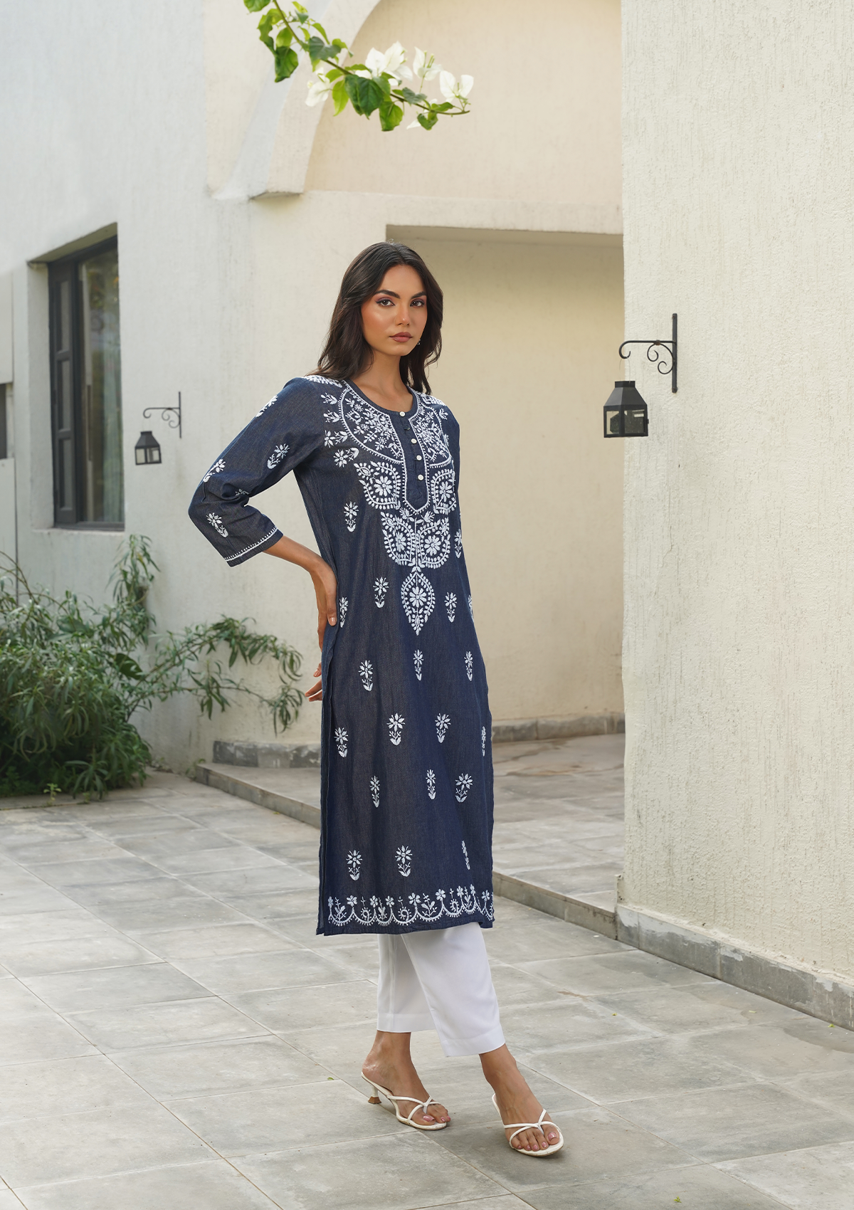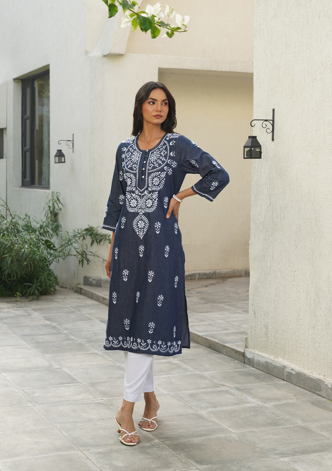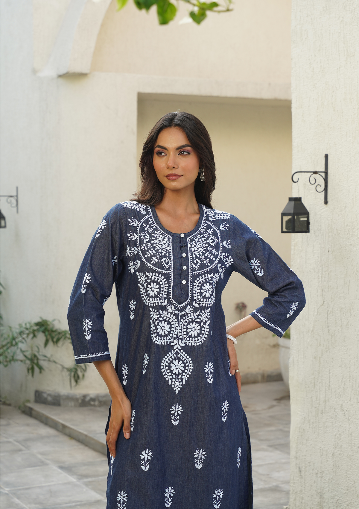 HOC Chambray Denim Chikankari Solid Straight Women's Long Kurta-Dark Blue