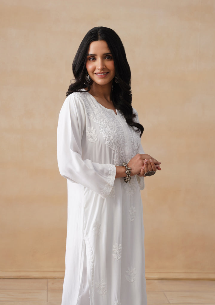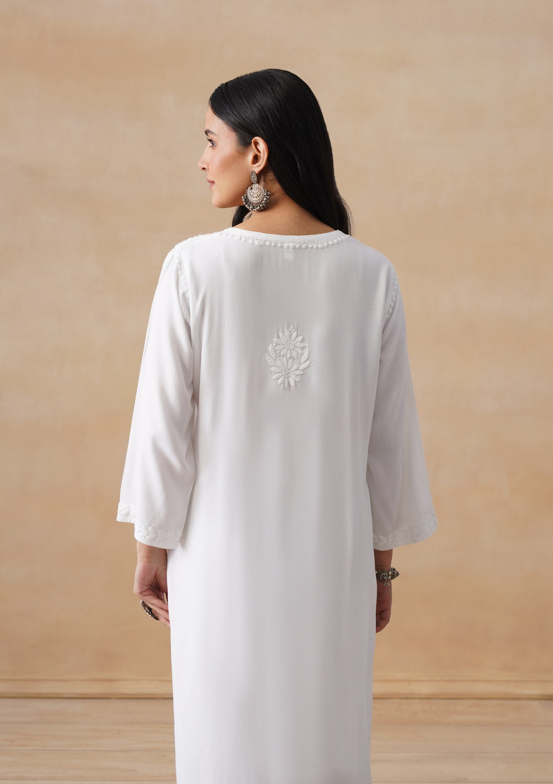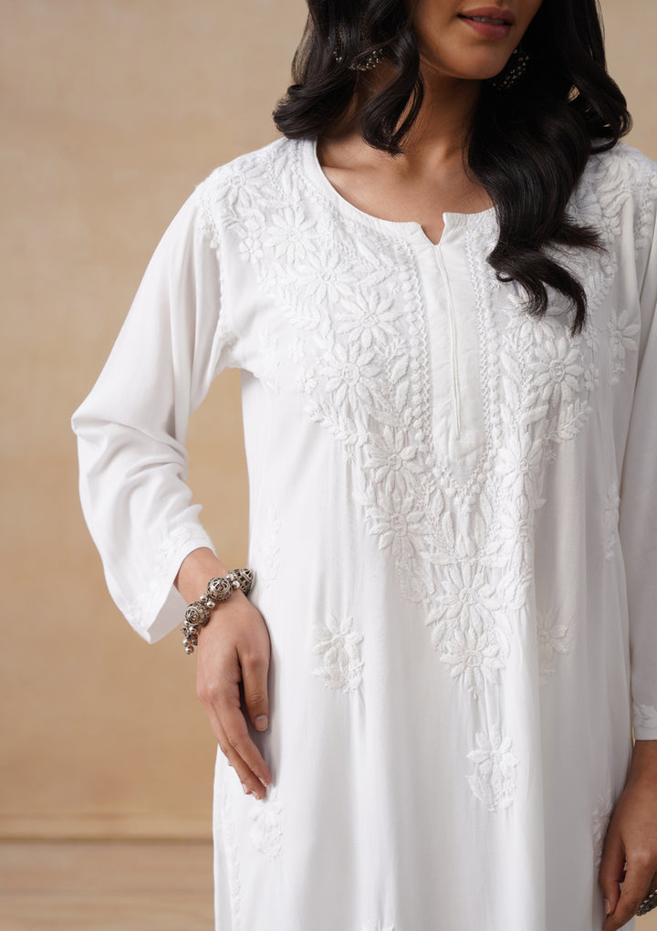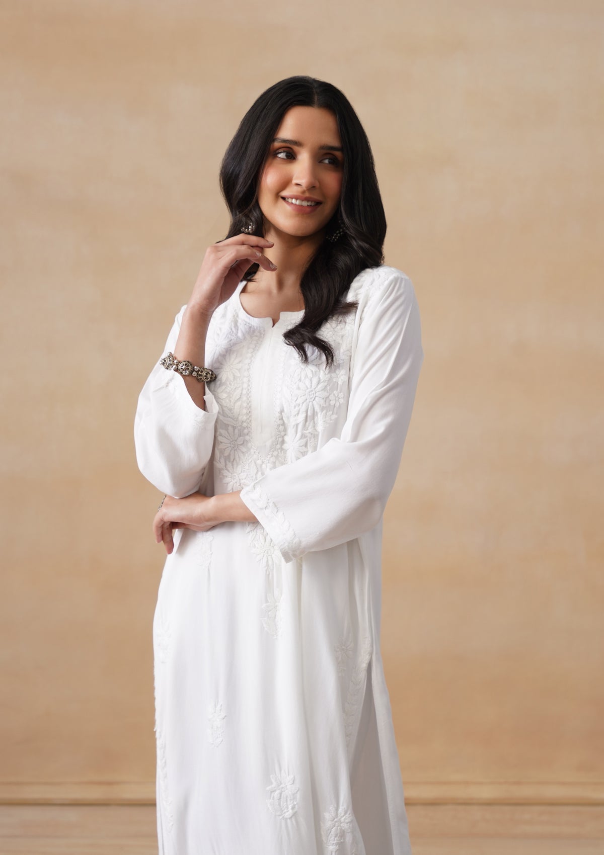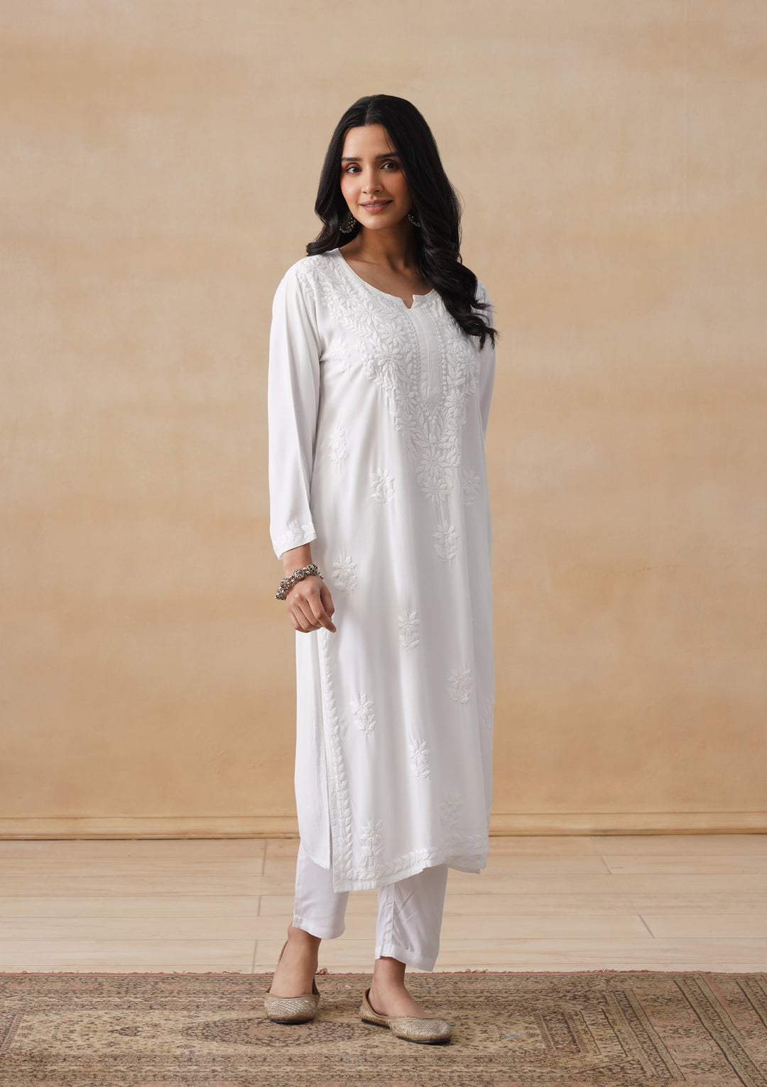 HOC Rayon Chikankari Solid Women's Long Kurta - White