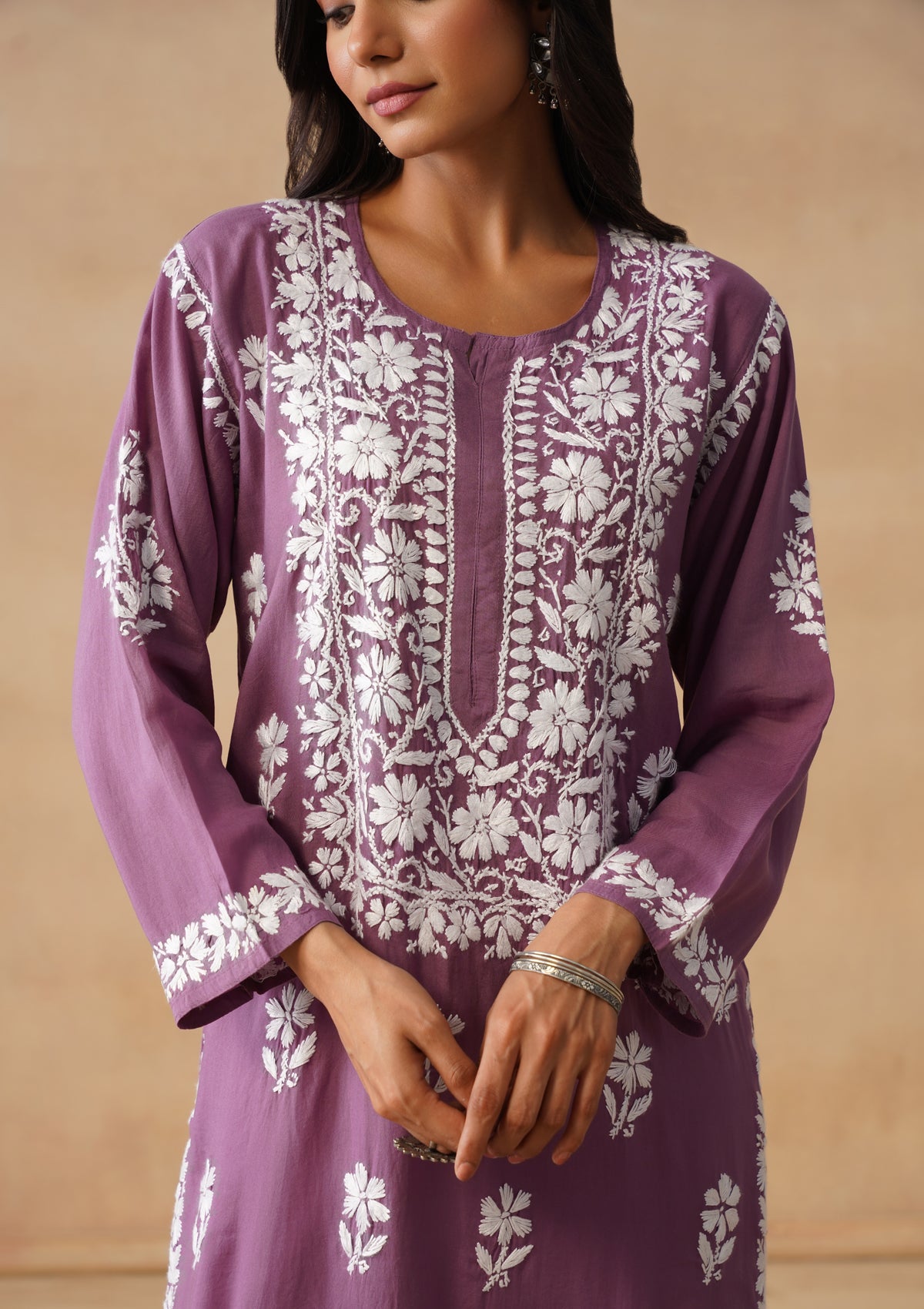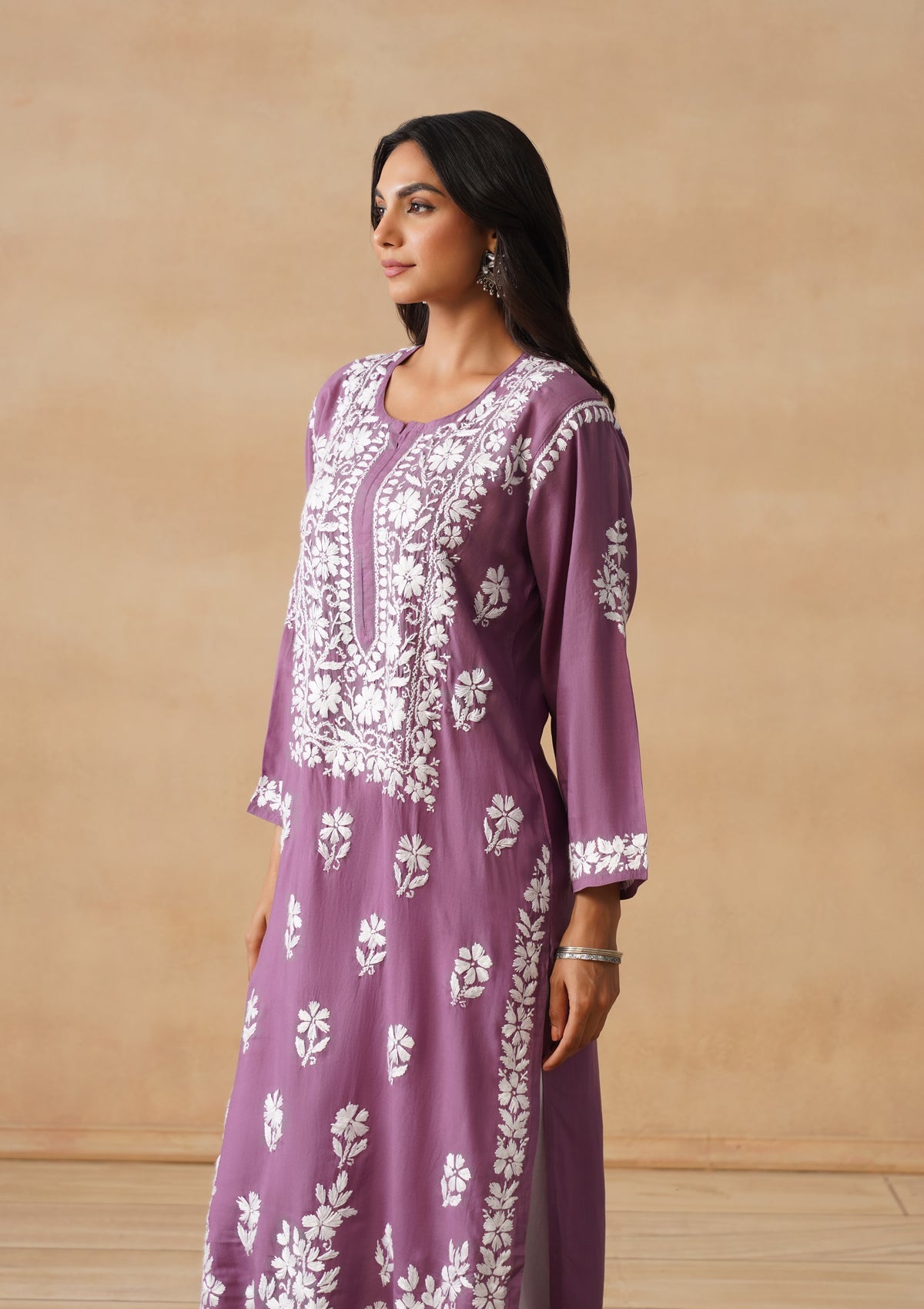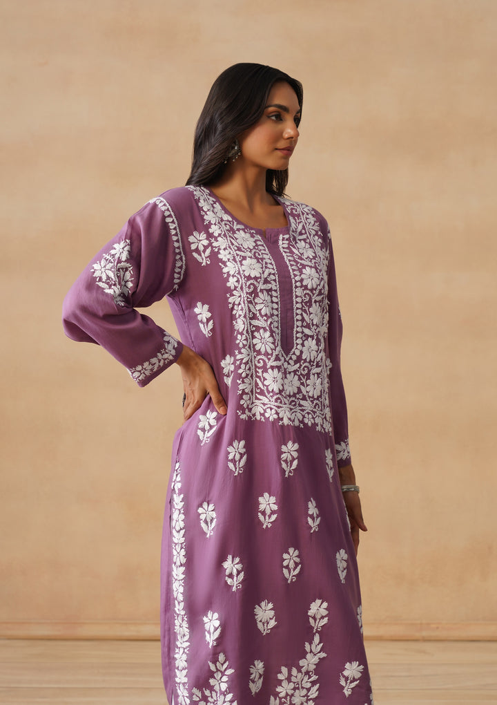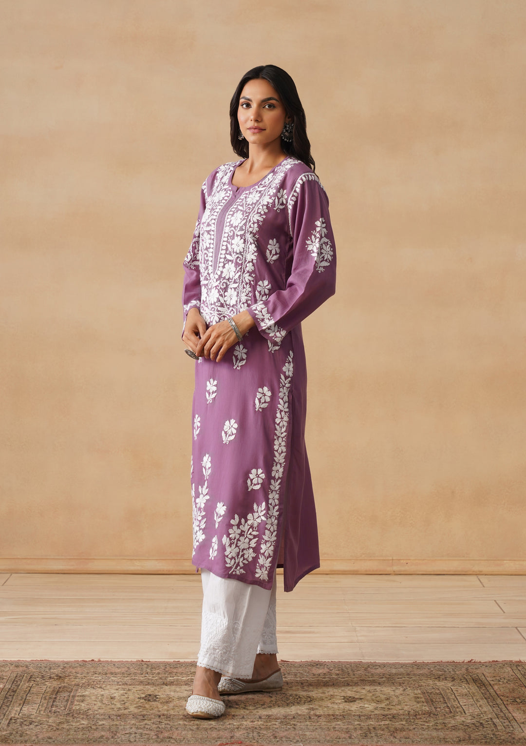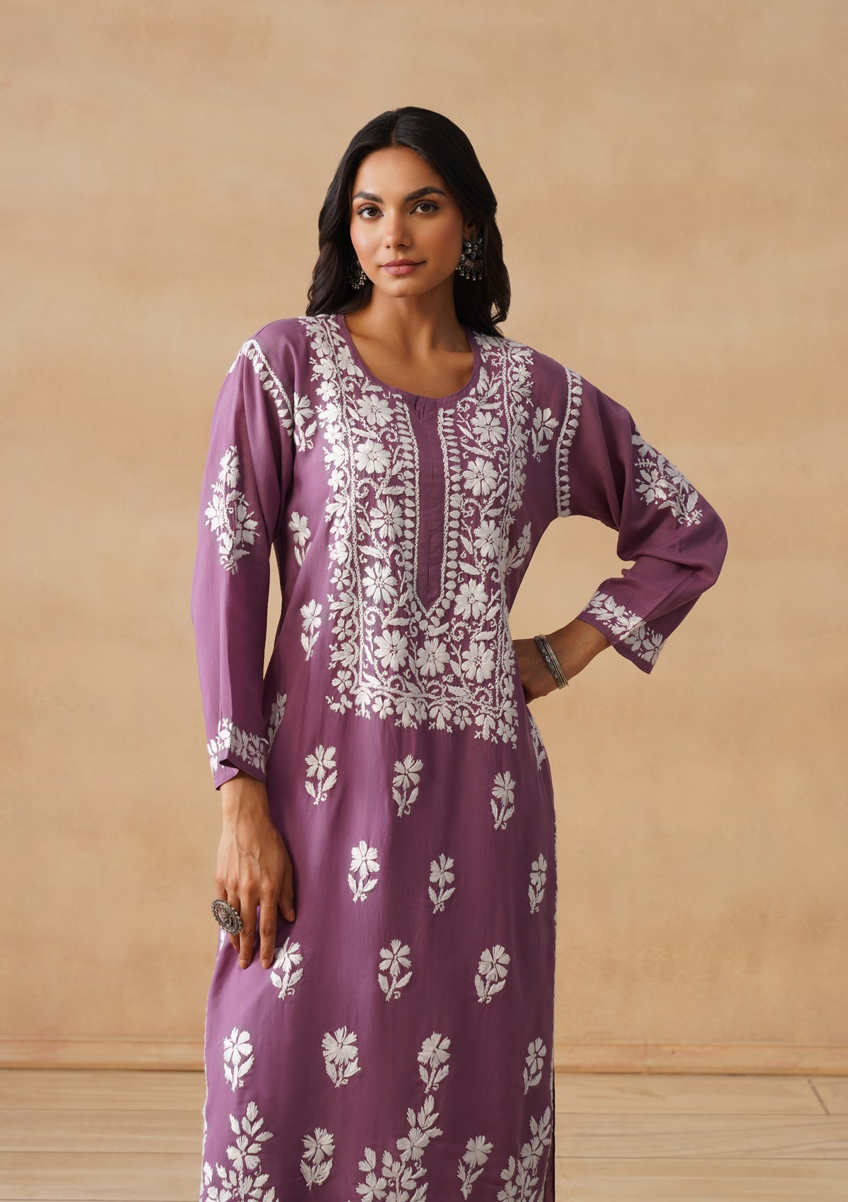 HOC Modal Chikankari Solid Women's Long Kurta - Mauve