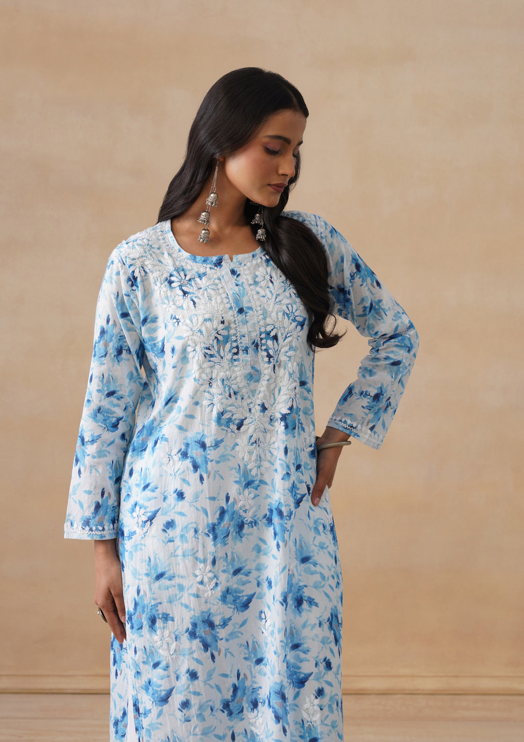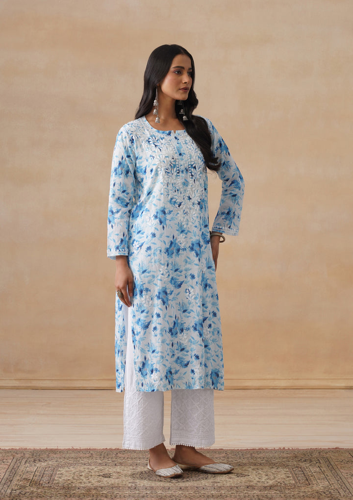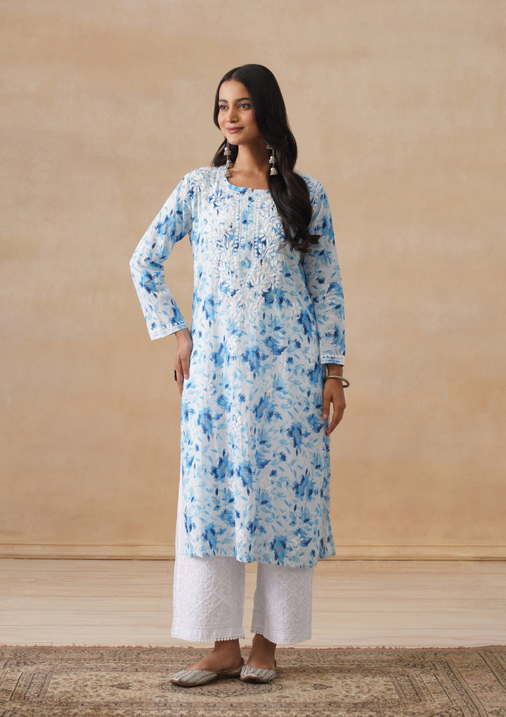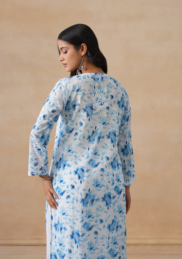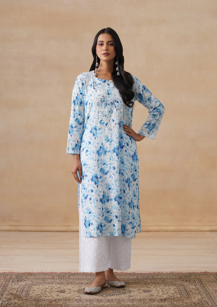 HOC Mulmul Chikankari Printed Women's Long Kurta - Blue