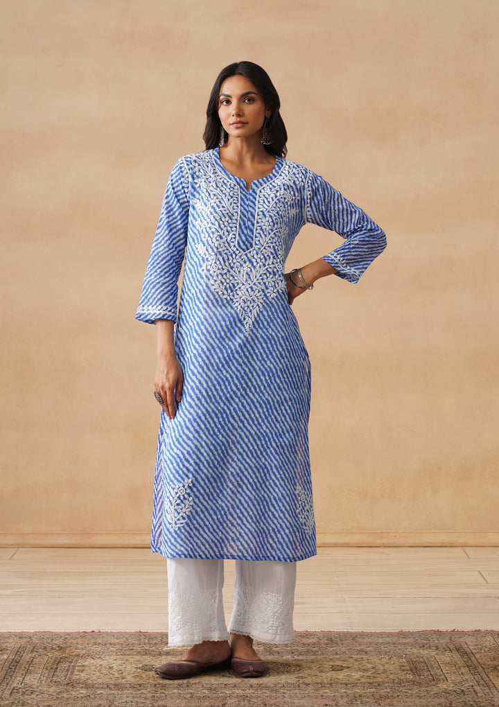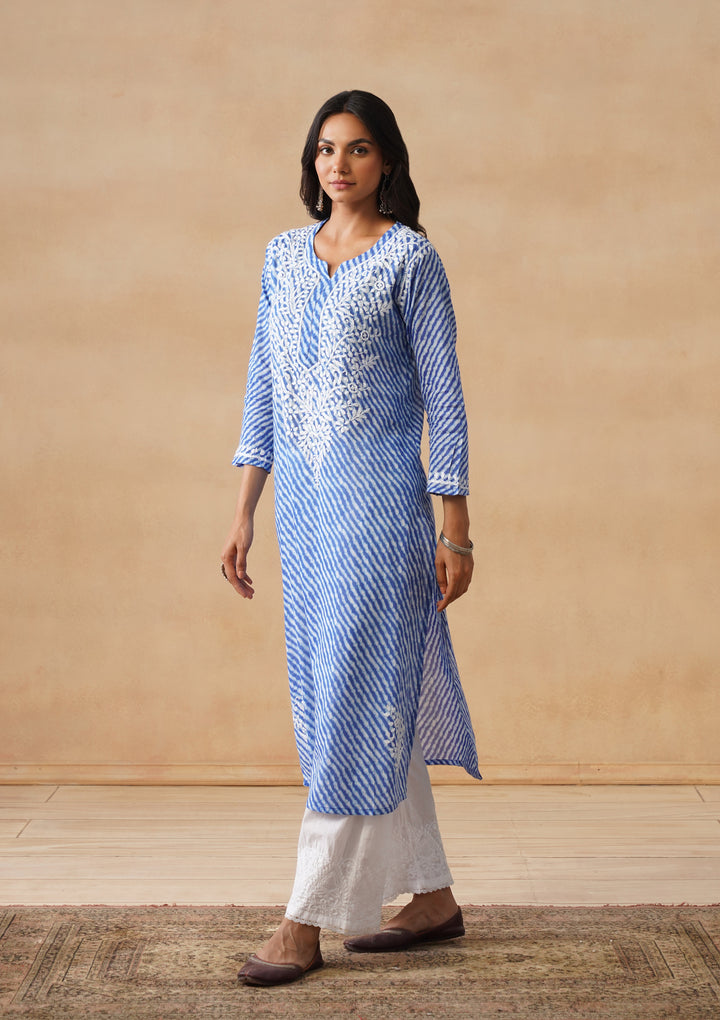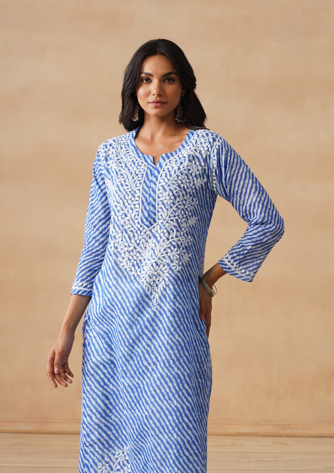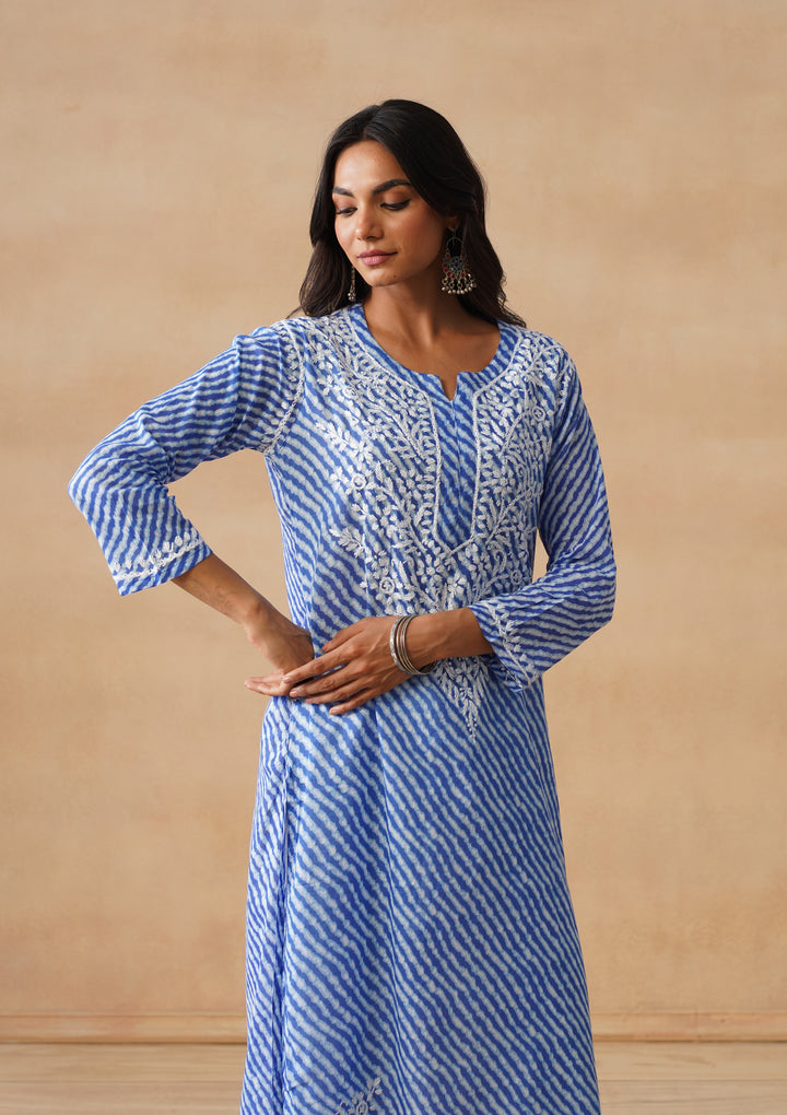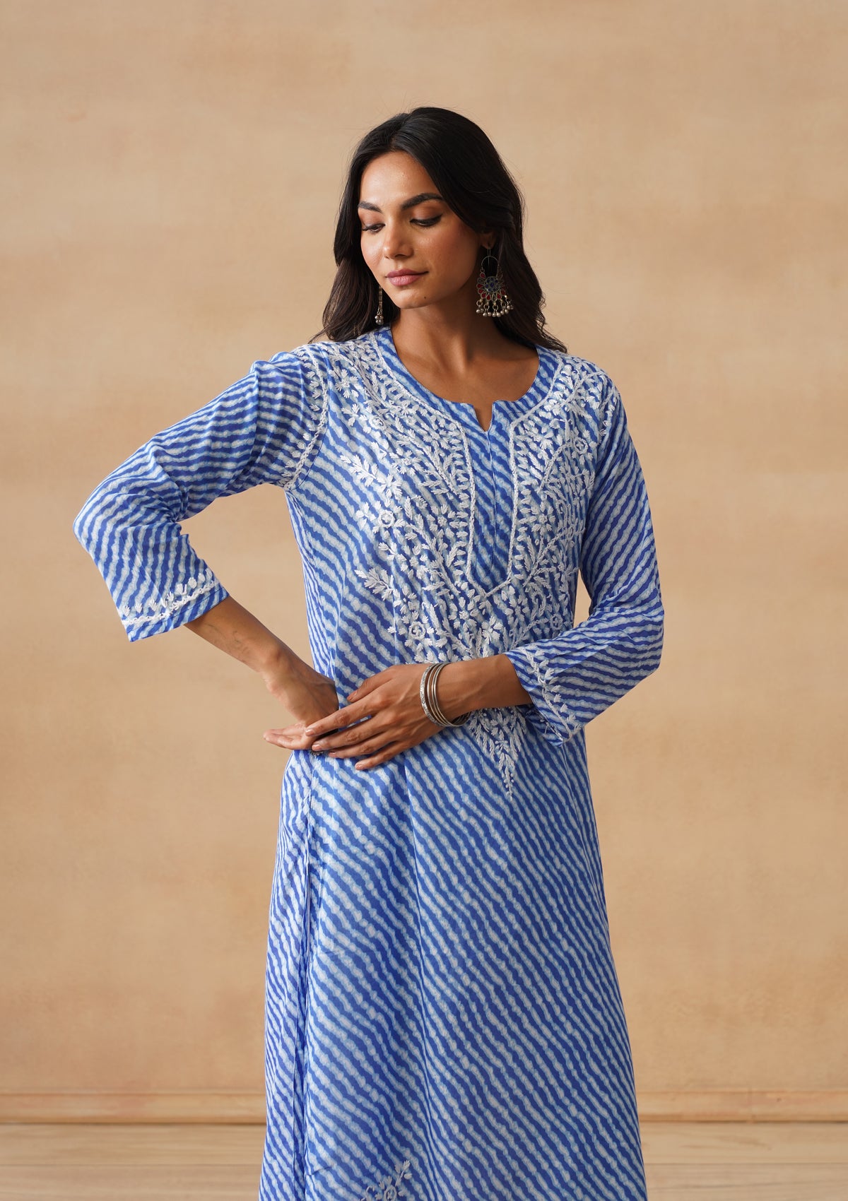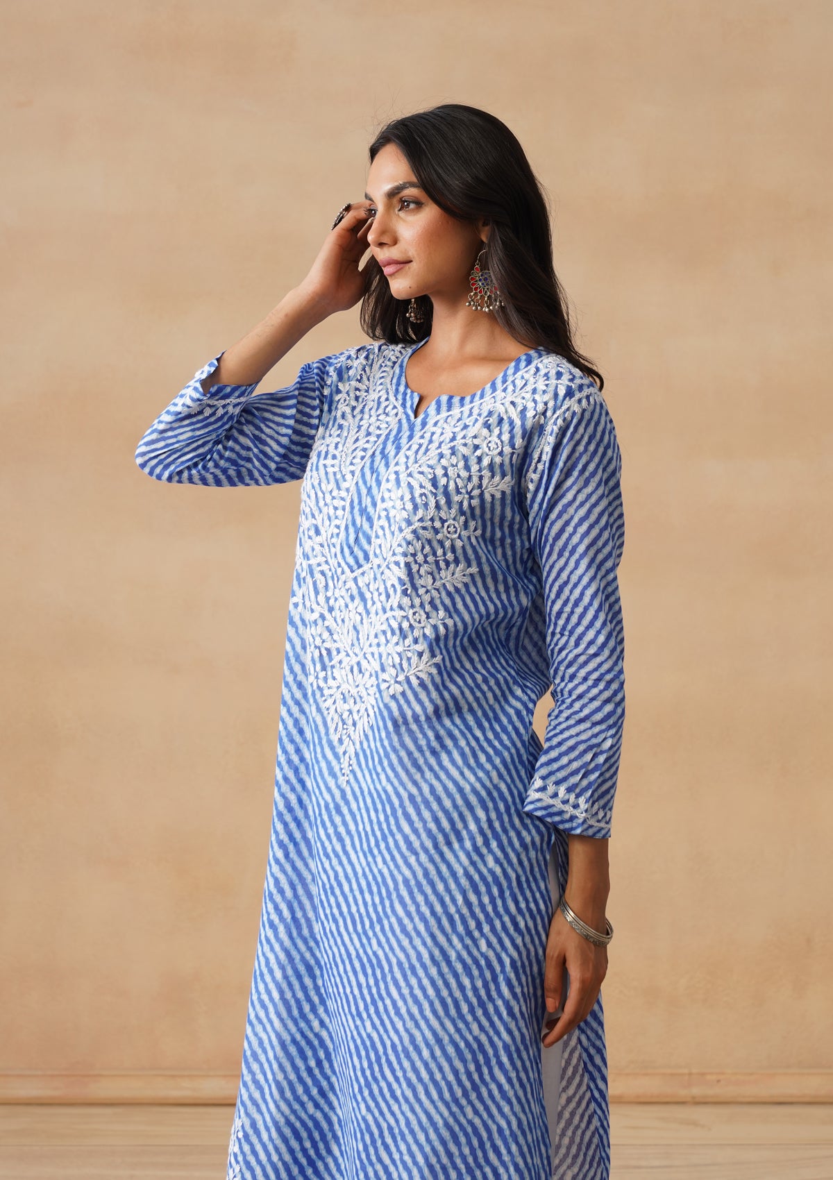 HOC Mulmul Chikankari Printed Women's Long Kurta - Blue
