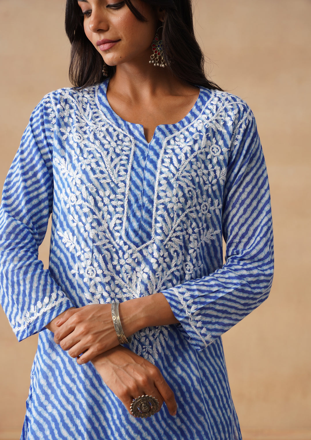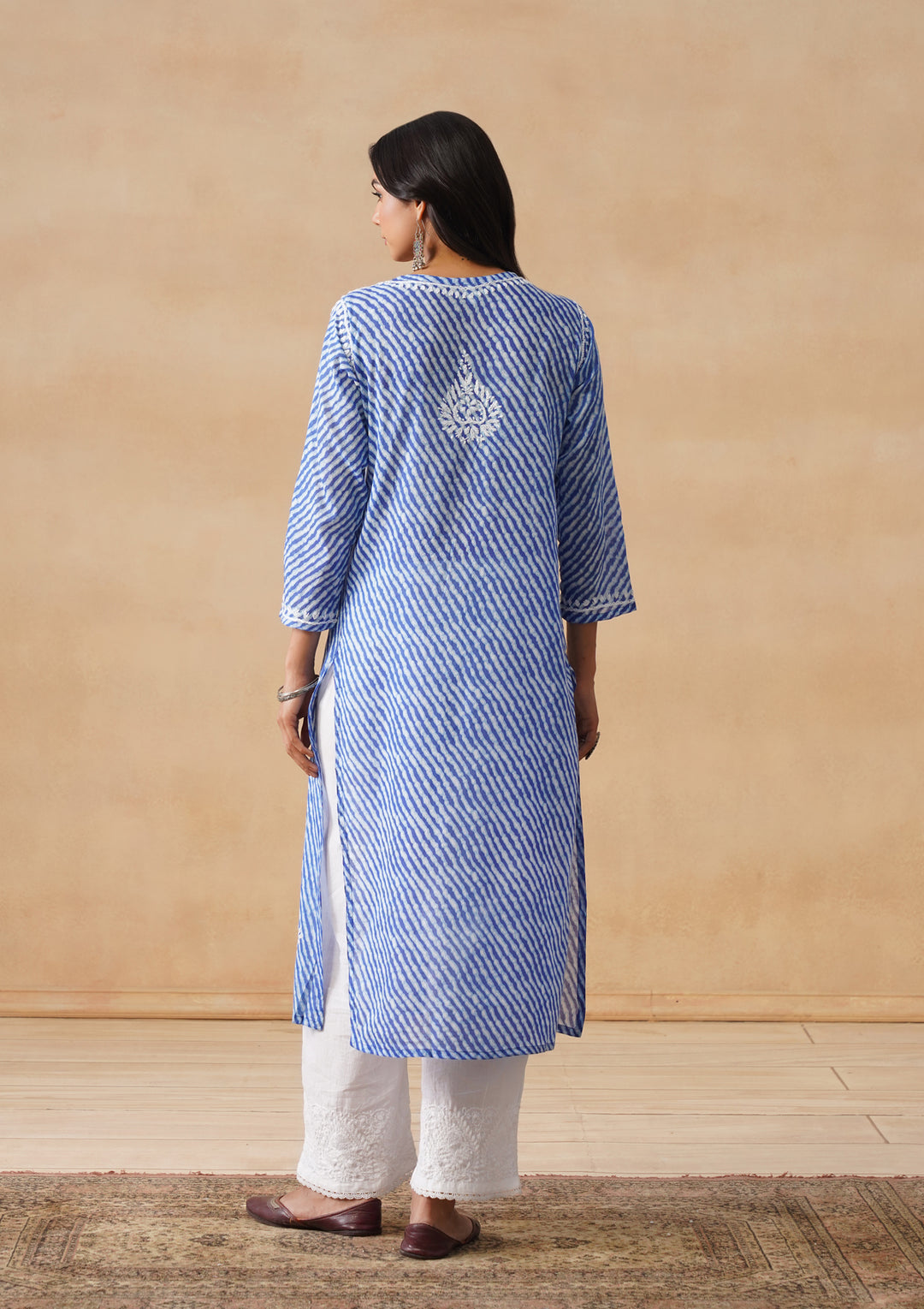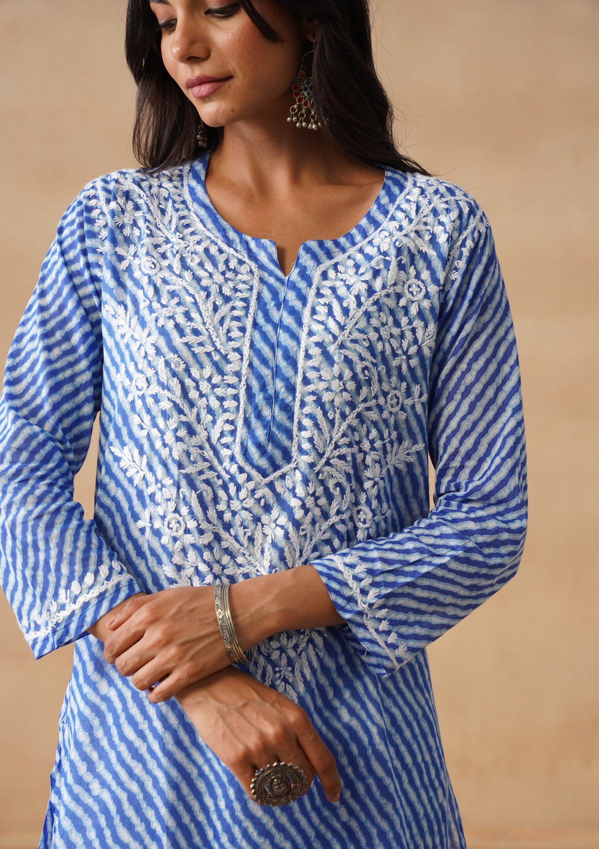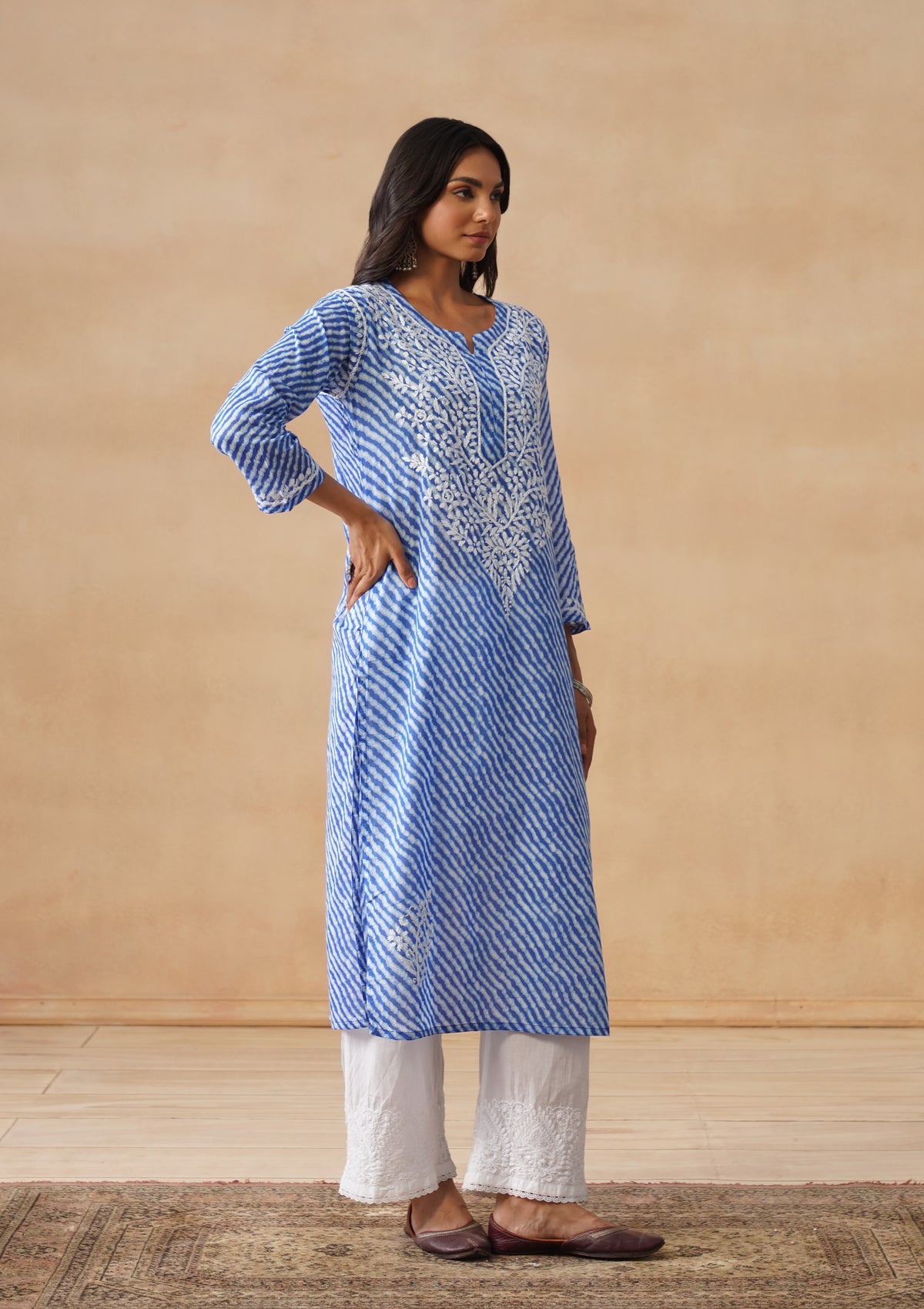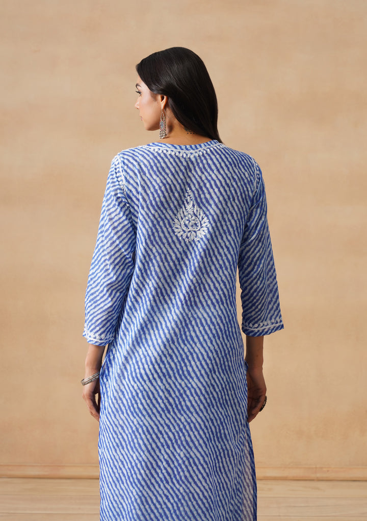 HOC Mulmul Chikankari Printed Women's Long Kurta - Blue
