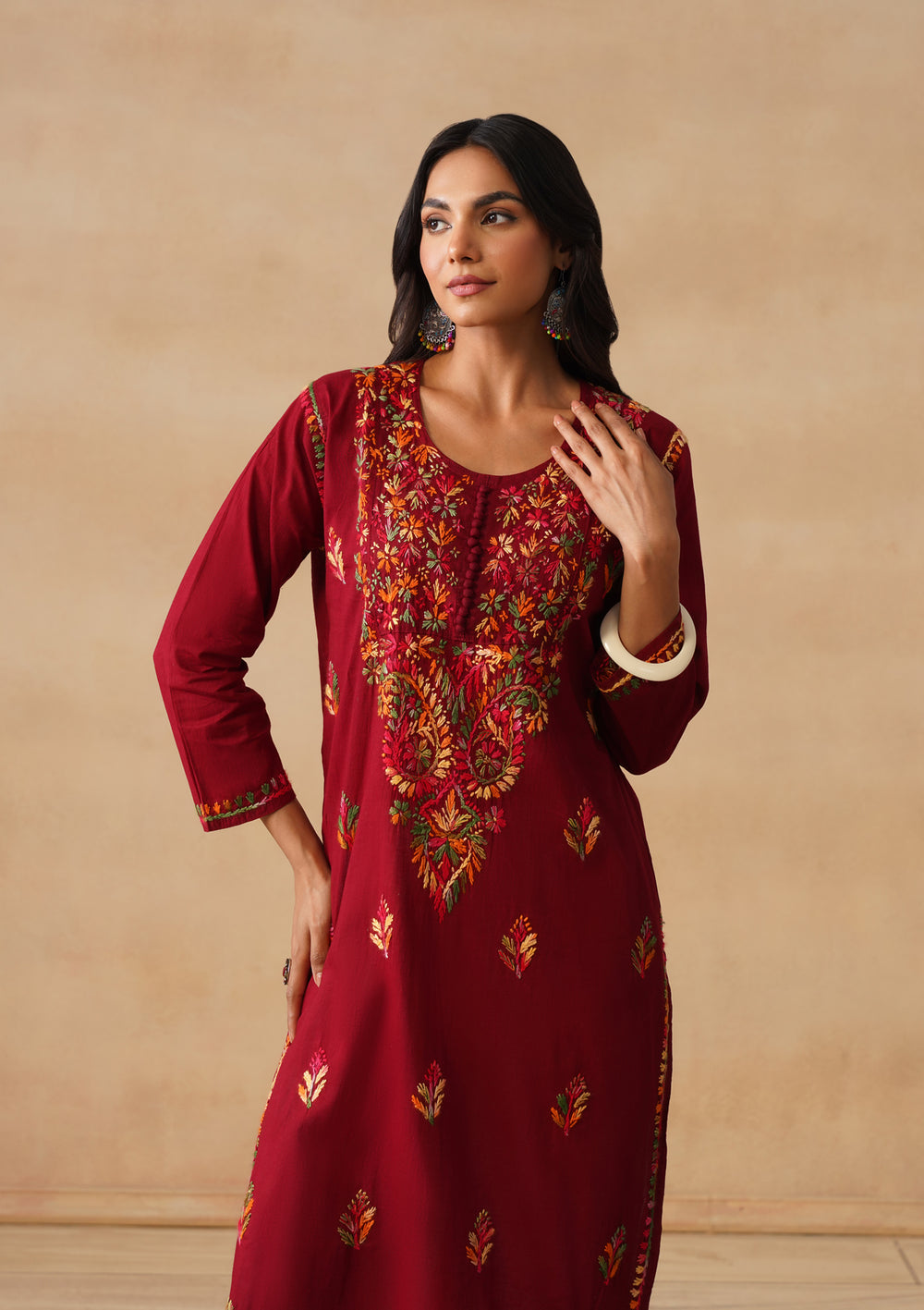 Each fabric is chosen not just for its aesthetic appeal but for how it enhances the chikankari work. The embroidery on our maroon chikankari kurtas collection is done by skilled artisans who understand the relationship between fabric and thread, ensuring every piece feels balanced and beautifully crafted.
