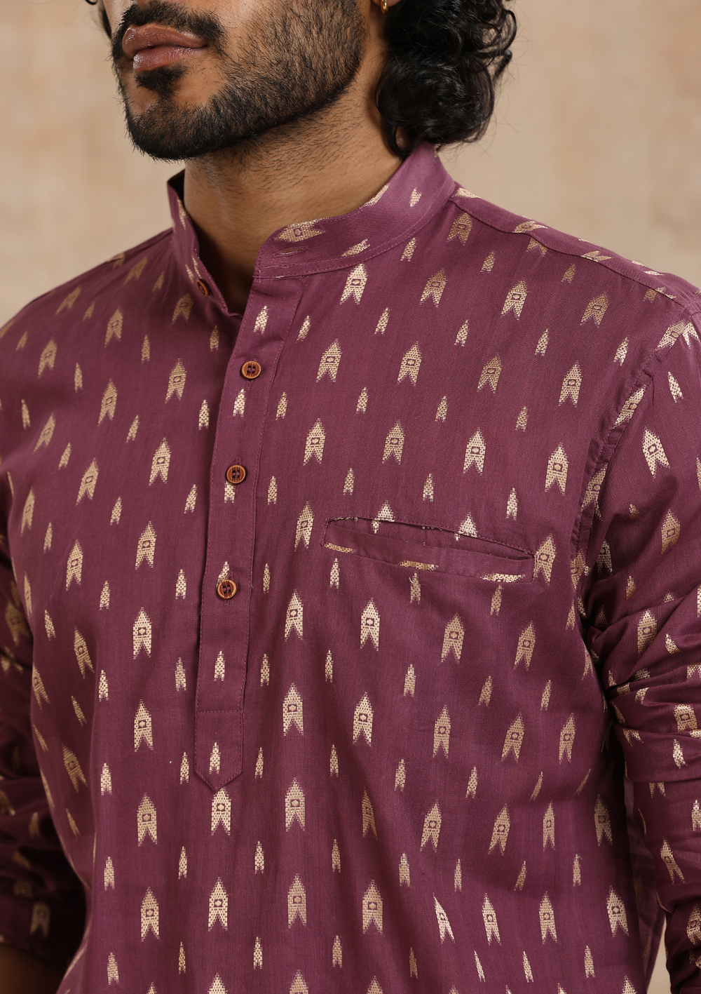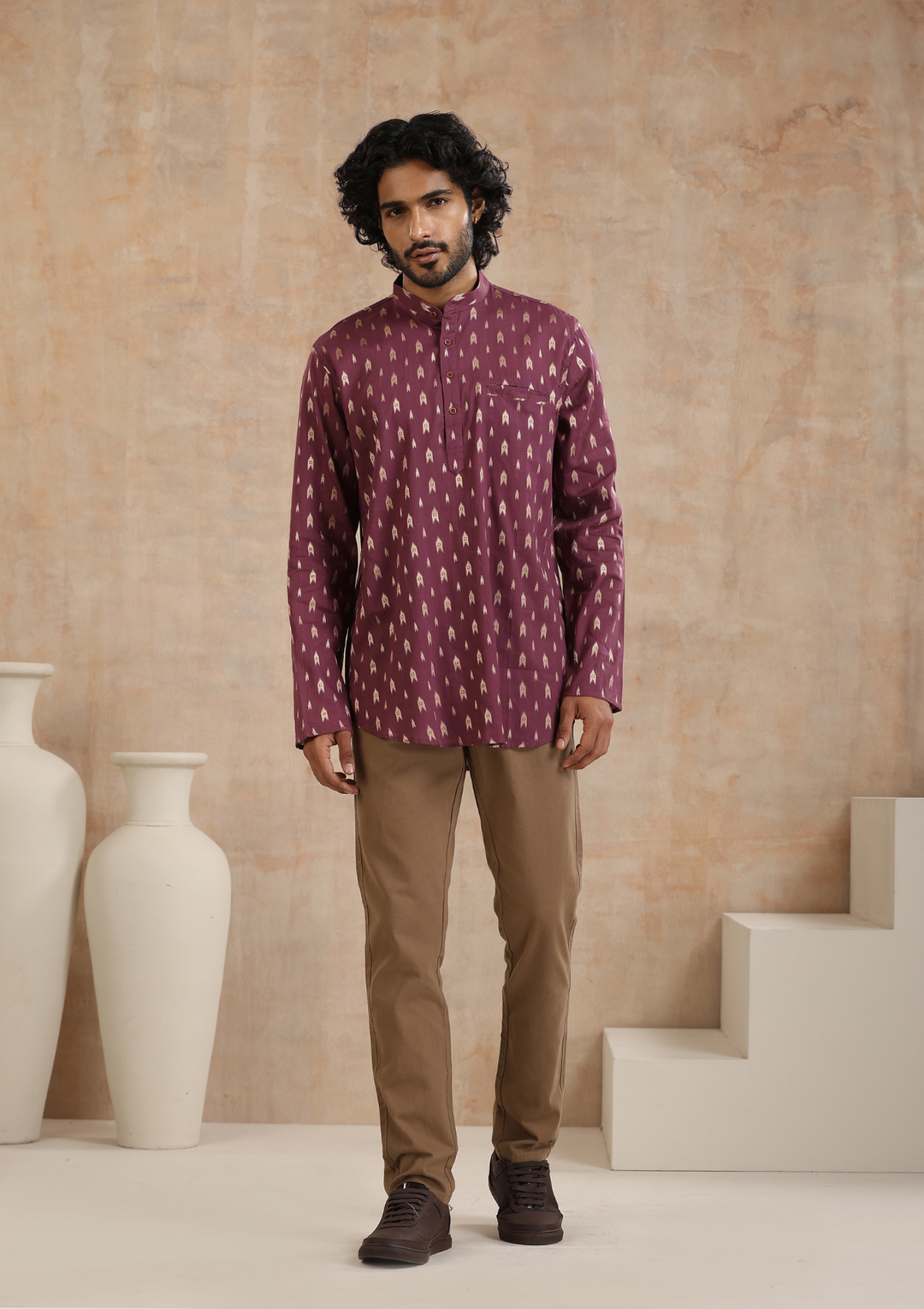 If you are looking for a festive kurta that you can wear for the haldi ceremony or Diwali party, this mustard Cotton Jacquard Solid Men's Short Kurta is perfect for you. The rich colour and design give a sophisticated look to this embroidered kurta for men. You can pair it with beige trousers and brown loafers. Instead of wearing knee-length kurta for men, go for short kurtas because they have a modern look, which is perfect for the Diwali vibe.