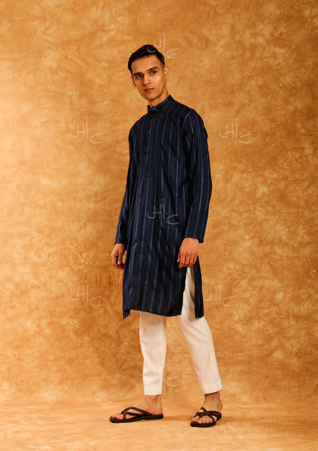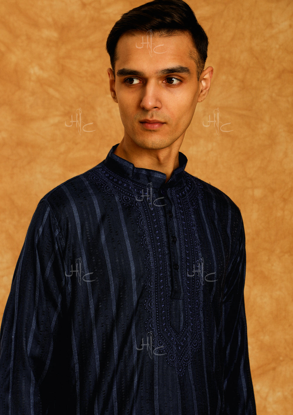HOC Rayon Embroidered With Sequins Solid Men's Long Kurta- Navy Blue