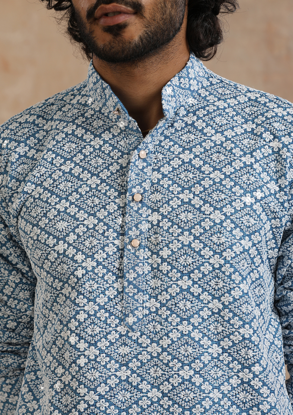 HOC Rayon Embroidered With Sequins Solid Men's Long Kurta- Aqua Blue
