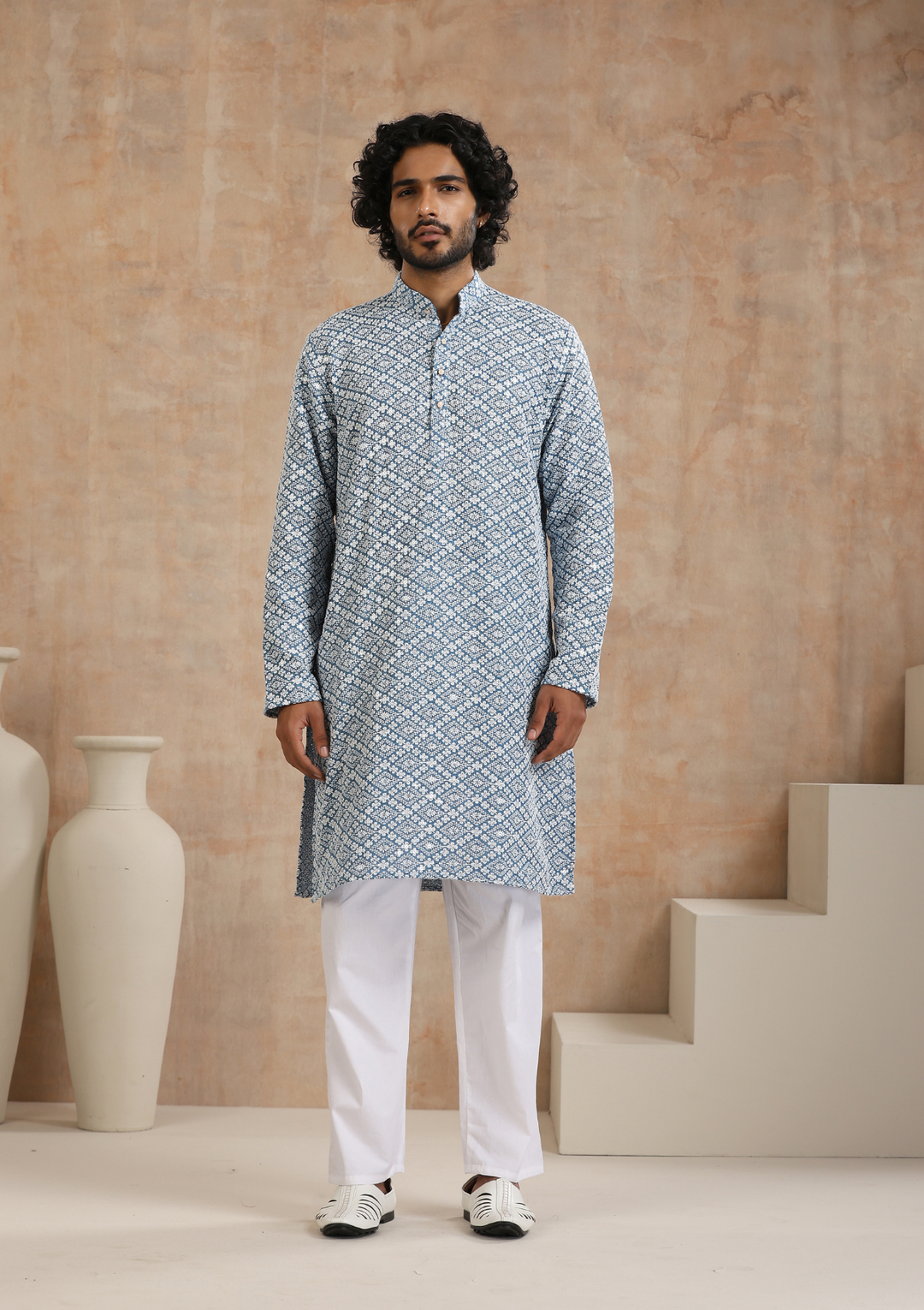 HOC Dobby Textured Solid Men's Long Kurta - Powder Blue