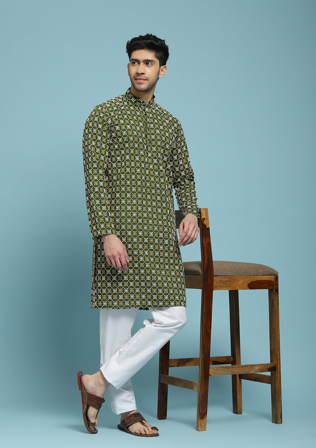 HOC Rayon Schiffli Solid Men's Long Kurta- Green