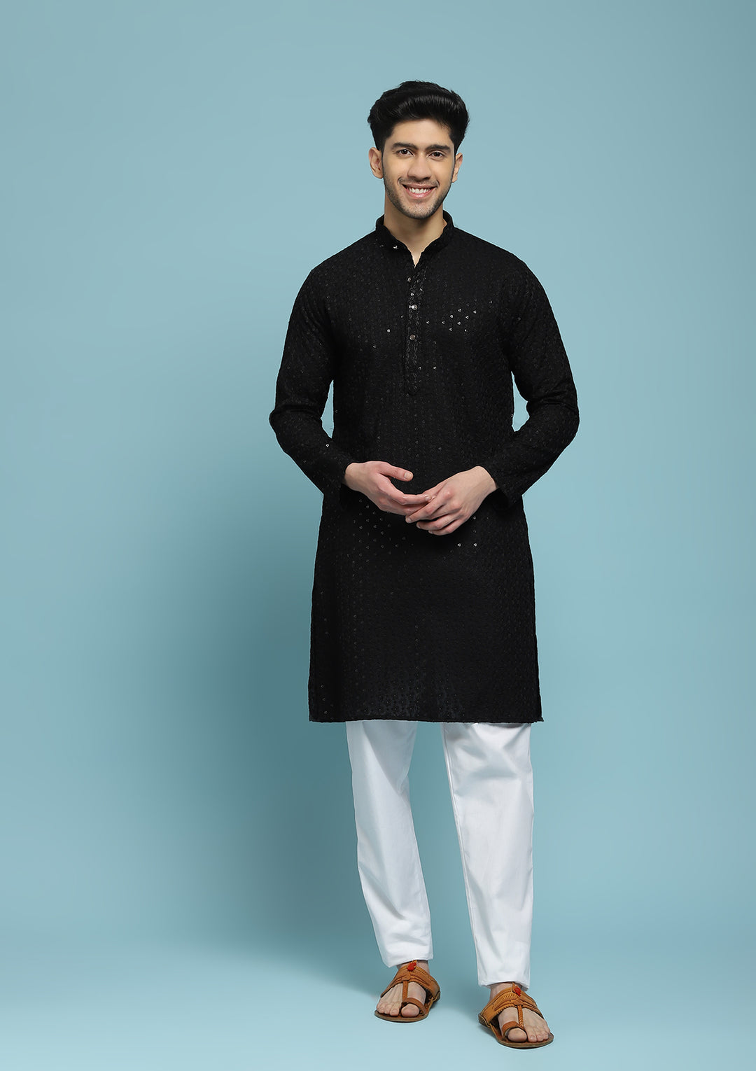 HOC Poly Silk Zari Embroidered With Sequins Solid Men's Long Kurta- Black