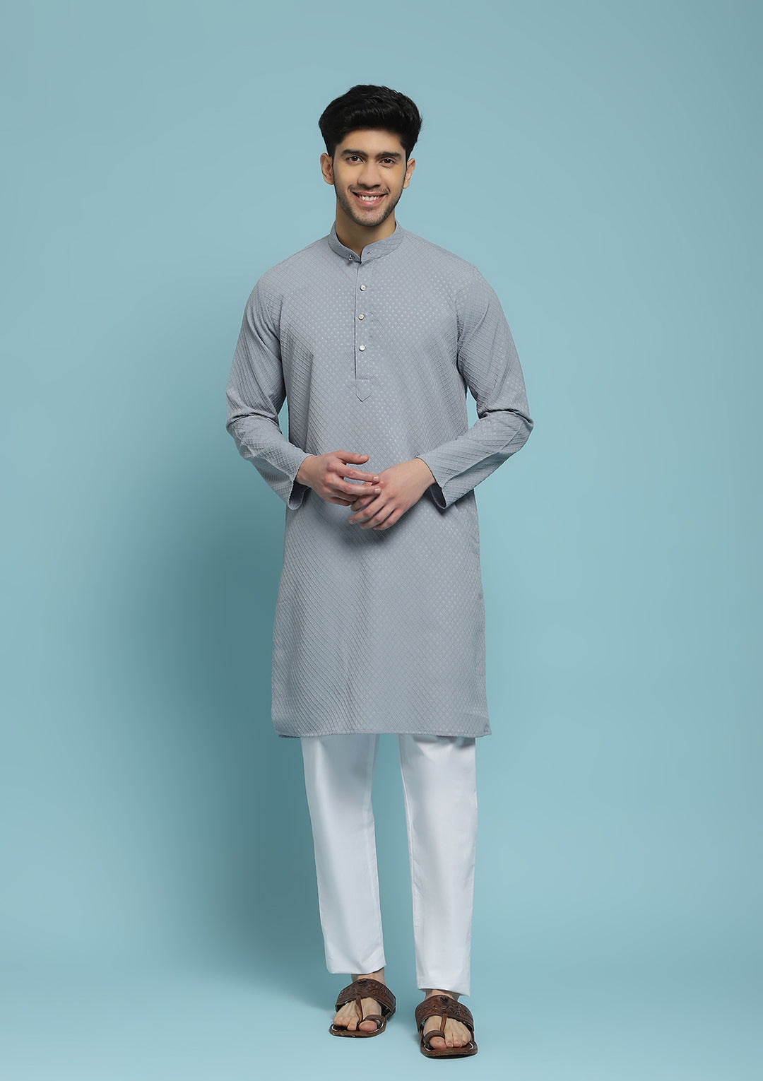 HOC Rayon Embroidered With Sequins Solid Men's Long Kurta- Light Grey