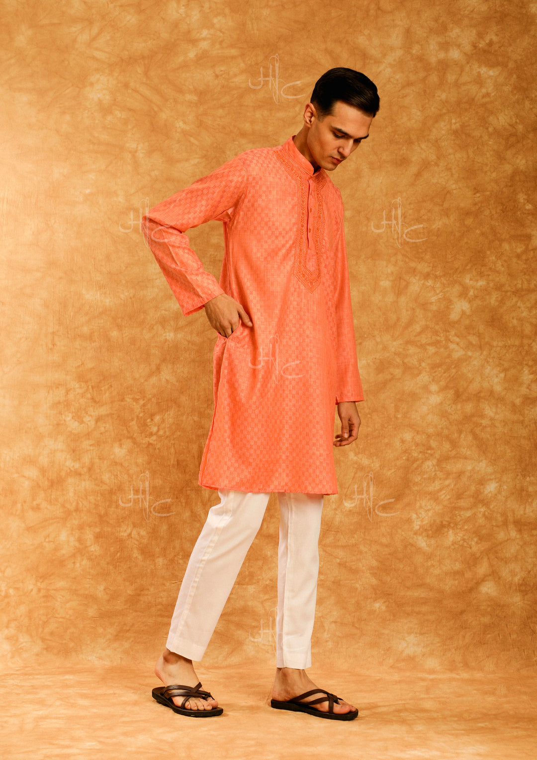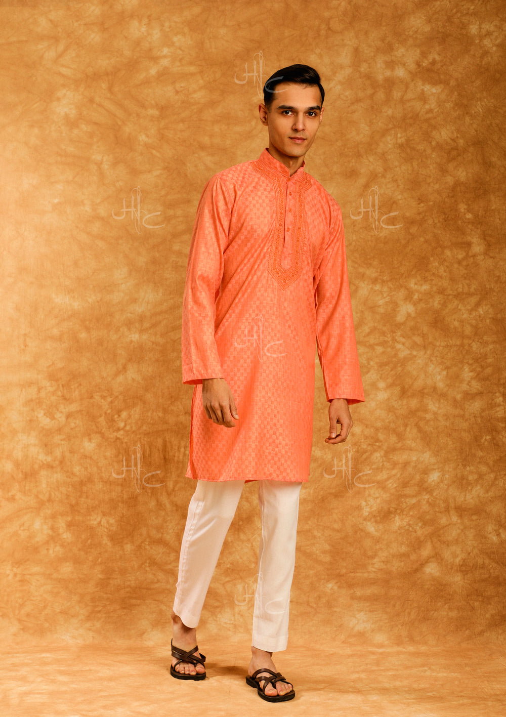 HOC Rayon Embroidered With Sequins Solid Men's Long Kurta- Peach