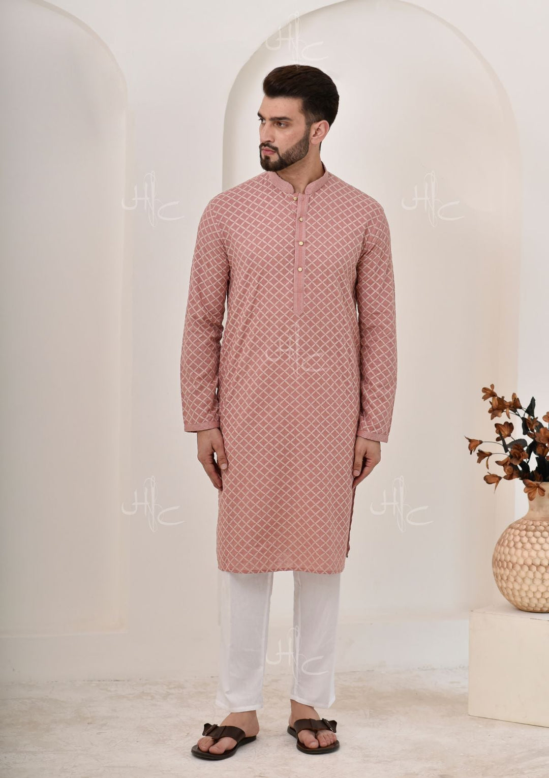 HOC Rayon Embroidered With Sequins Solid Men's Long Kurta- Dusty Pink