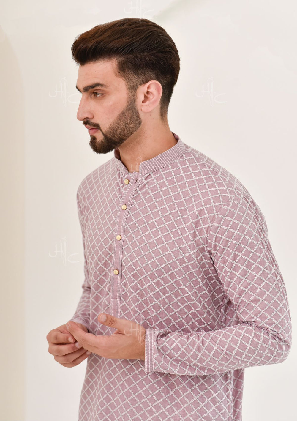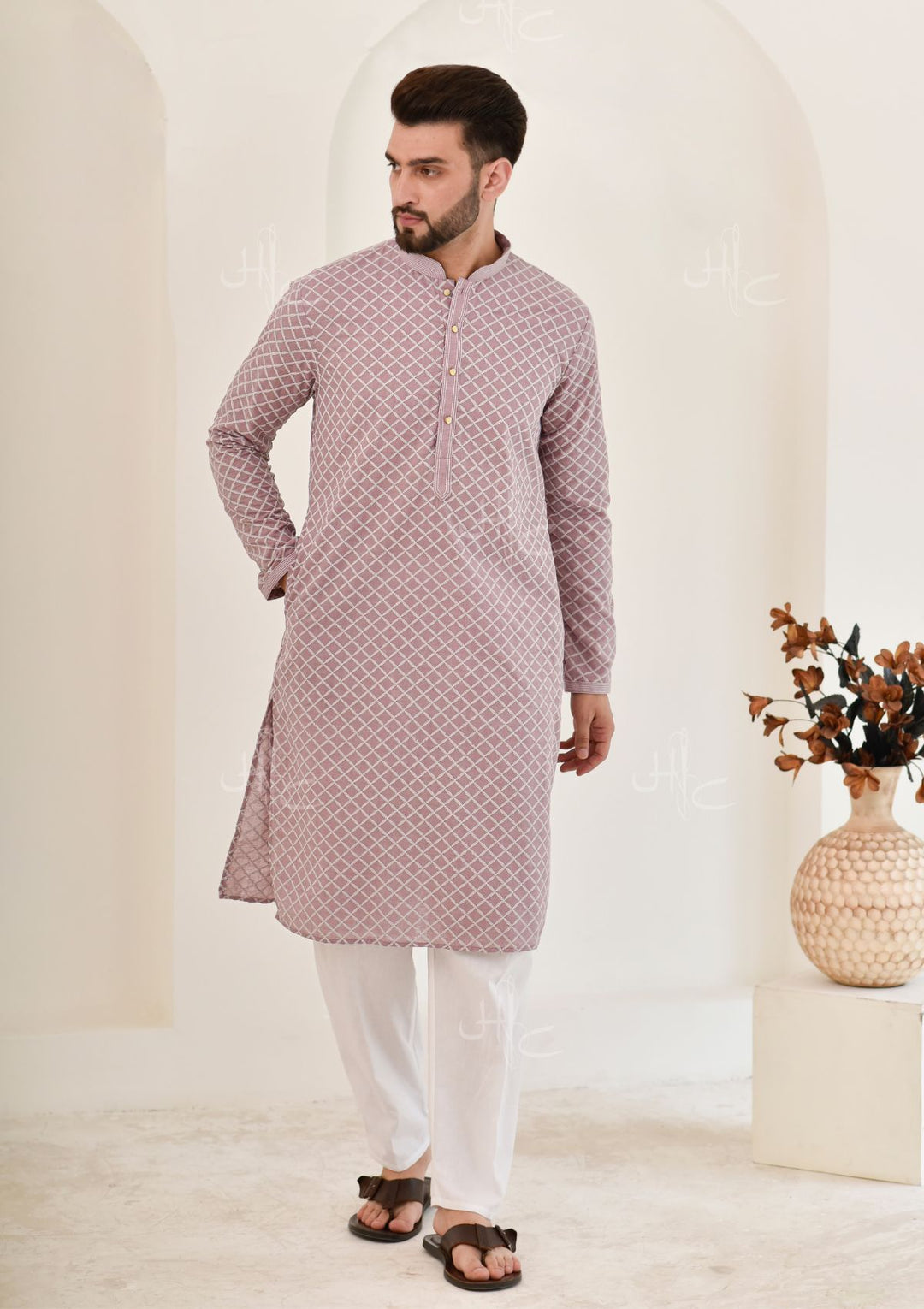 HOC Rayon Schiffli Solid Men's Long Kurta- Muave