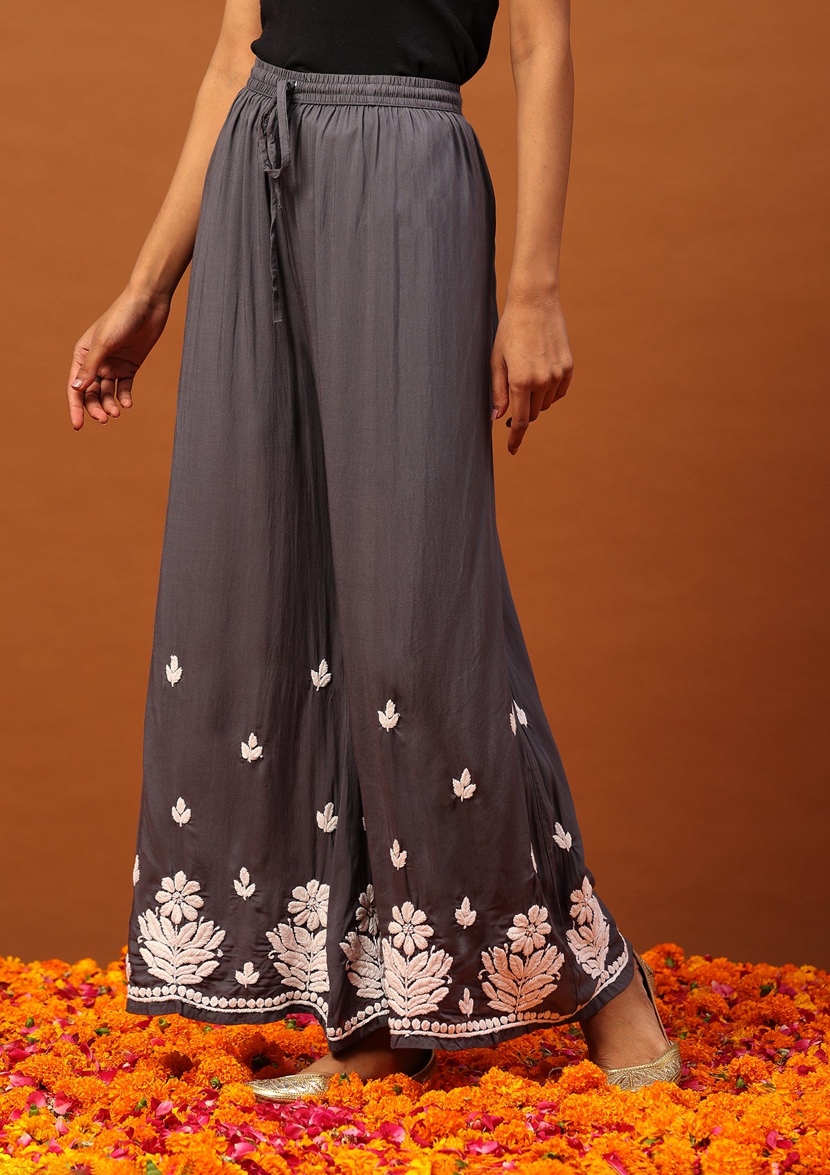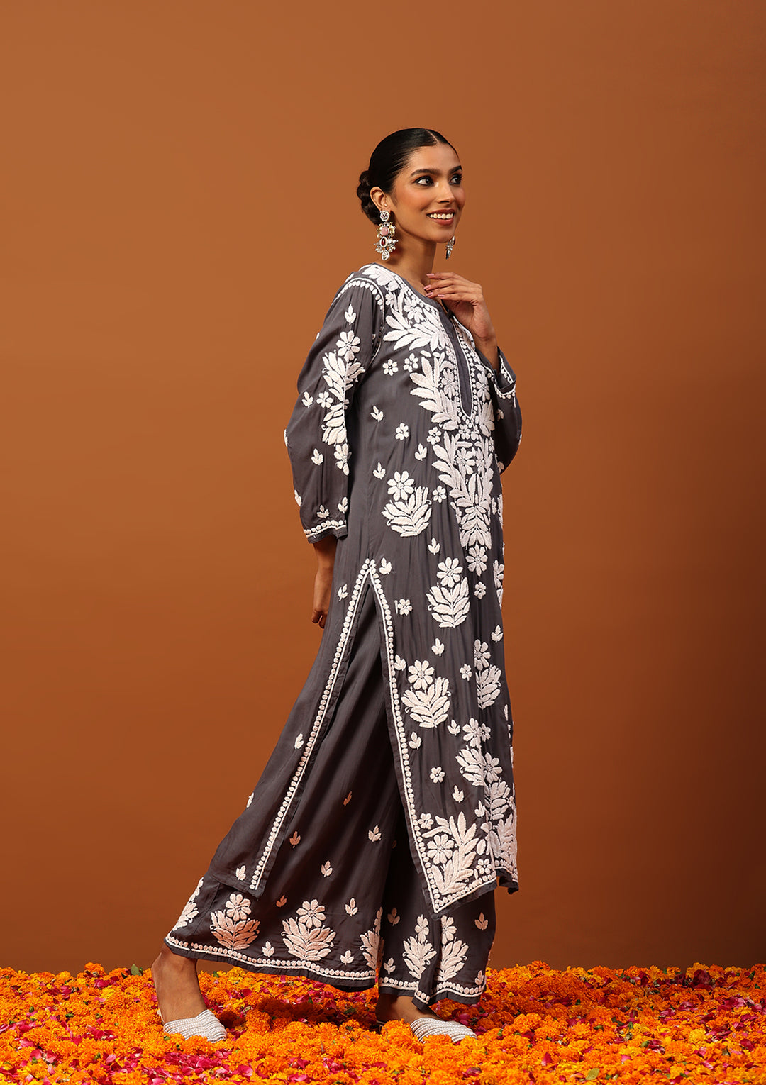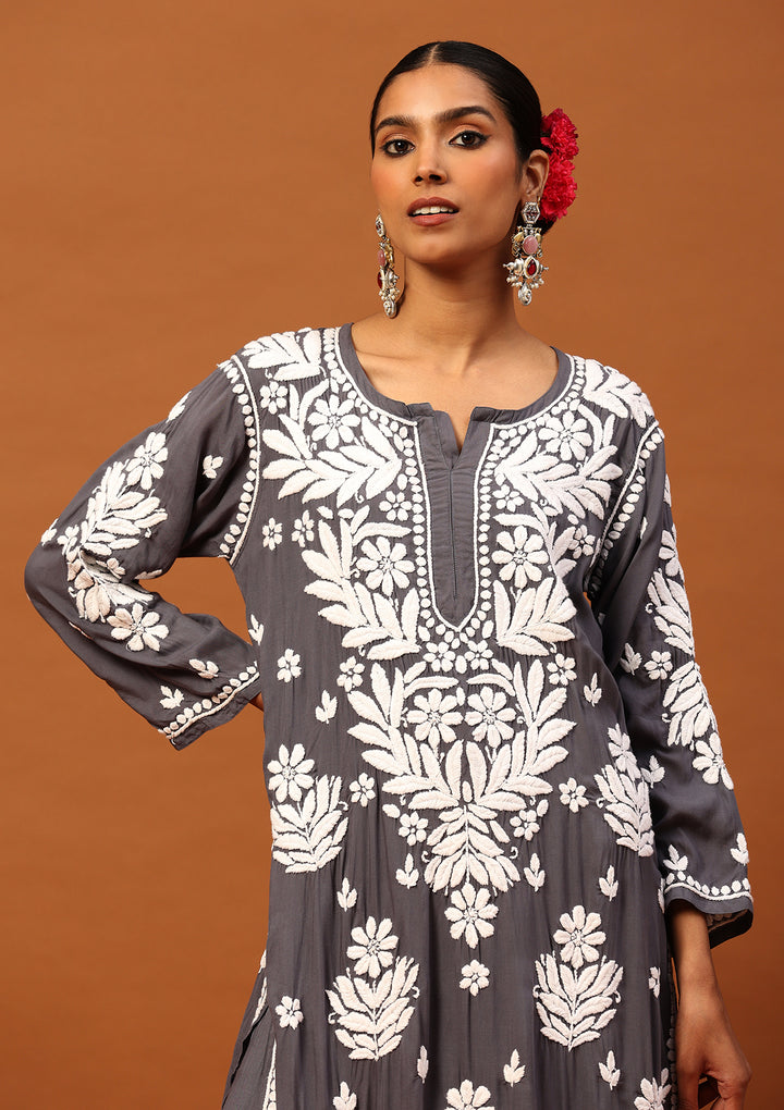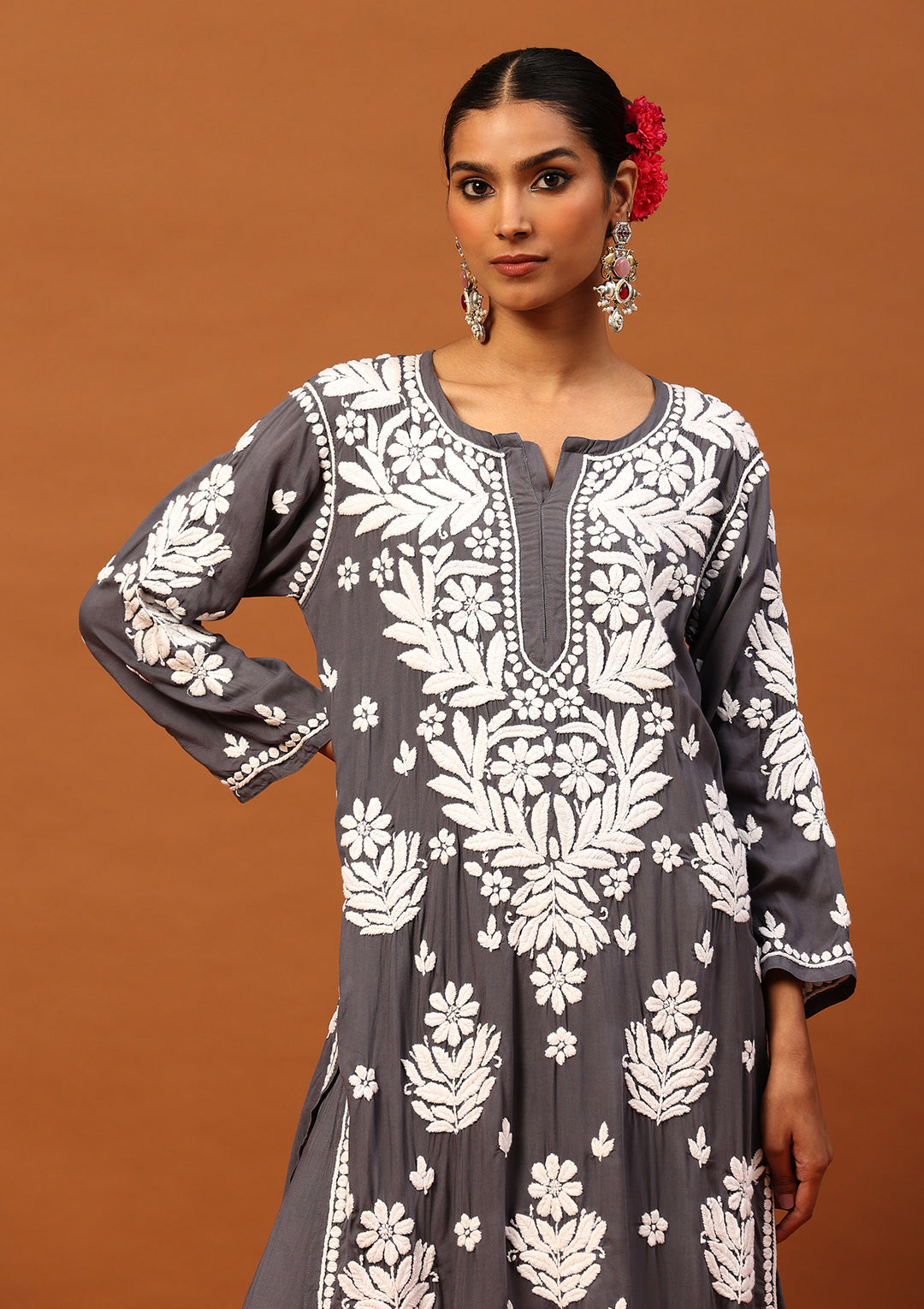 HOC Modal Chikankari Solid Women's 2 PC Long Kurta Set -Grey