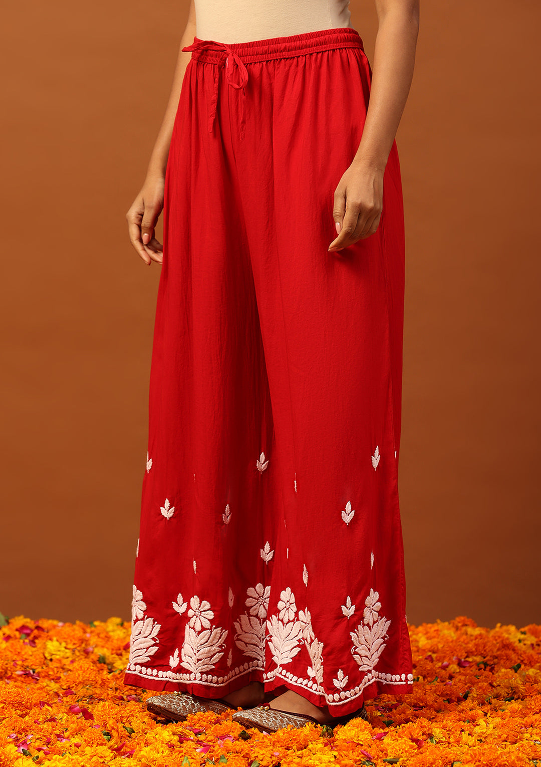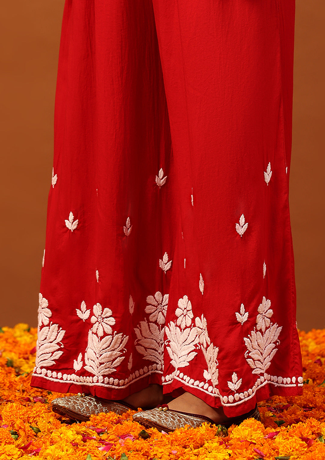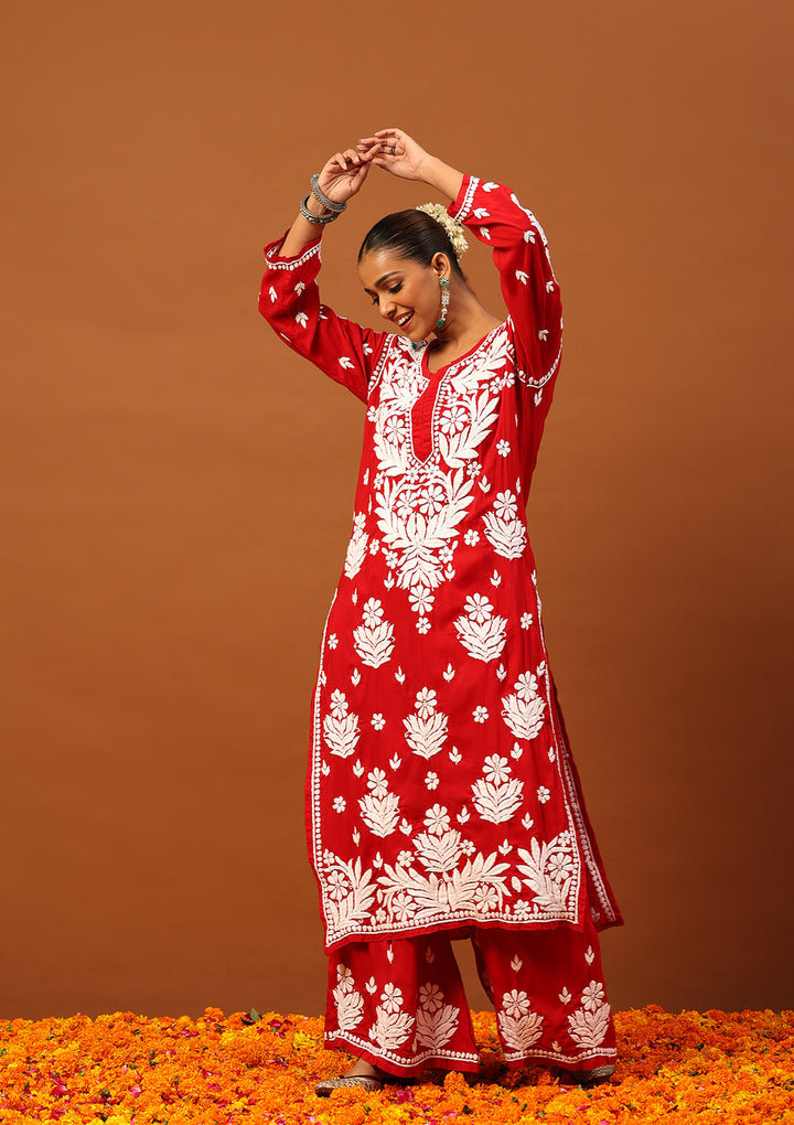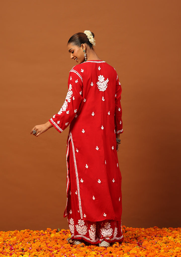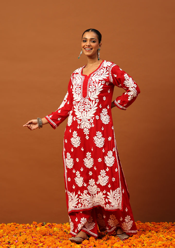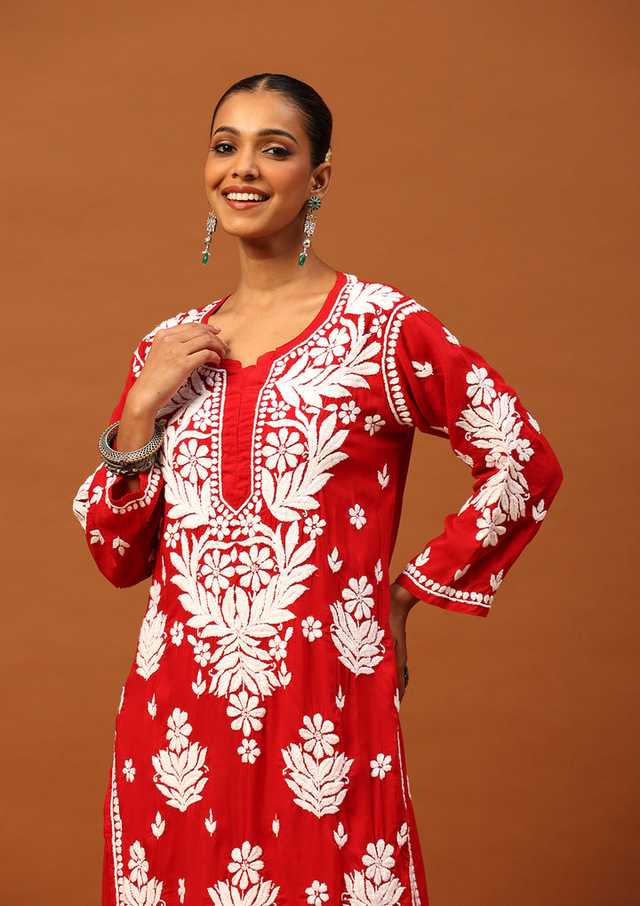 HOC Modal Chikankari Solid Women's 2 PC Long Kurta Set -Red