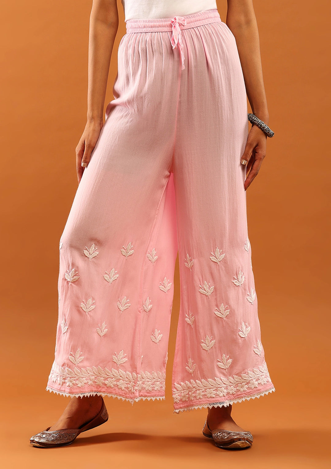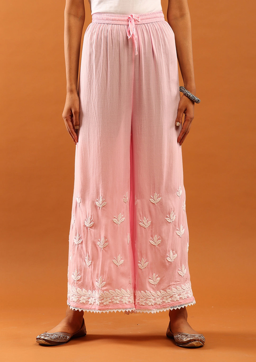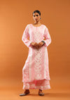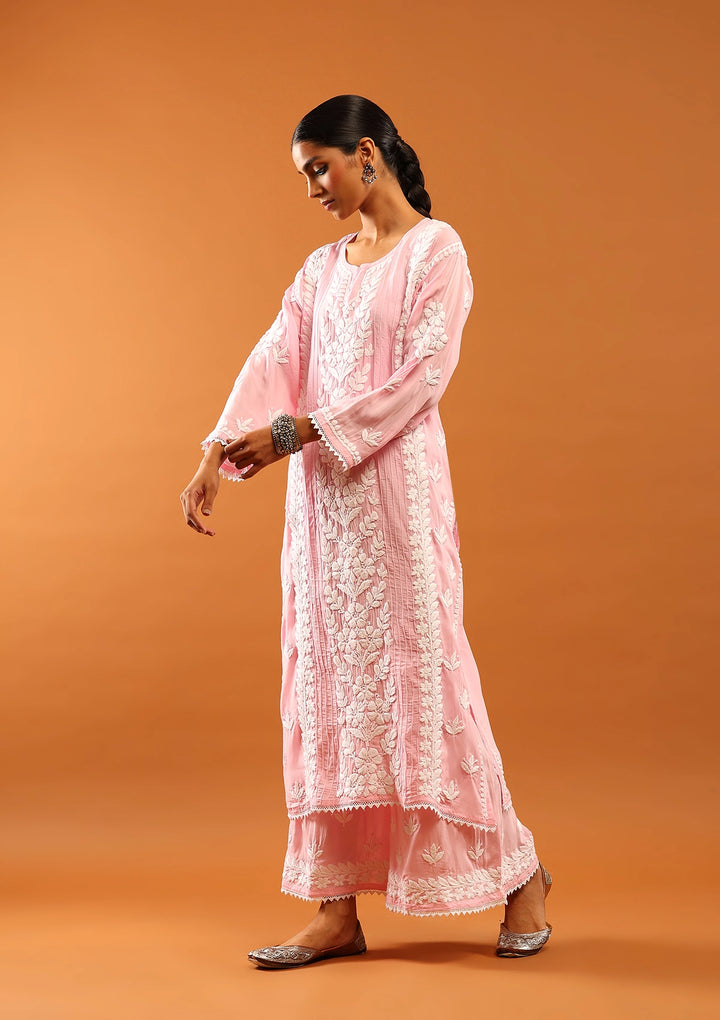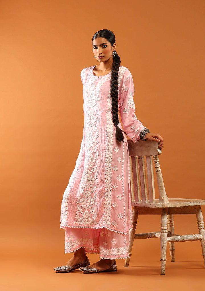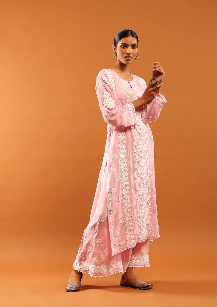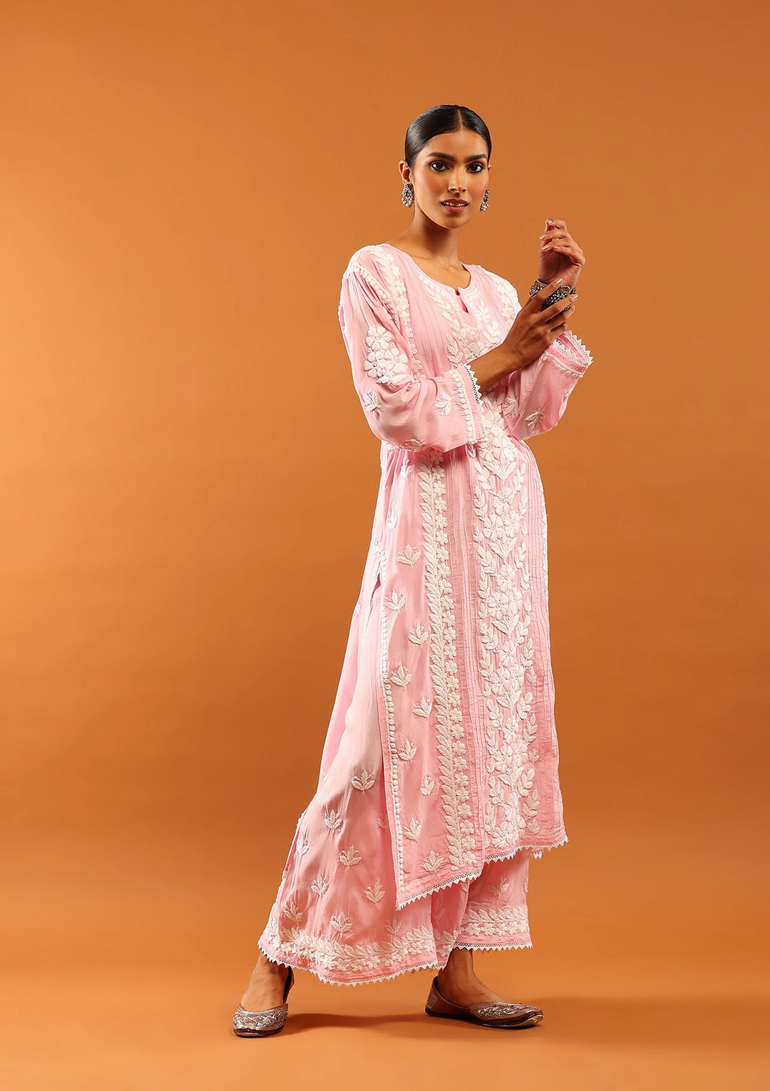HOC Modal Chikankari Solid Women's 2 PC Long Kurta Set With Lace -Pink