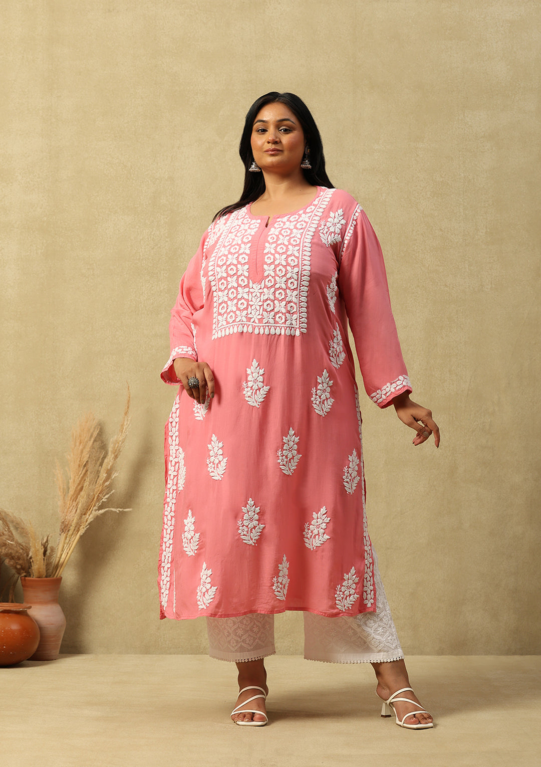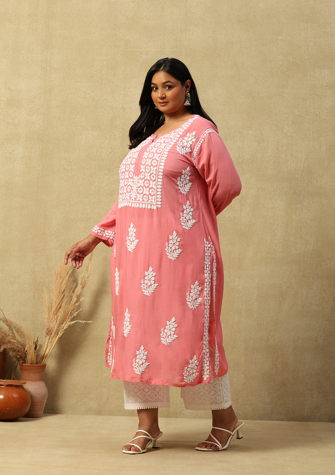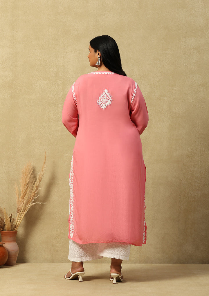 HOC Modal Chikankari Solid Women's Long Kurta -Pink