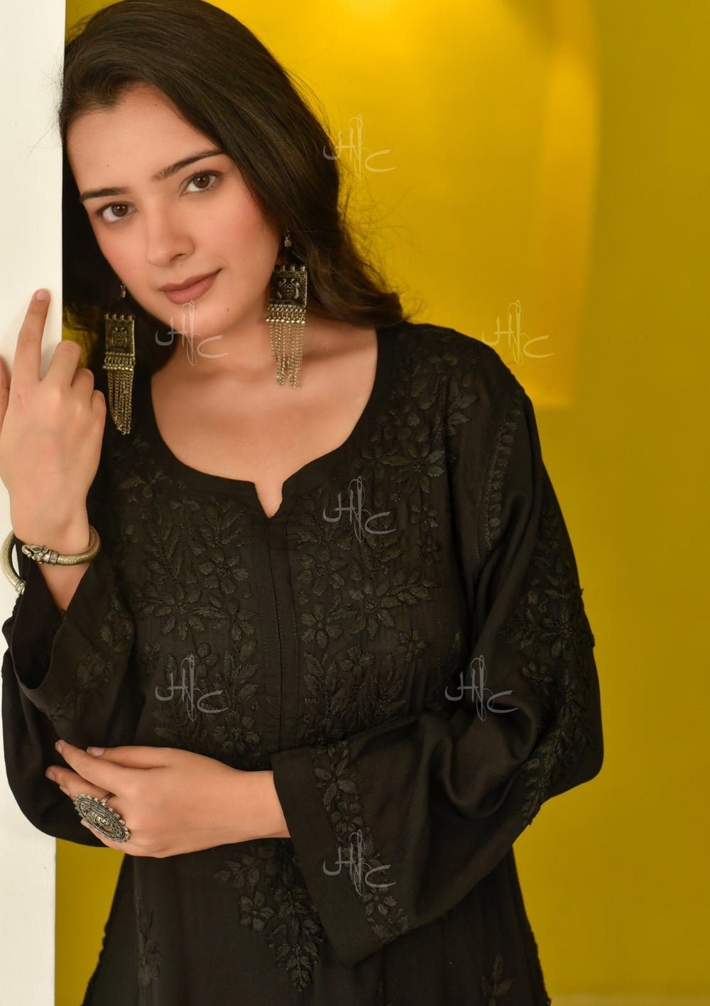HOC Modal Chikankari Solid Women's 2 PC Long Kurta Set -Black
