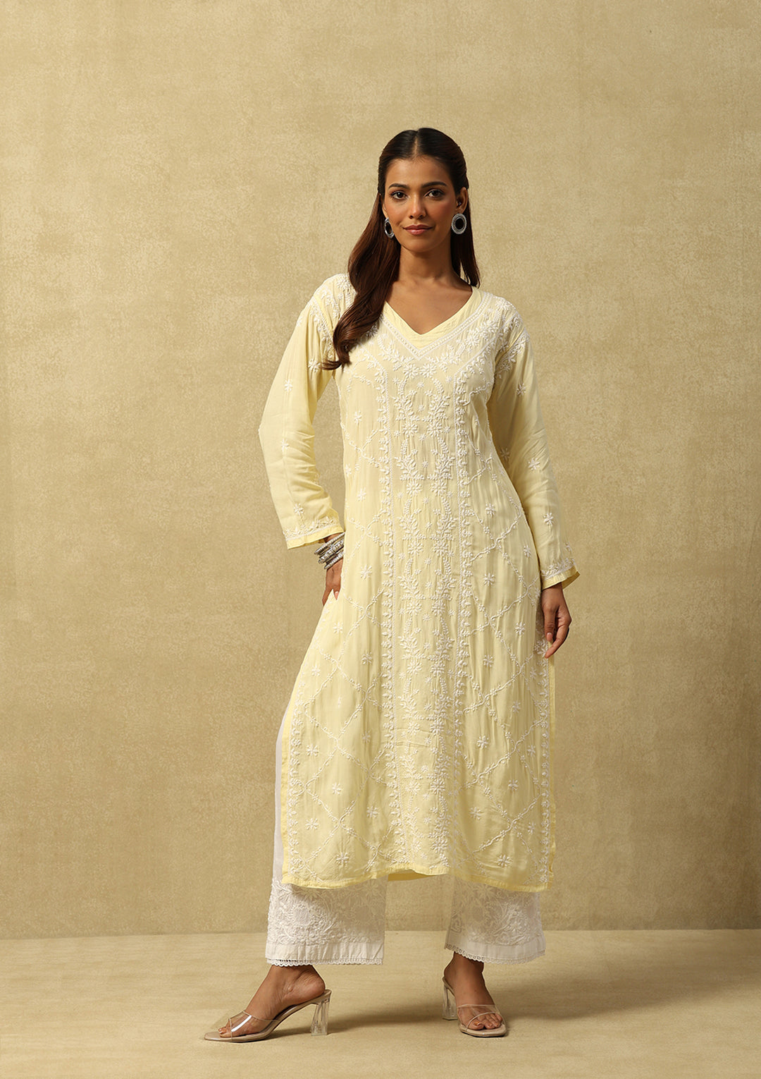 HOC Modal Chikankari Solid Women's Long Kurta -Pastel Yellow