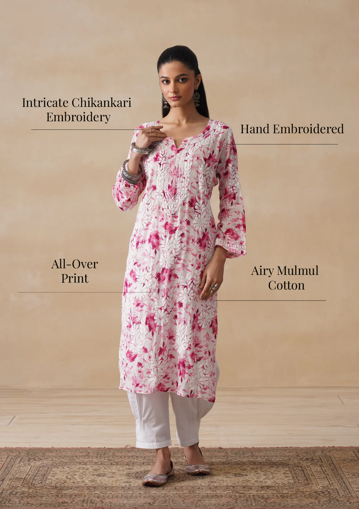 HOC Mulmul Chikankari Printed Women's Long Kurta - Pink