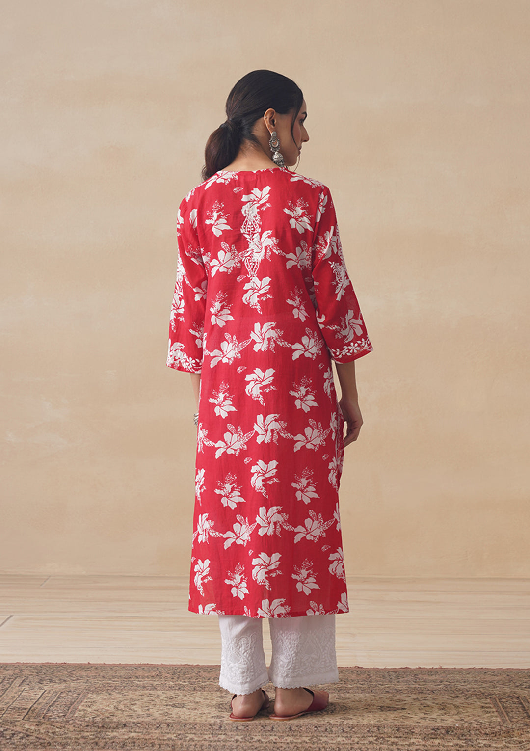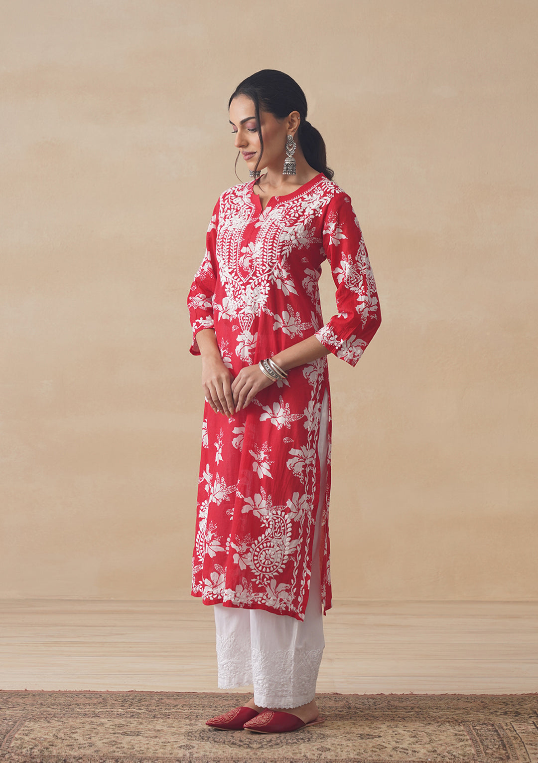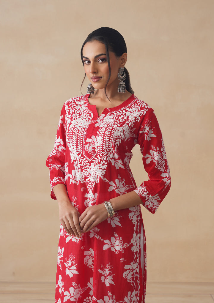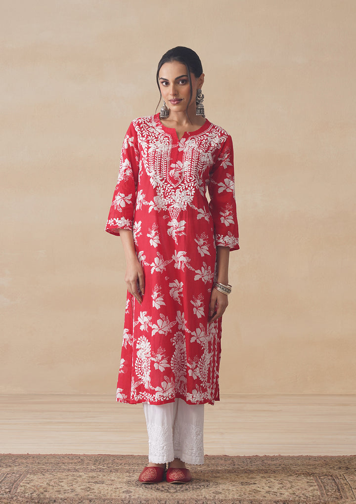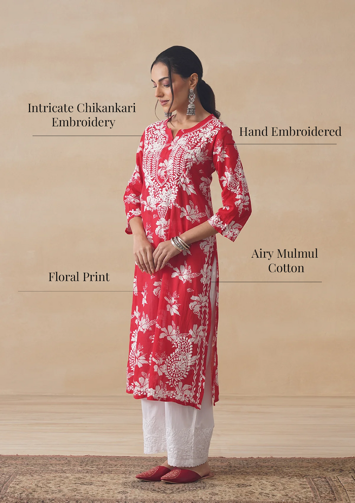 HOC Tamara Mulmul Chikankari Printed Women's Straight Kurta - Red