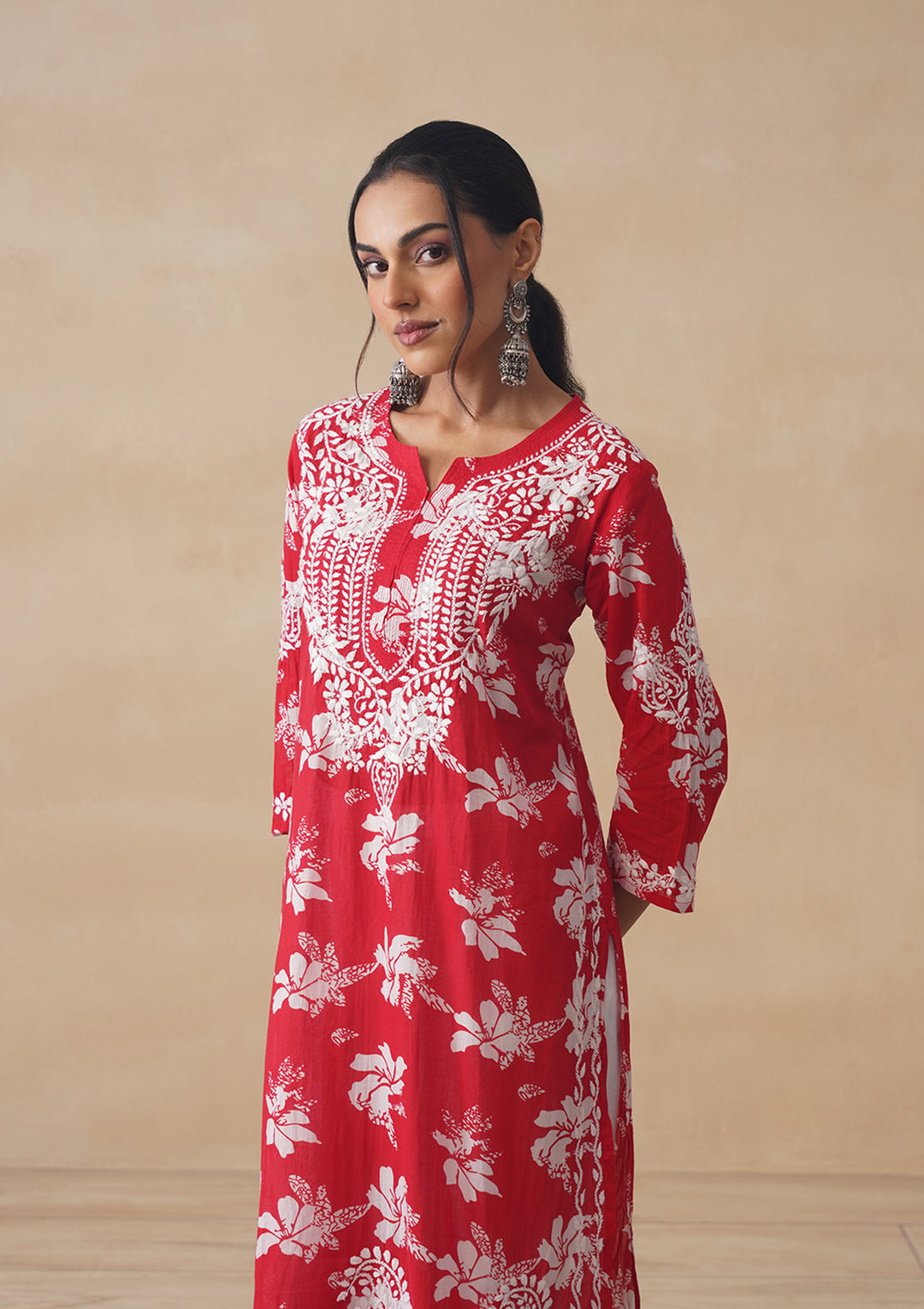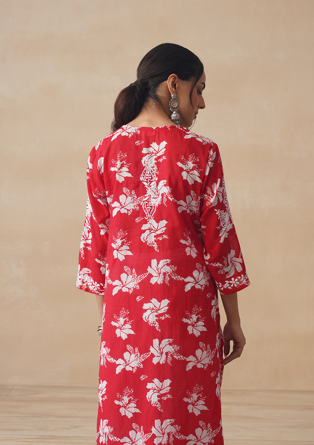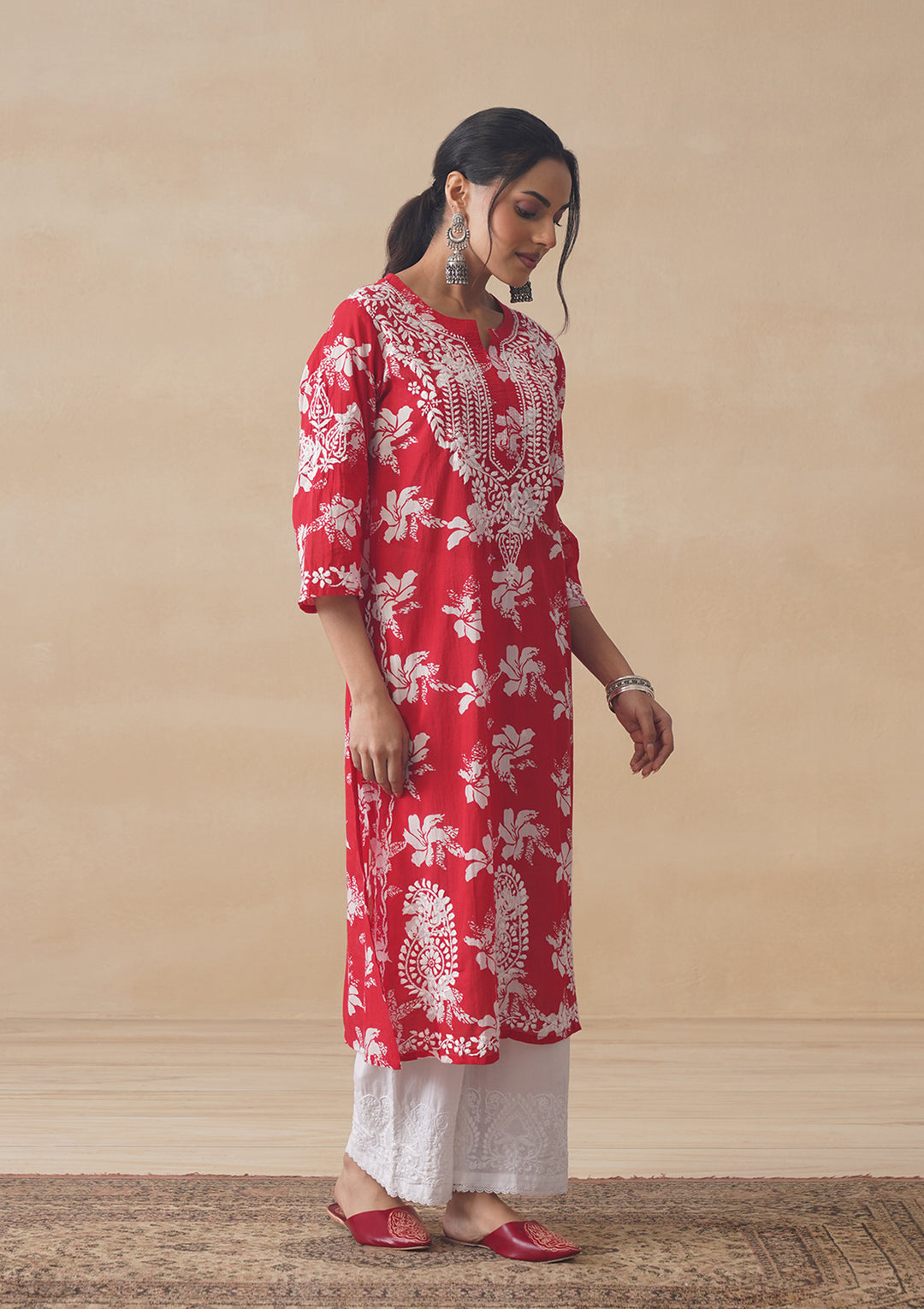 HOC Tamara Mulmul Chikankari Printed Women's Straight Kurta - Red