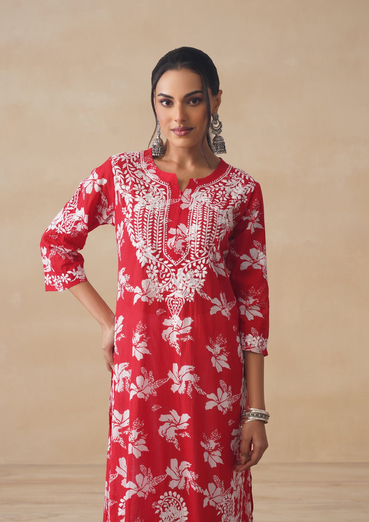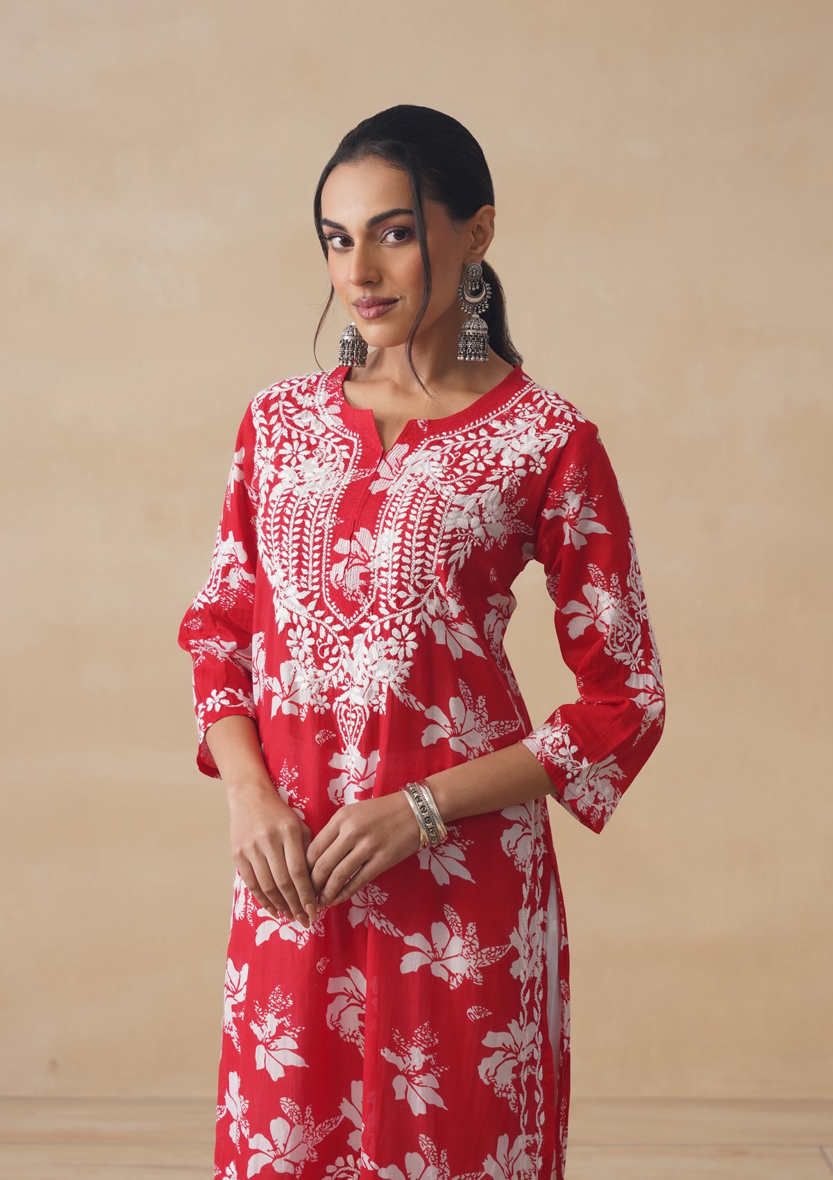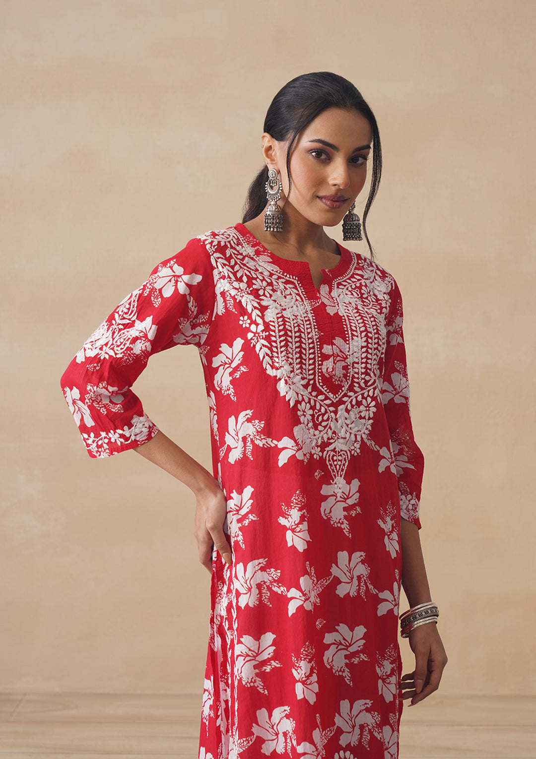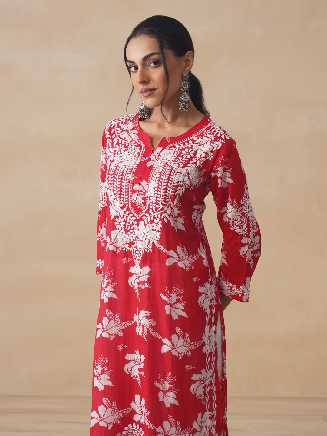 HOC Tamara Mulmul Chikankari Printed Women's Straight Kurta - Red