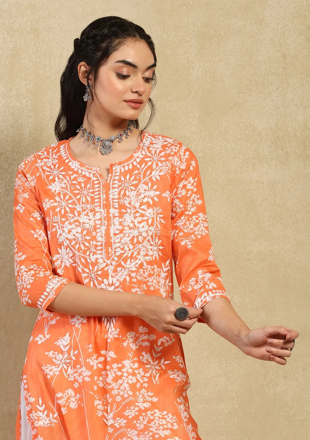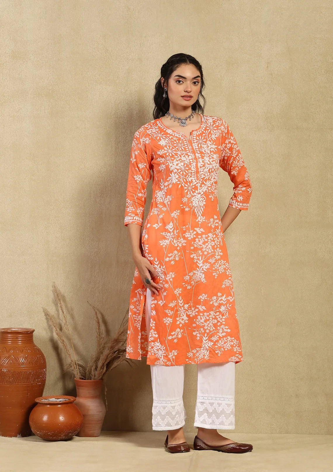 HOC Zainab Chikankari Mulmul Printed Straight Kurta -Orange