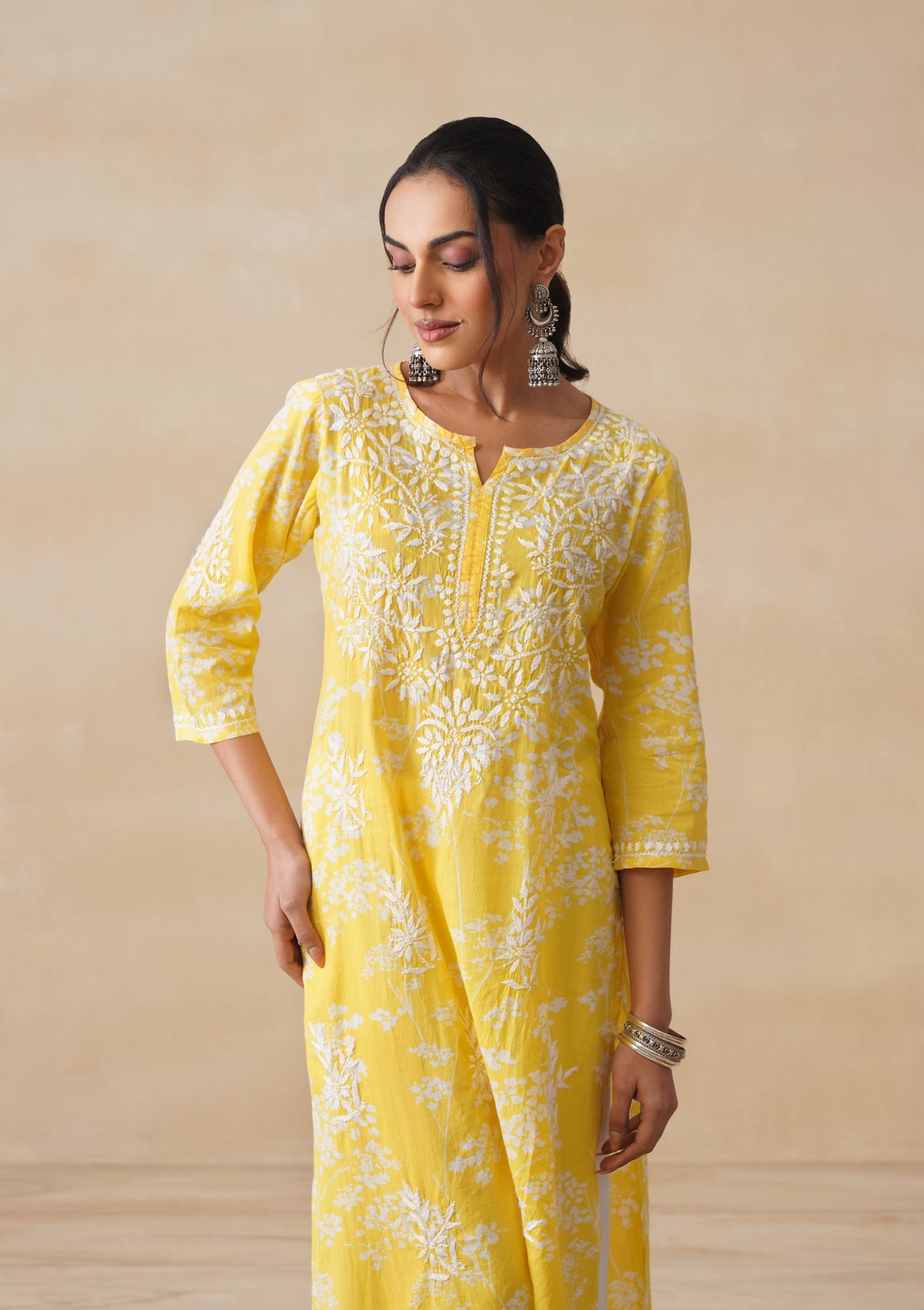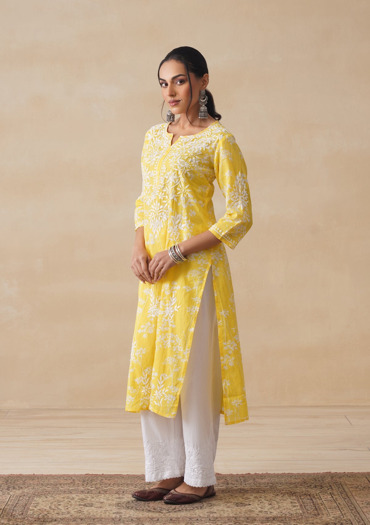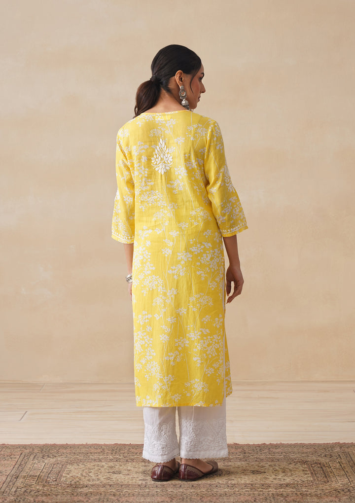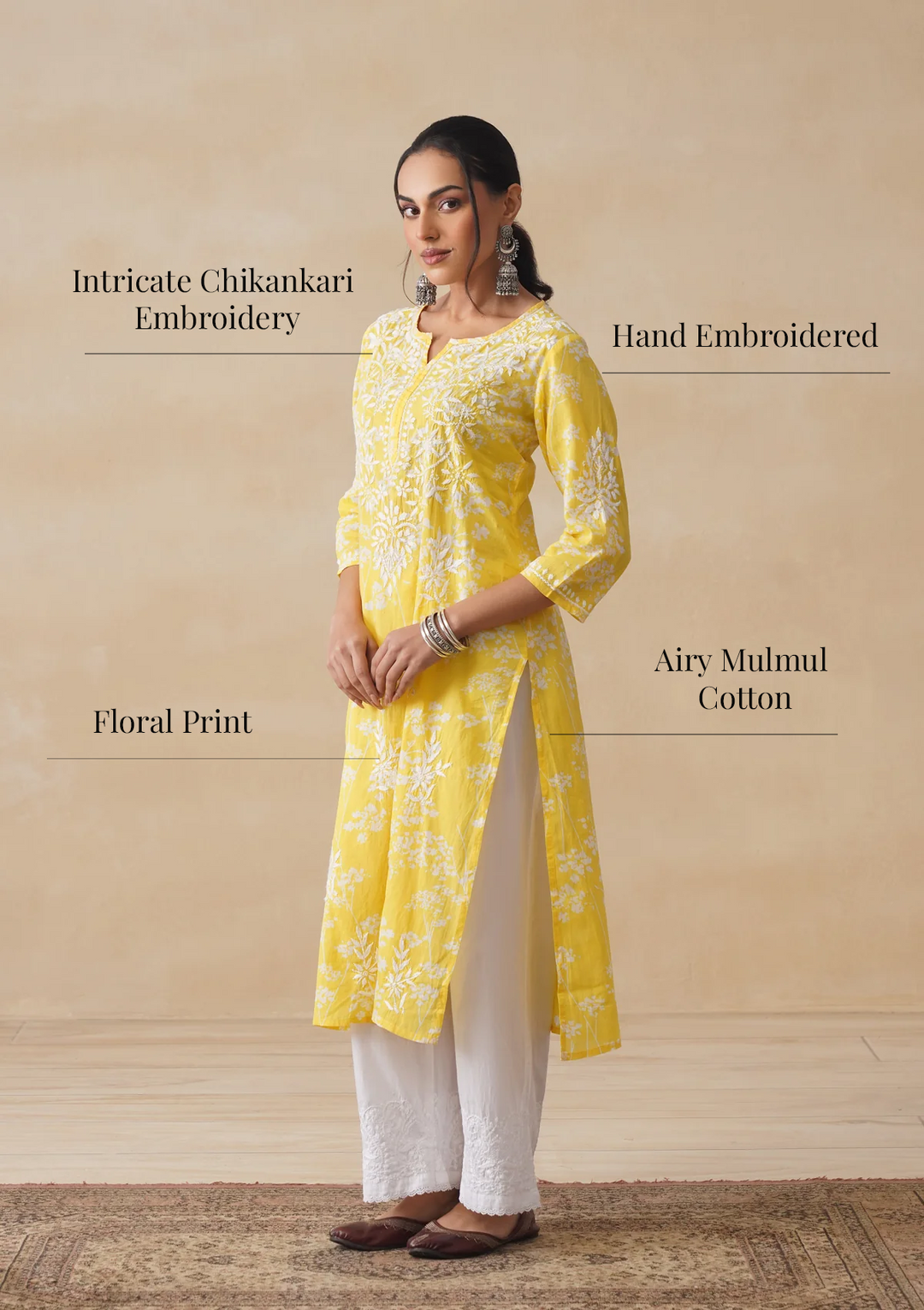 HOC Zainab Chikankari Mulmul Printed Straight Kurta -Yellow