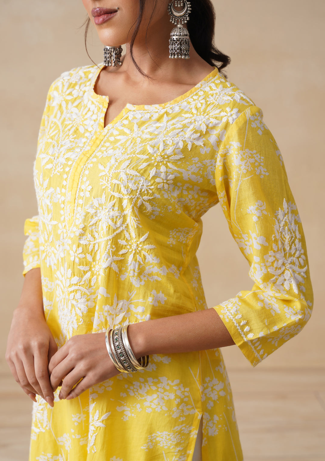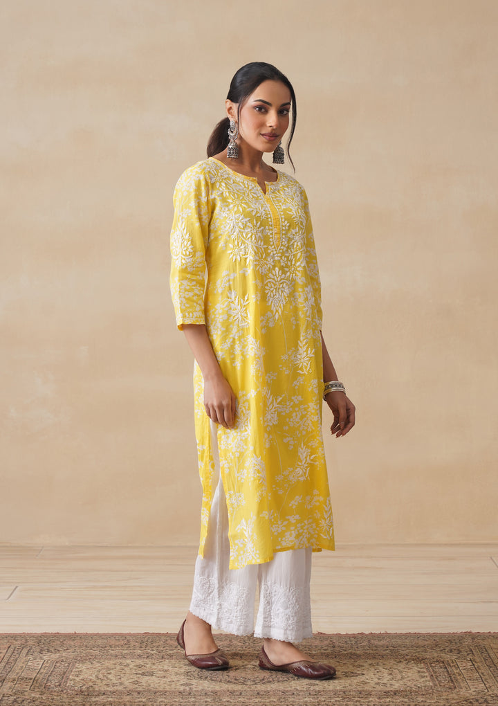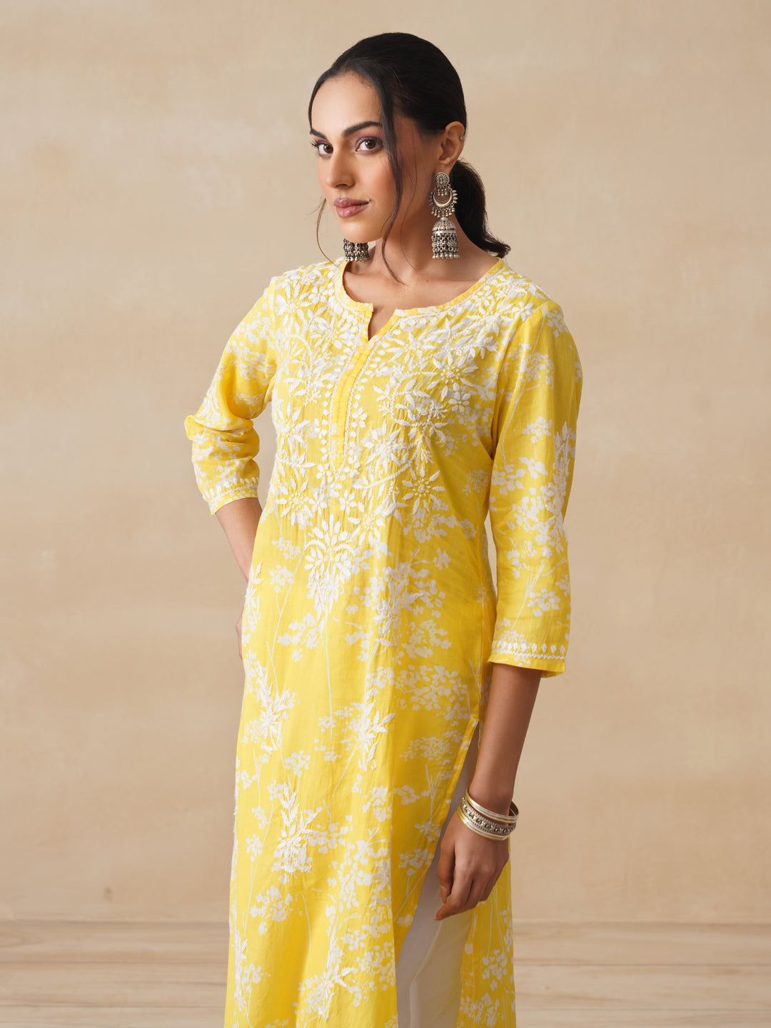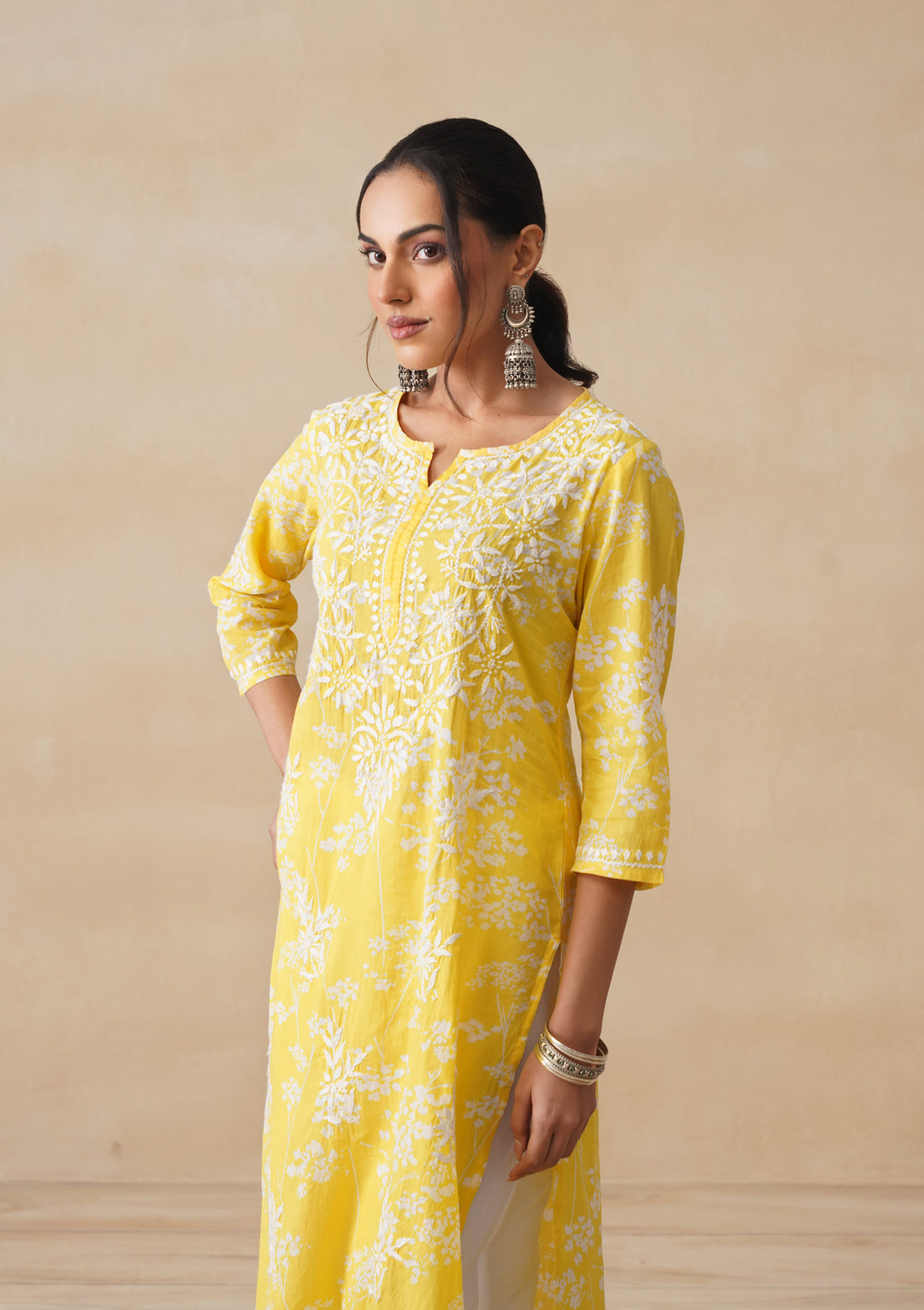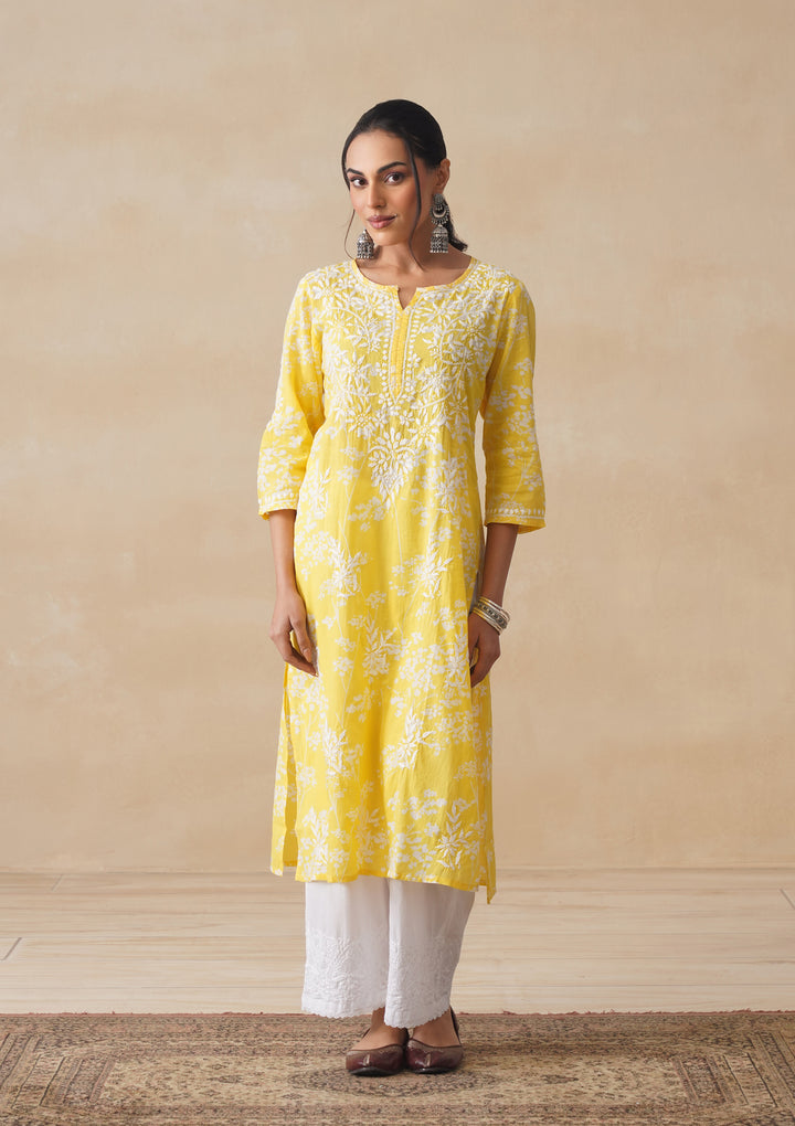 HOC Zainab Chikankari Mulmul Printed Straight Kurta -Yellow