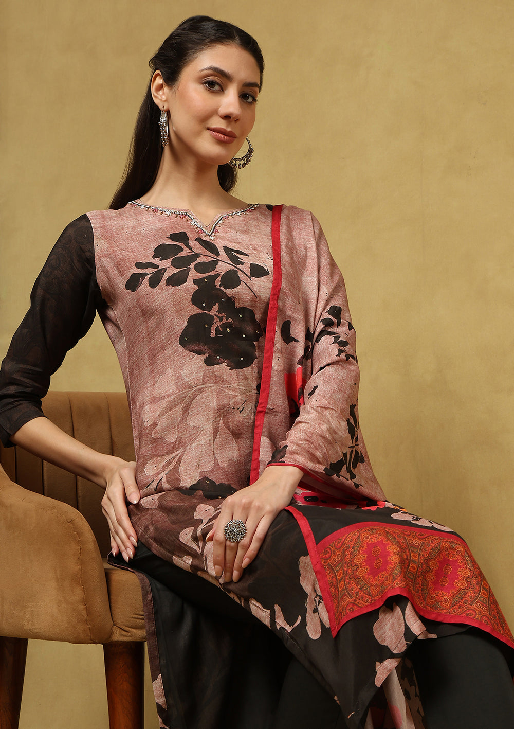 HOC Hand Embellished Muslin Printed Women's 3 PC Long Kurta Set with Dupatta - Black