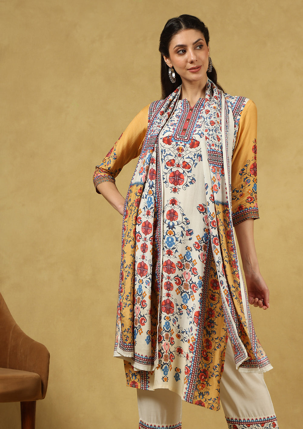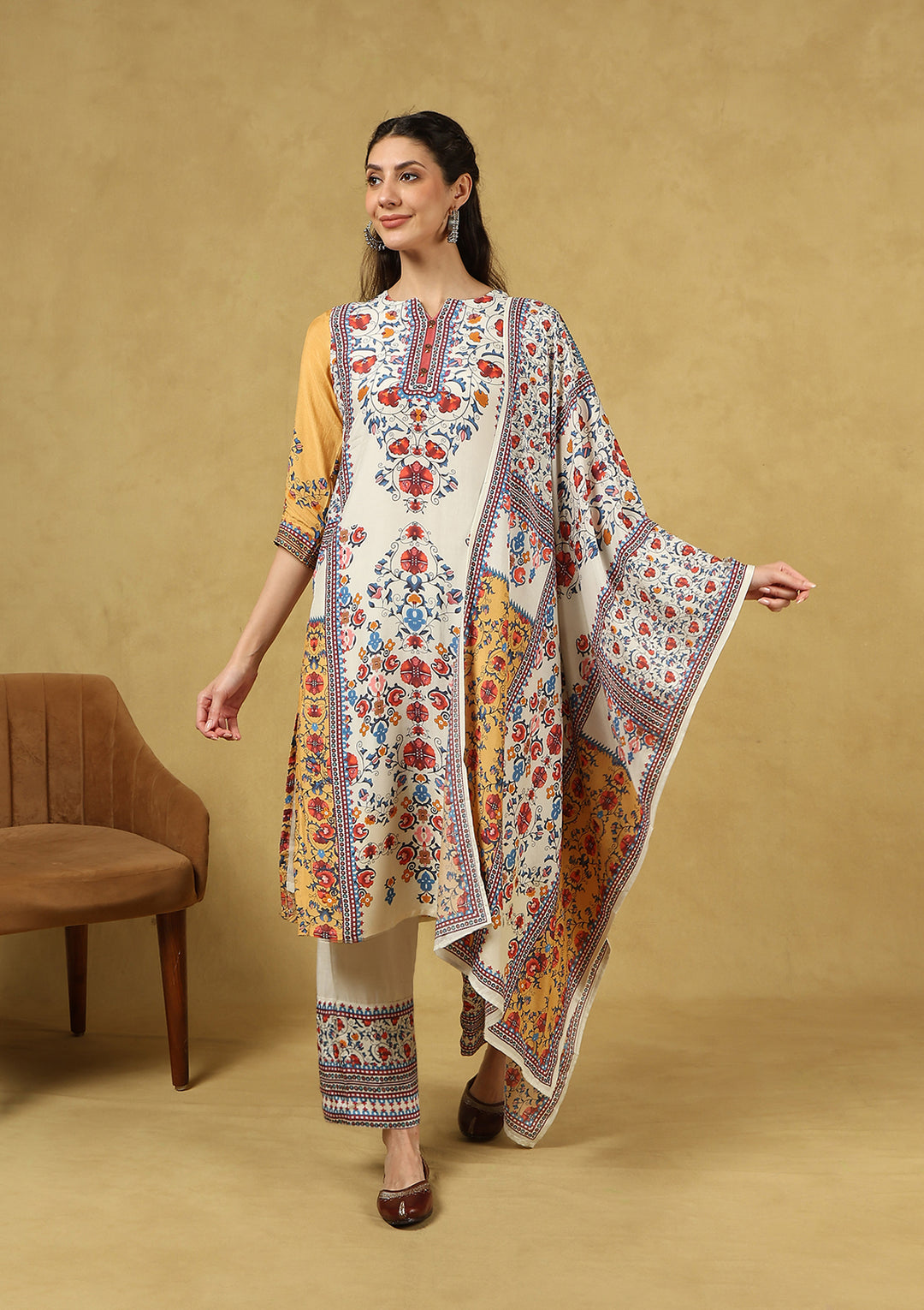 HOC Hand Embellished Muslin Printed Women's 3 PC Long Kurta Set with Dupatta - Grey