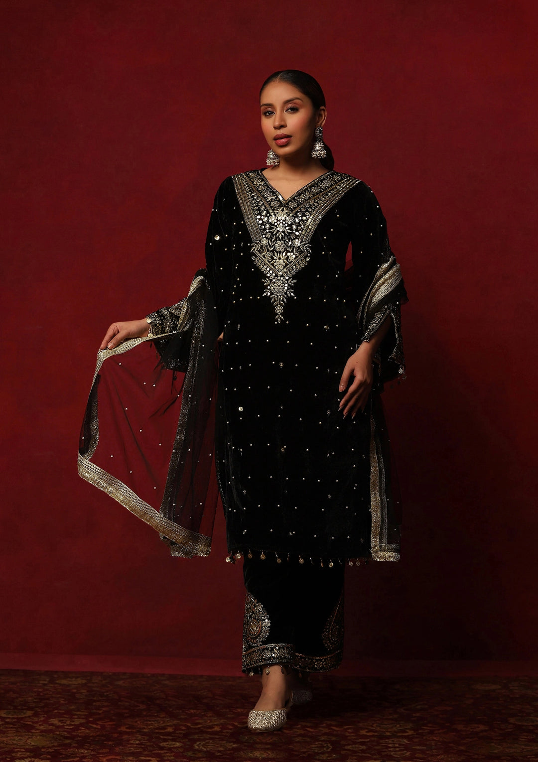 HOC Velvet Zari & Sequin Solid Women's 3 Pc Long Kurta Set-Black
