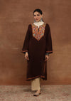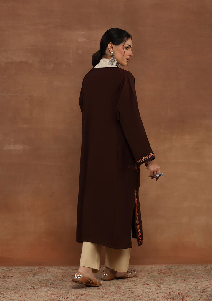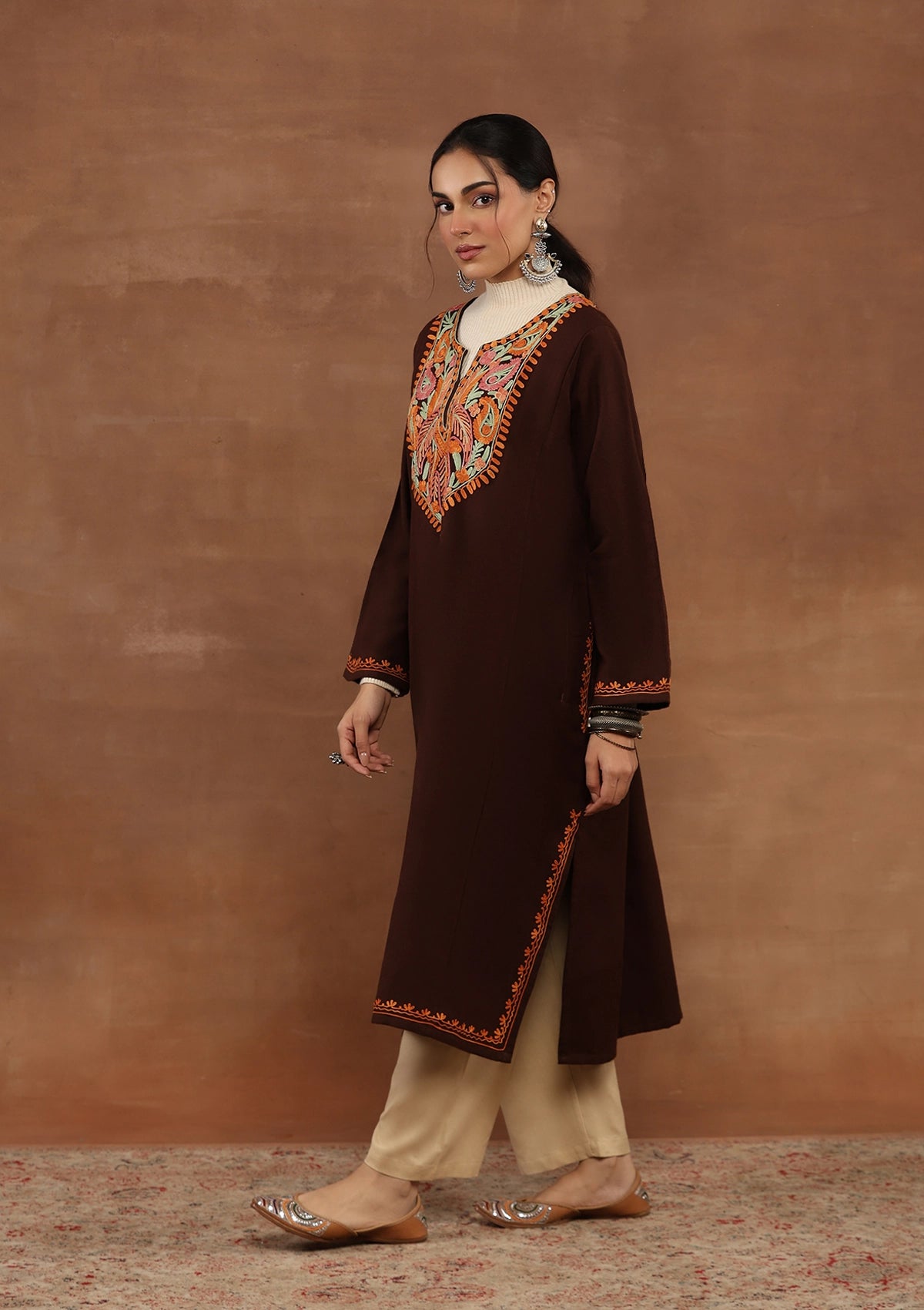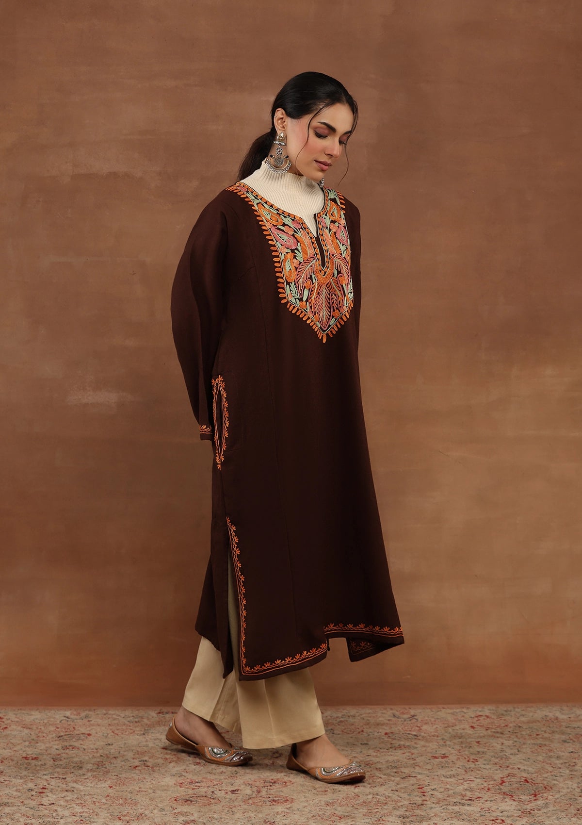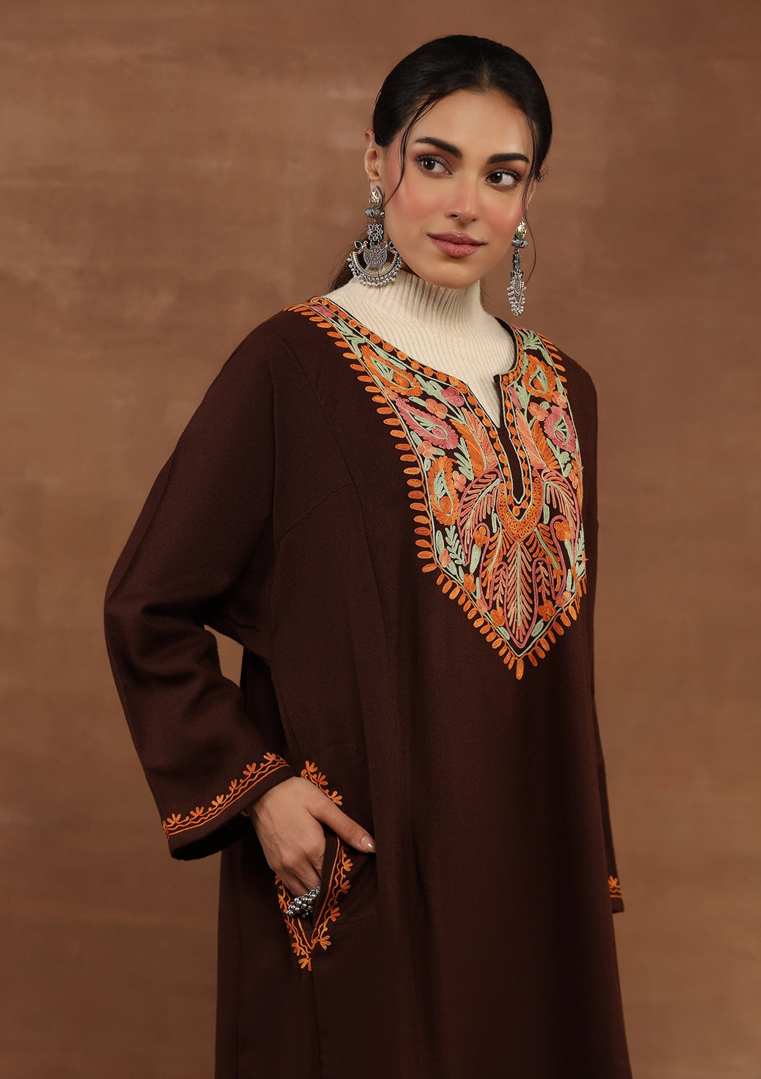 HOC Kashmiri Wool Aari Embroidered Solid Women's Phiran Kurta -Brown