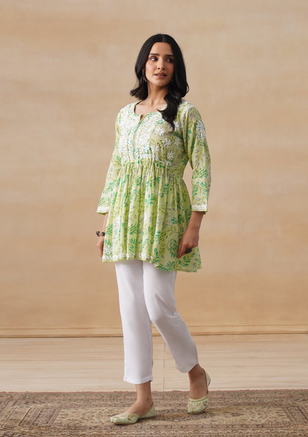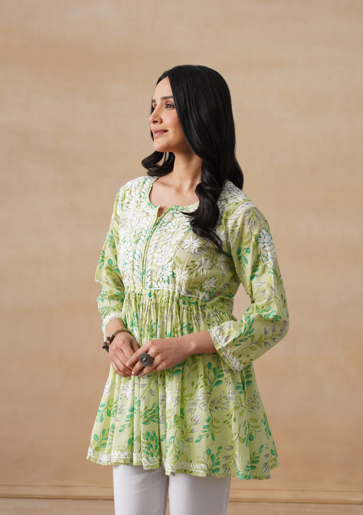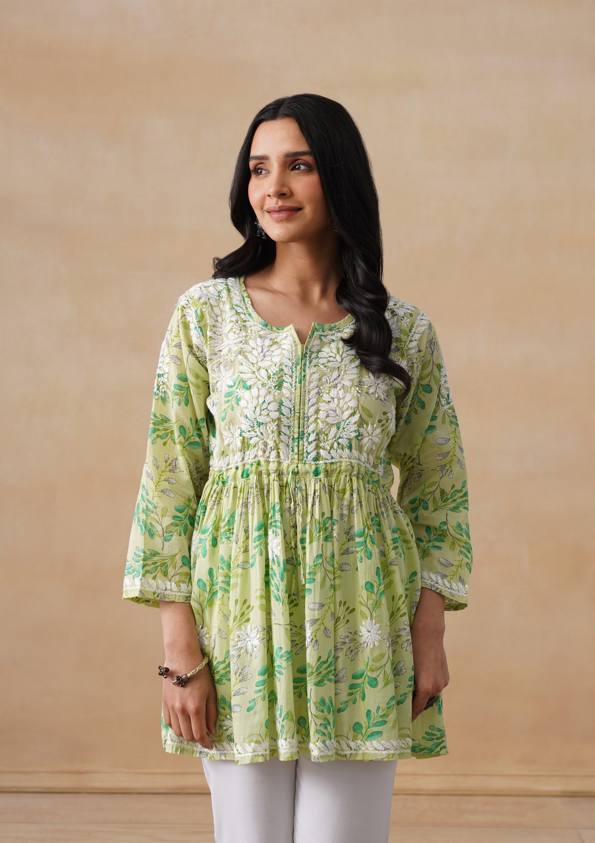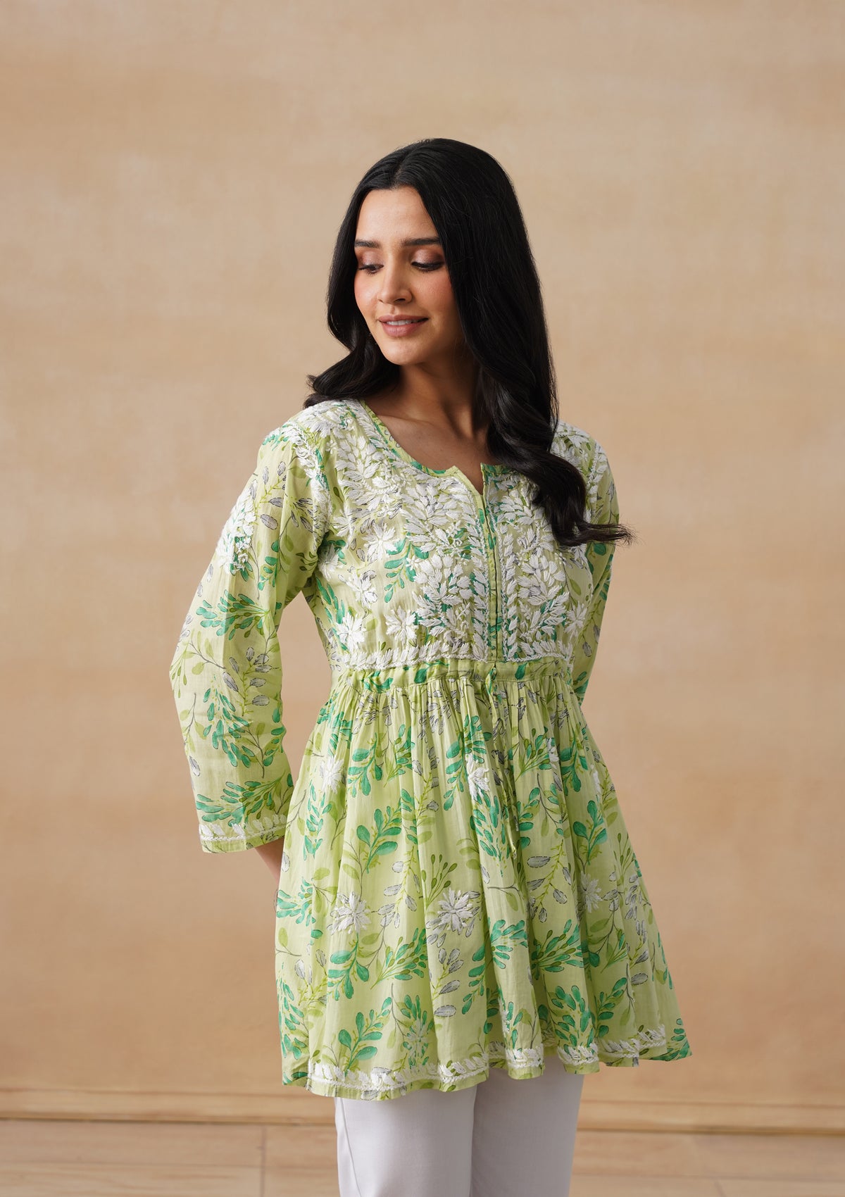 HOC Mulmul Chikankari Printed Women's Short Kurta - Green