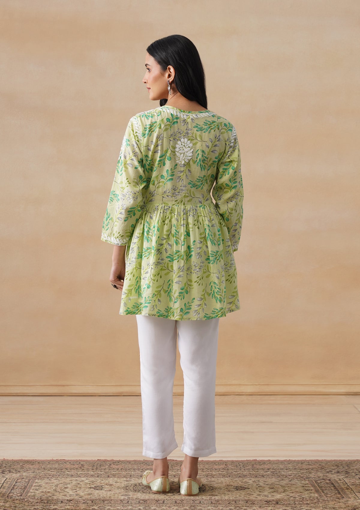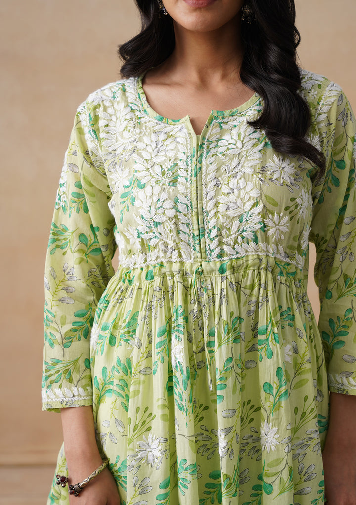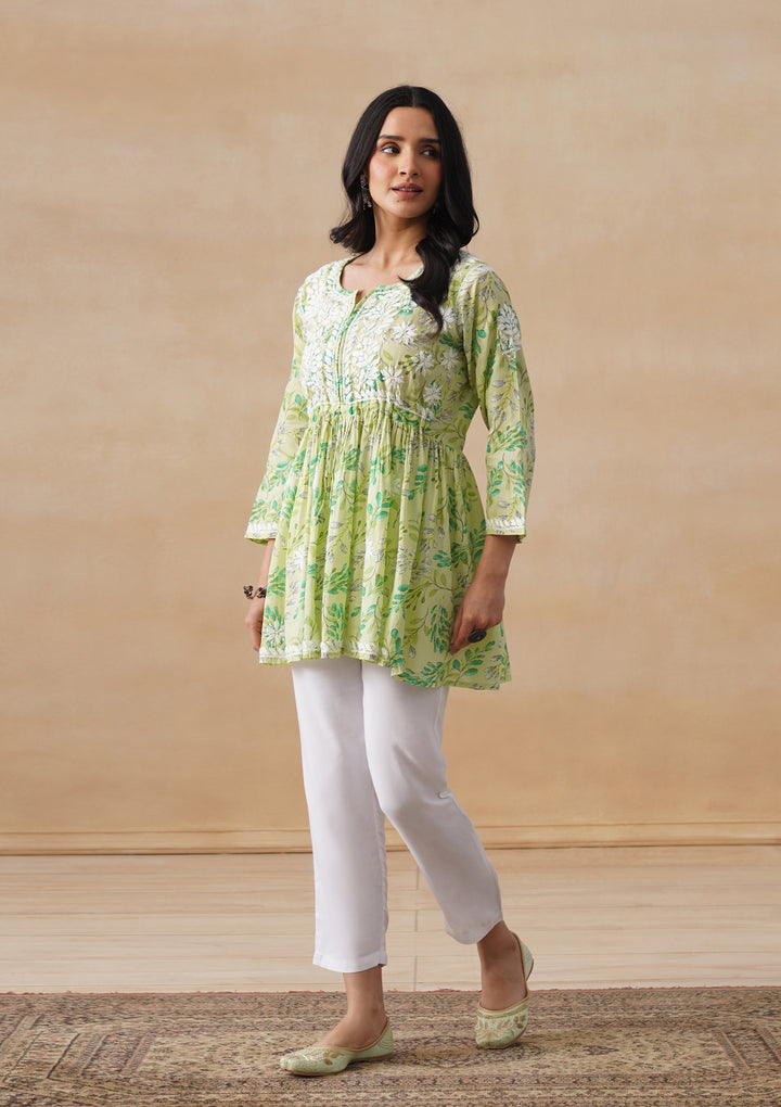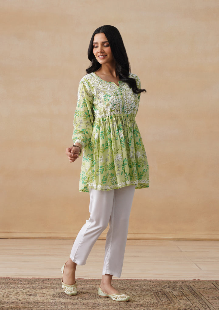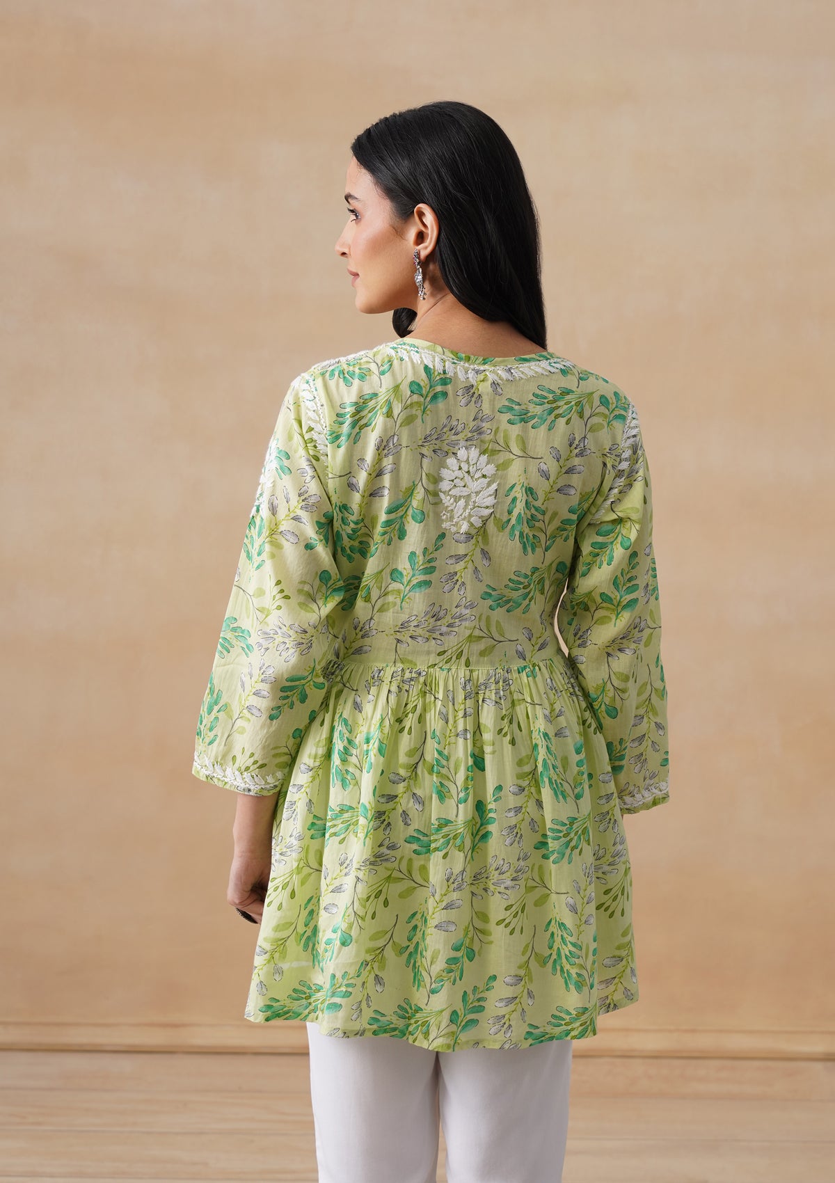 HOC Mulmul Chikankari Printed Women's Short Kurta - Green