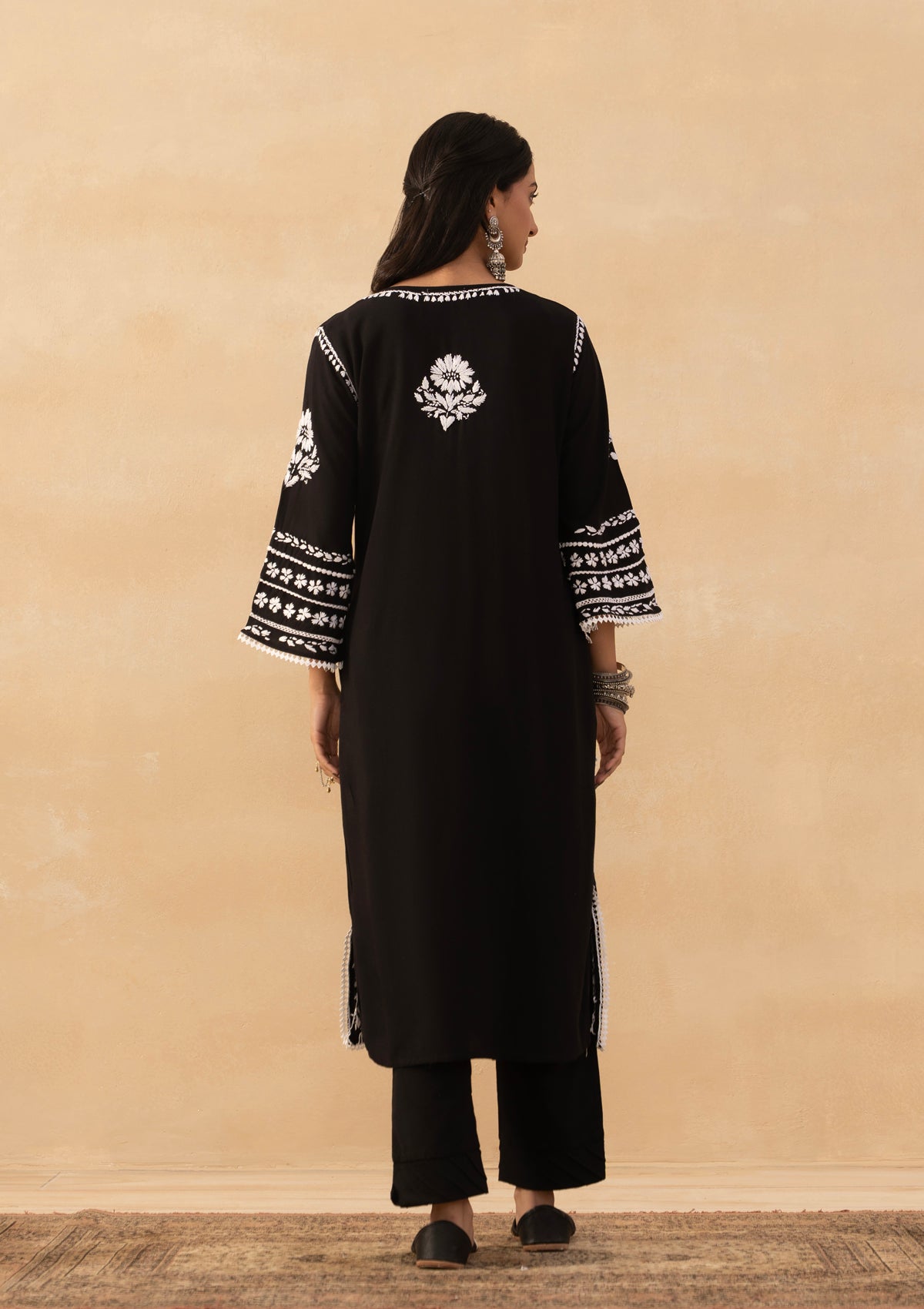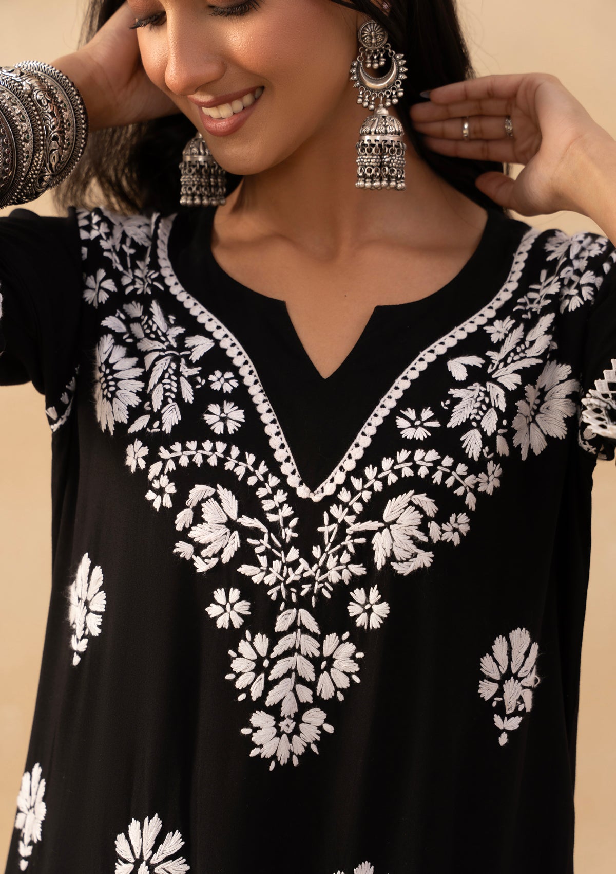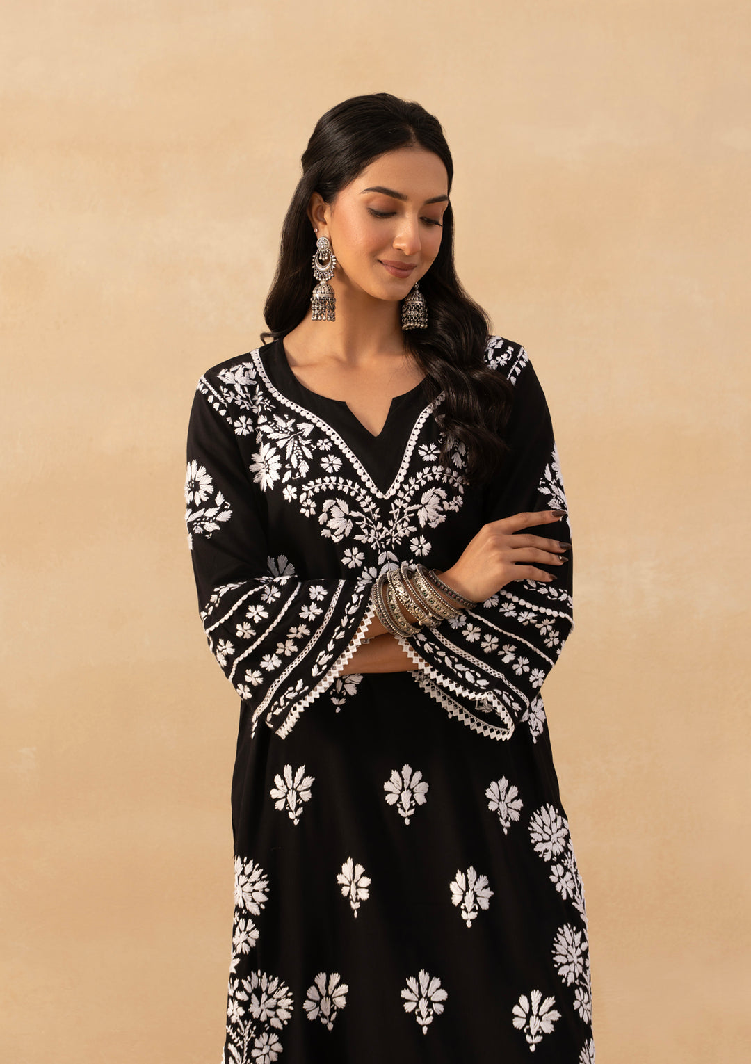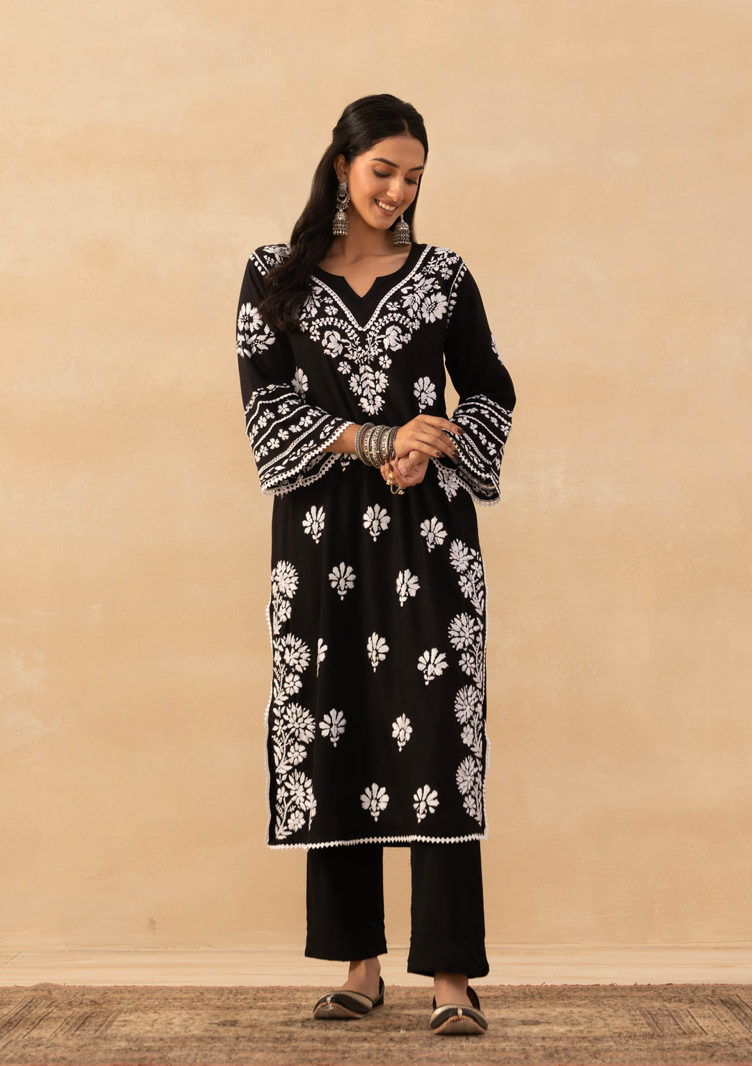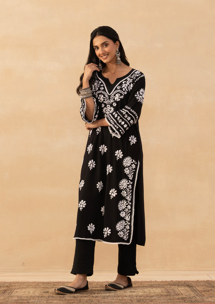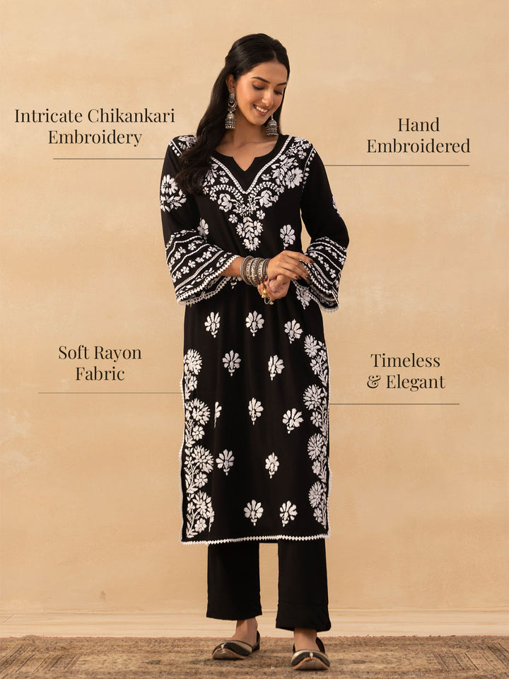 HOC Rayon Chikankari Solid Women's Long Kurta - Black