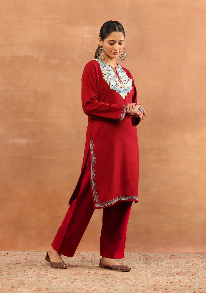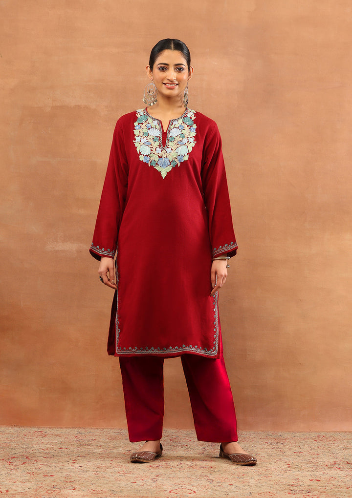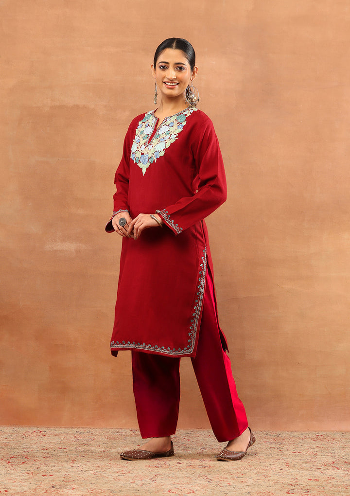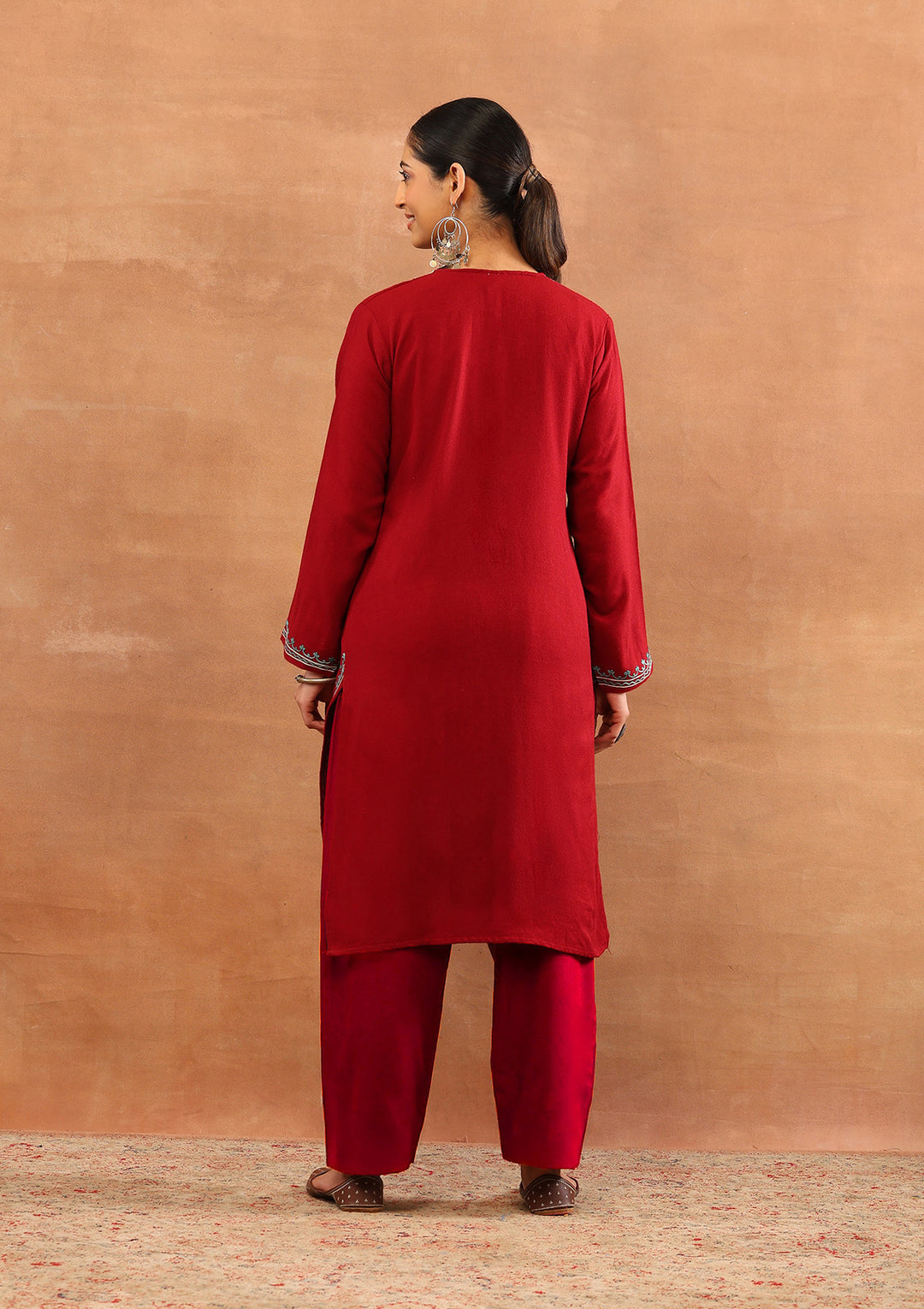 HOC Wool Aari Embroidered Solid Women's Long Kurta - Red