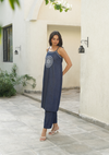 HOC Chambray Denim Chikankari Solid Women's Strappy Long Kurta Set - Dark Blue
