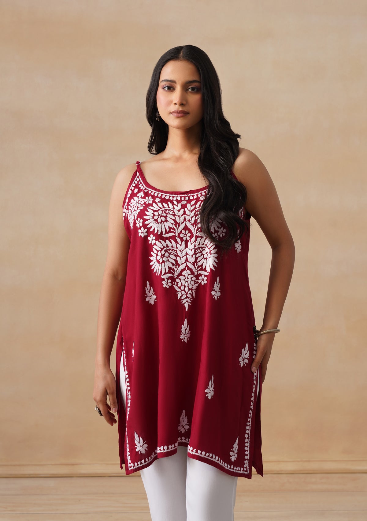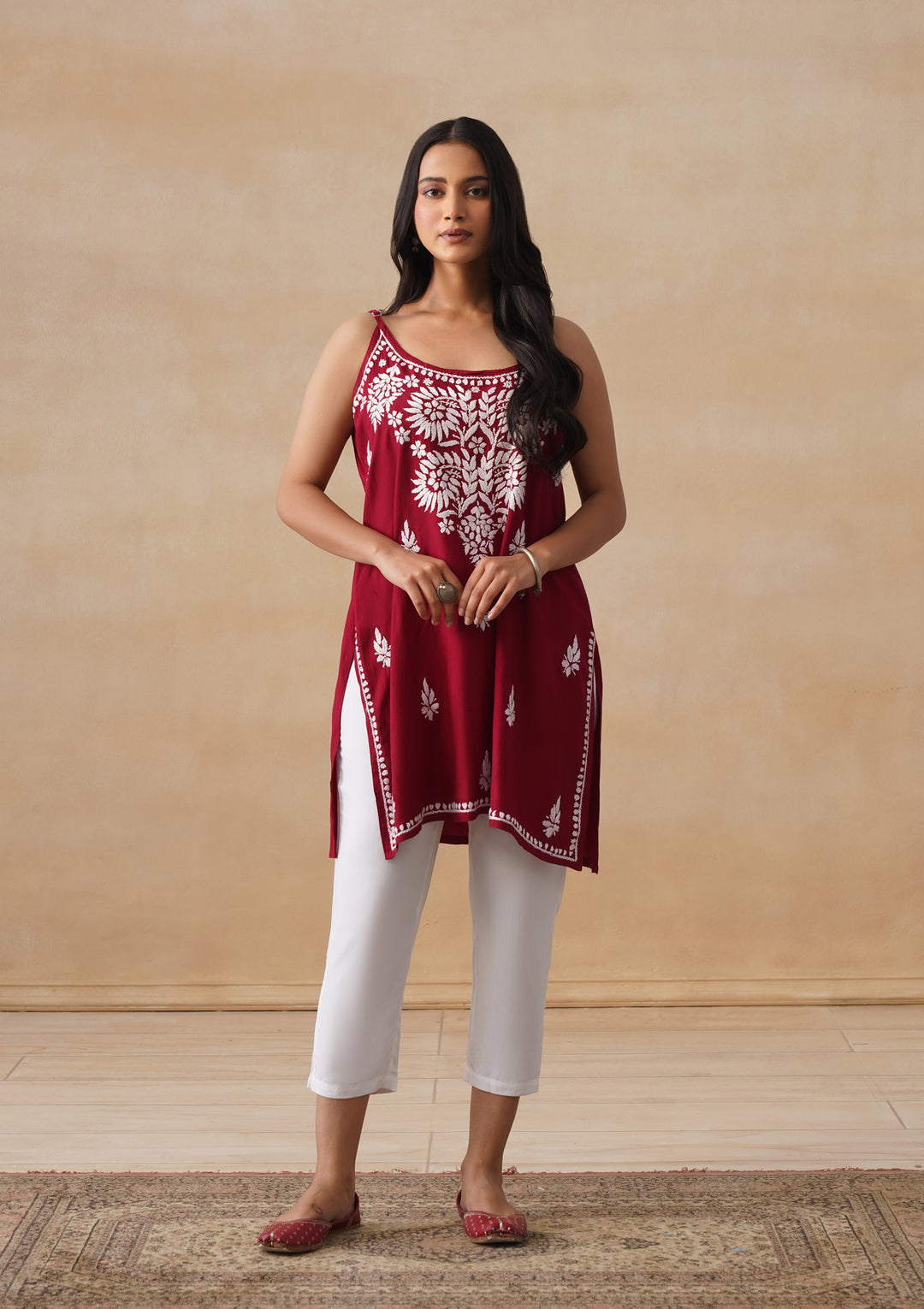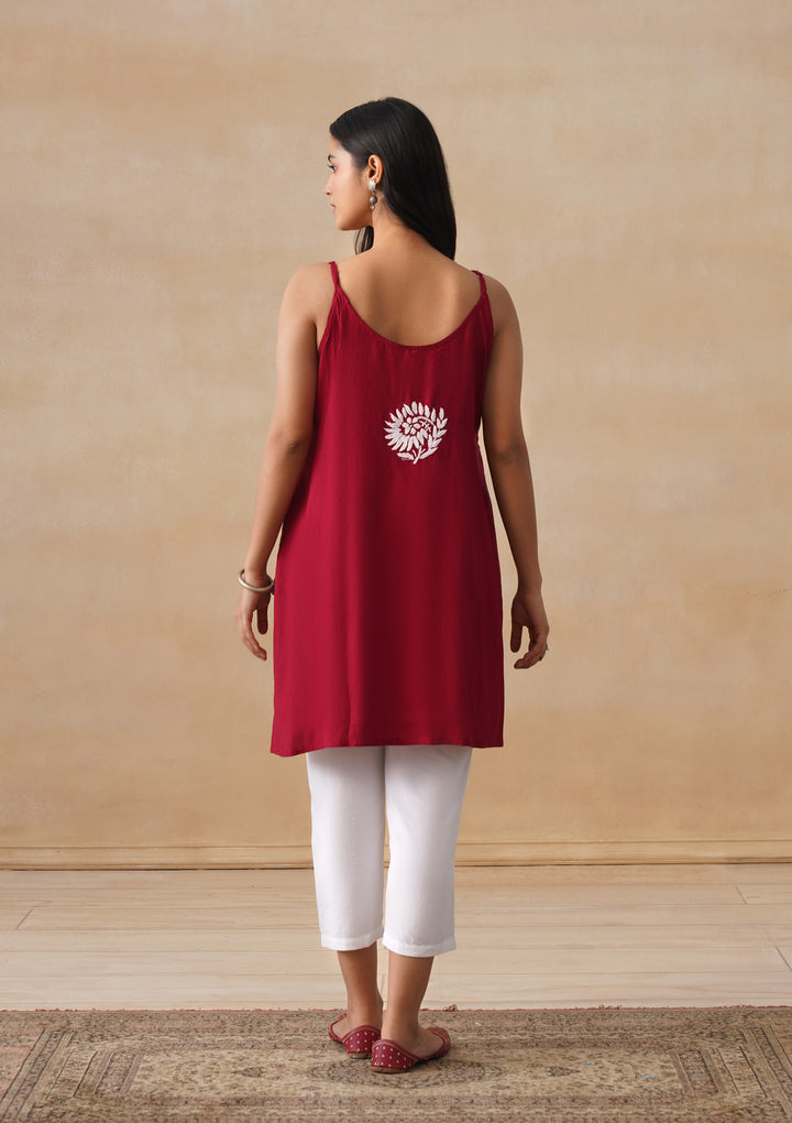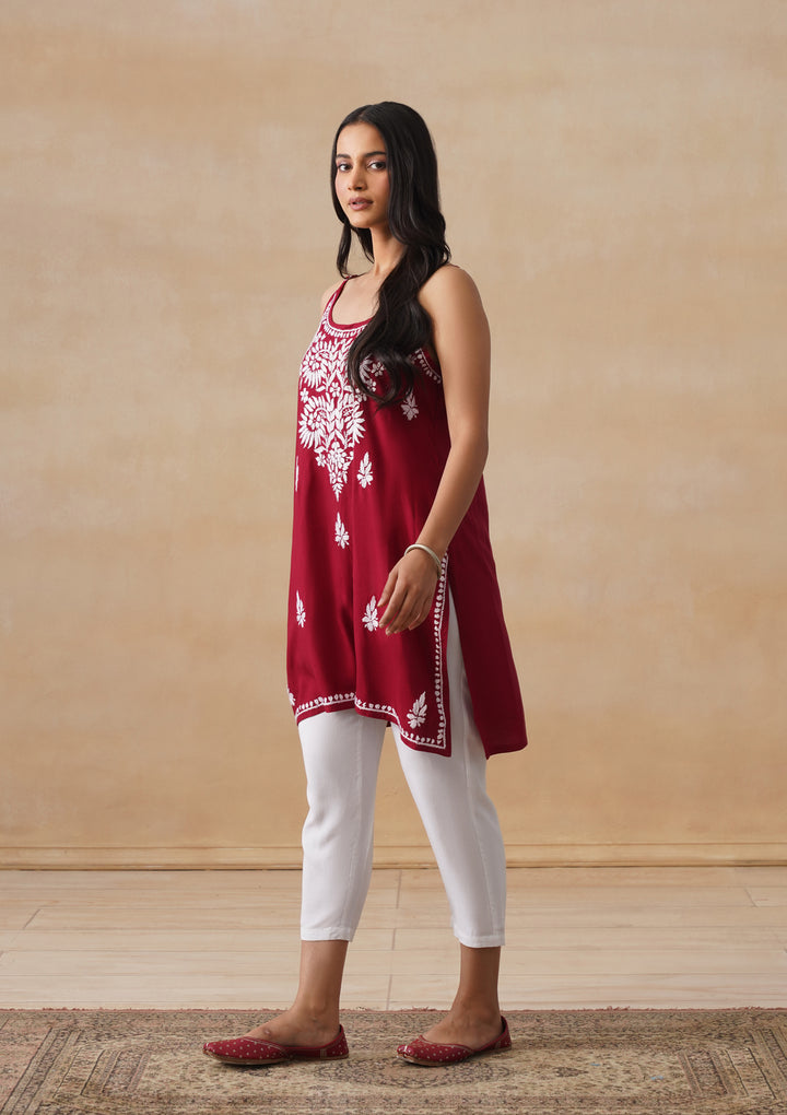 HOC Rayon Chikankari Solid Women's Short Kurta - Maroon