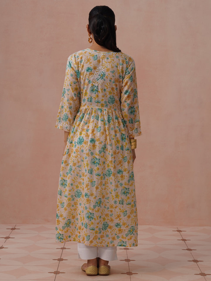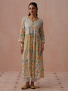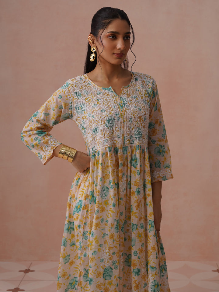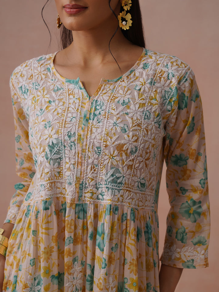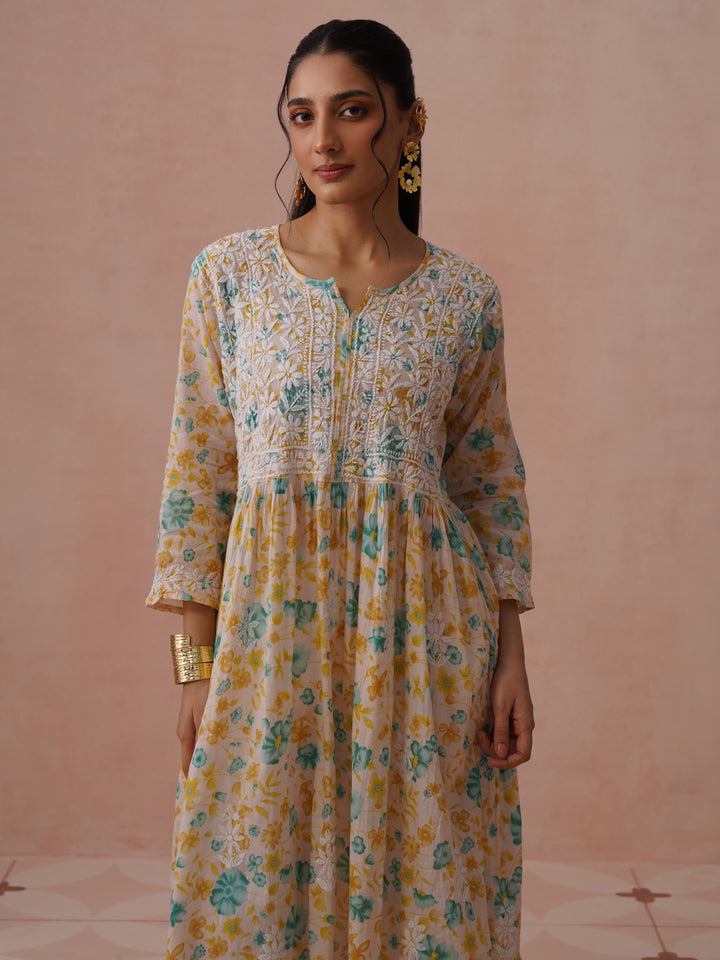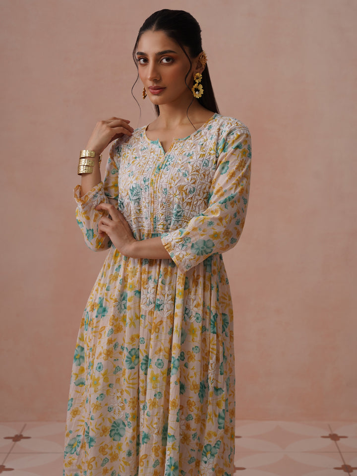 HOC Mulmul Chikankari Printed Women's Long Gown - Peach