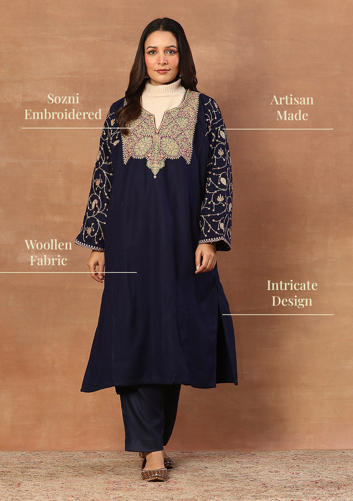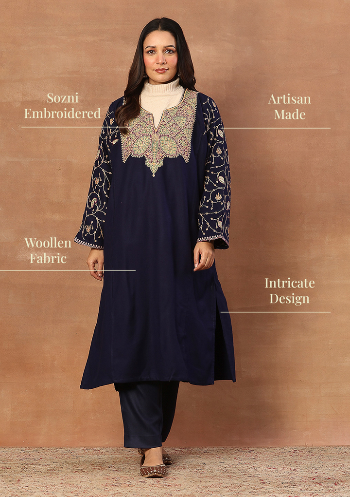 HOC Kashmiri Wool Sozni Solid Women's Long Phiran- Navy Blue