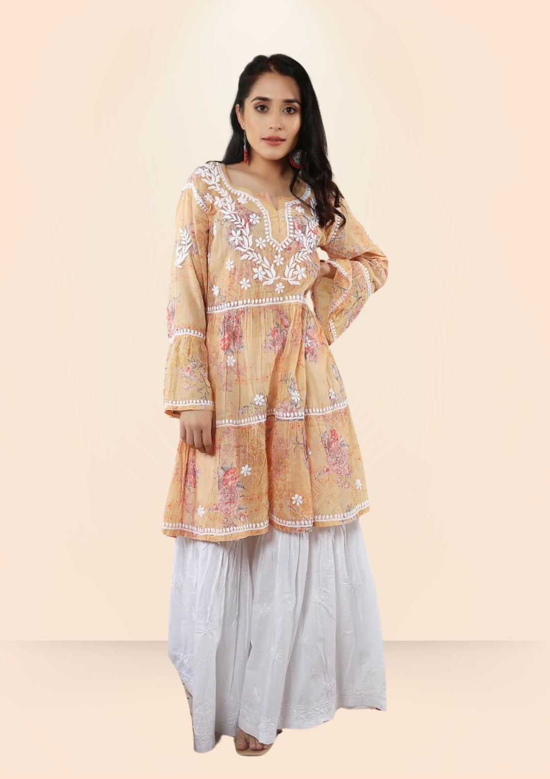 HOC Mulmul Chikankari Printed Women's Long Kurta -Orange