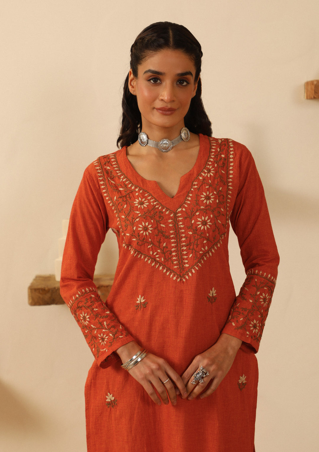 HOC Zainab Chikankari Mulmul Printed Straight Kurta -Orange