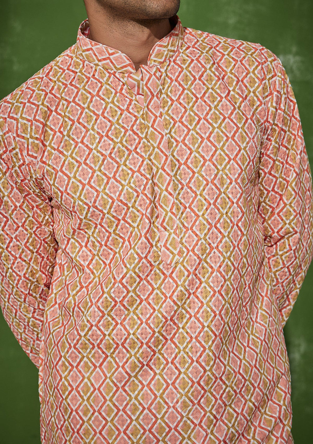 HOC Poly Cotton Printed Men's Short Kurta - Orange