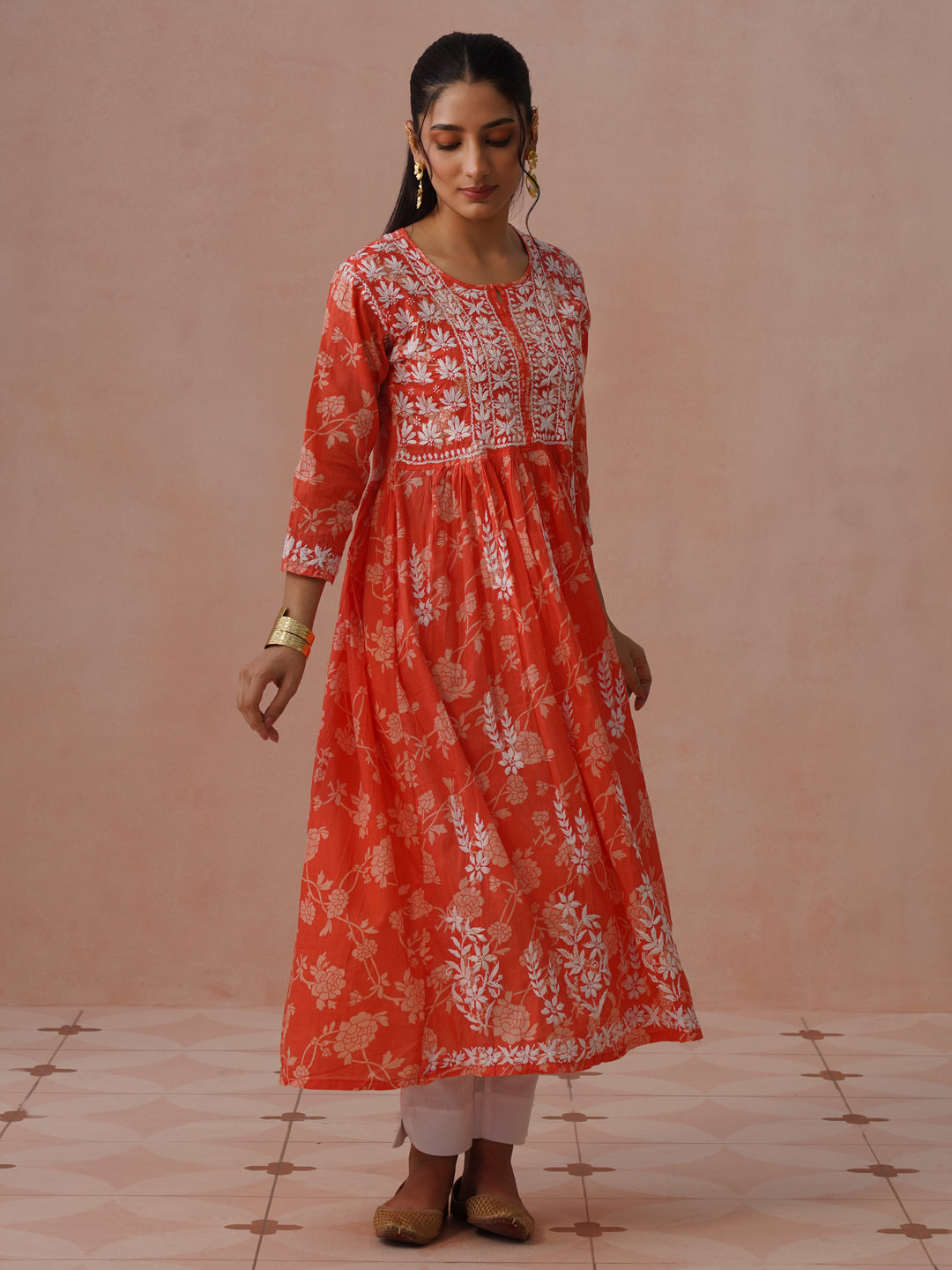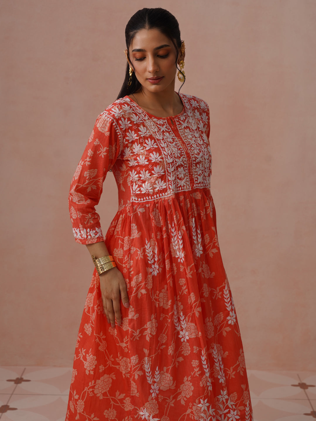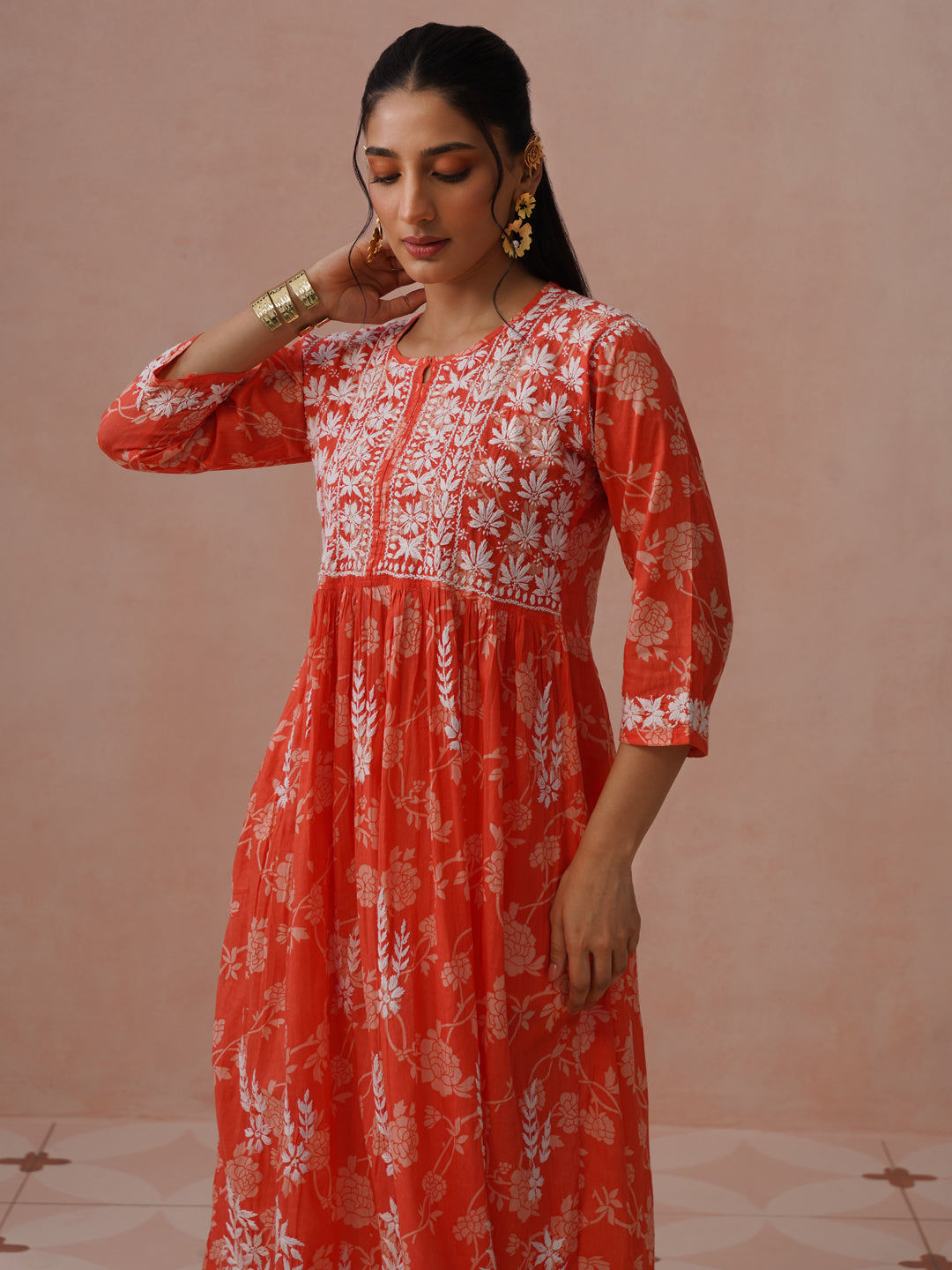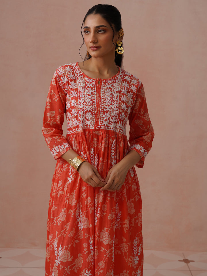 HOC Mulmul Chikankari Printed Women's Long Gown - Orange