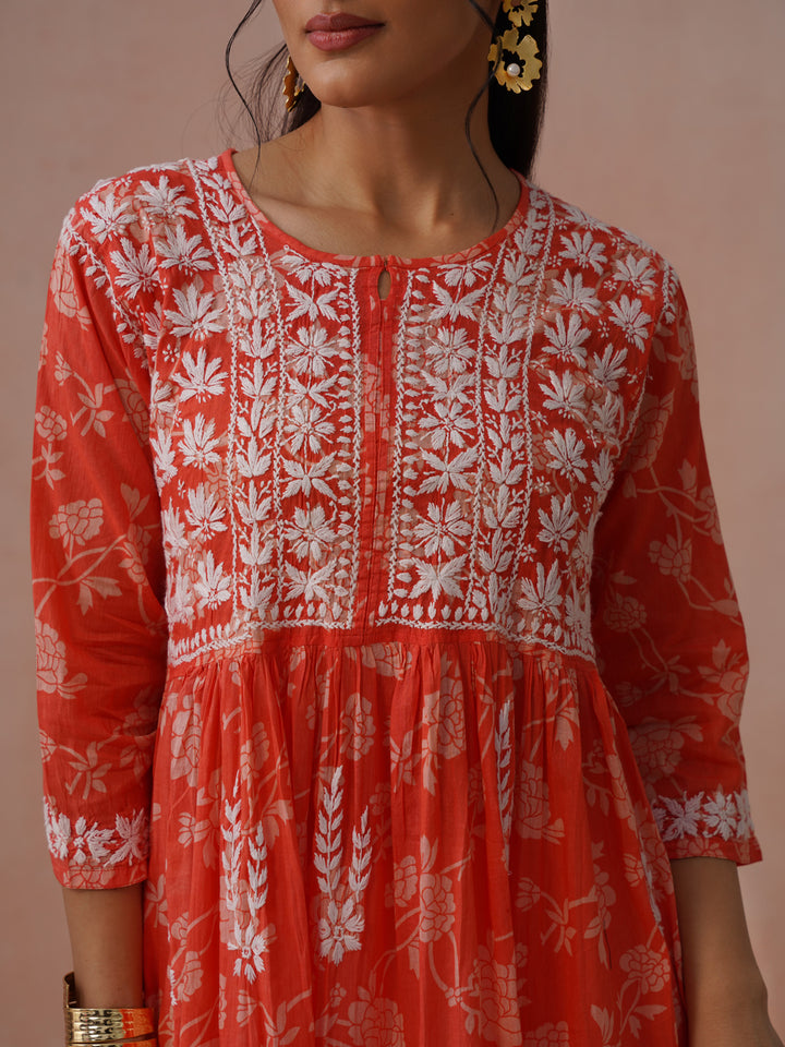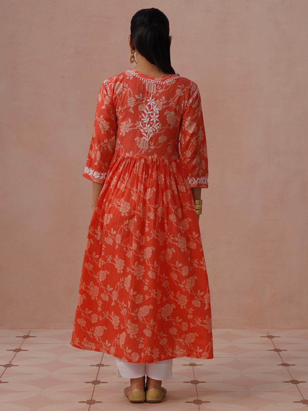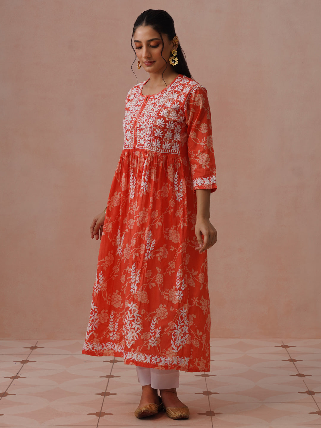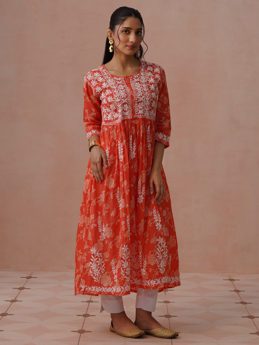 HOC Mulmul Chikankari Printed Women's Long Gown - Orange
