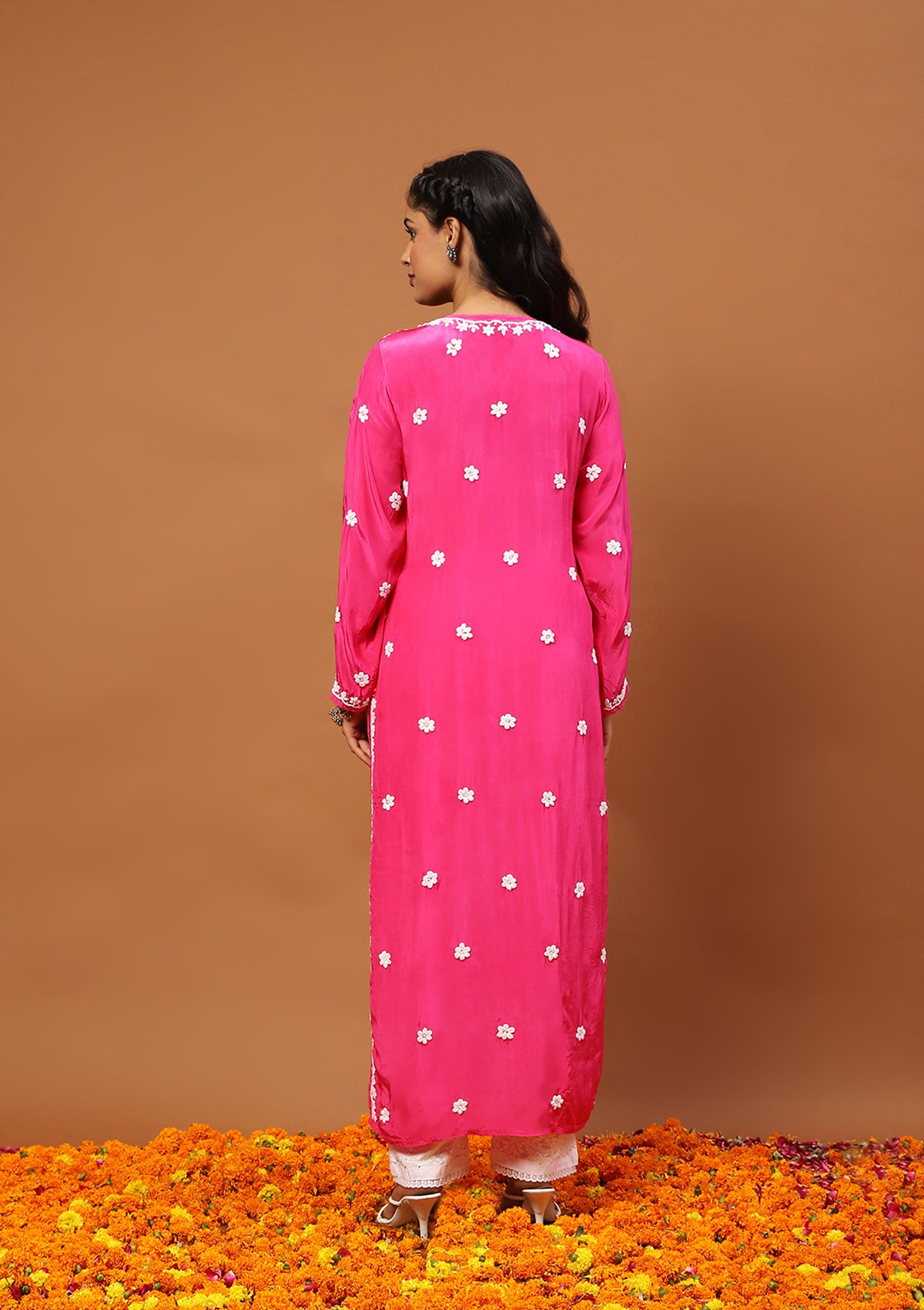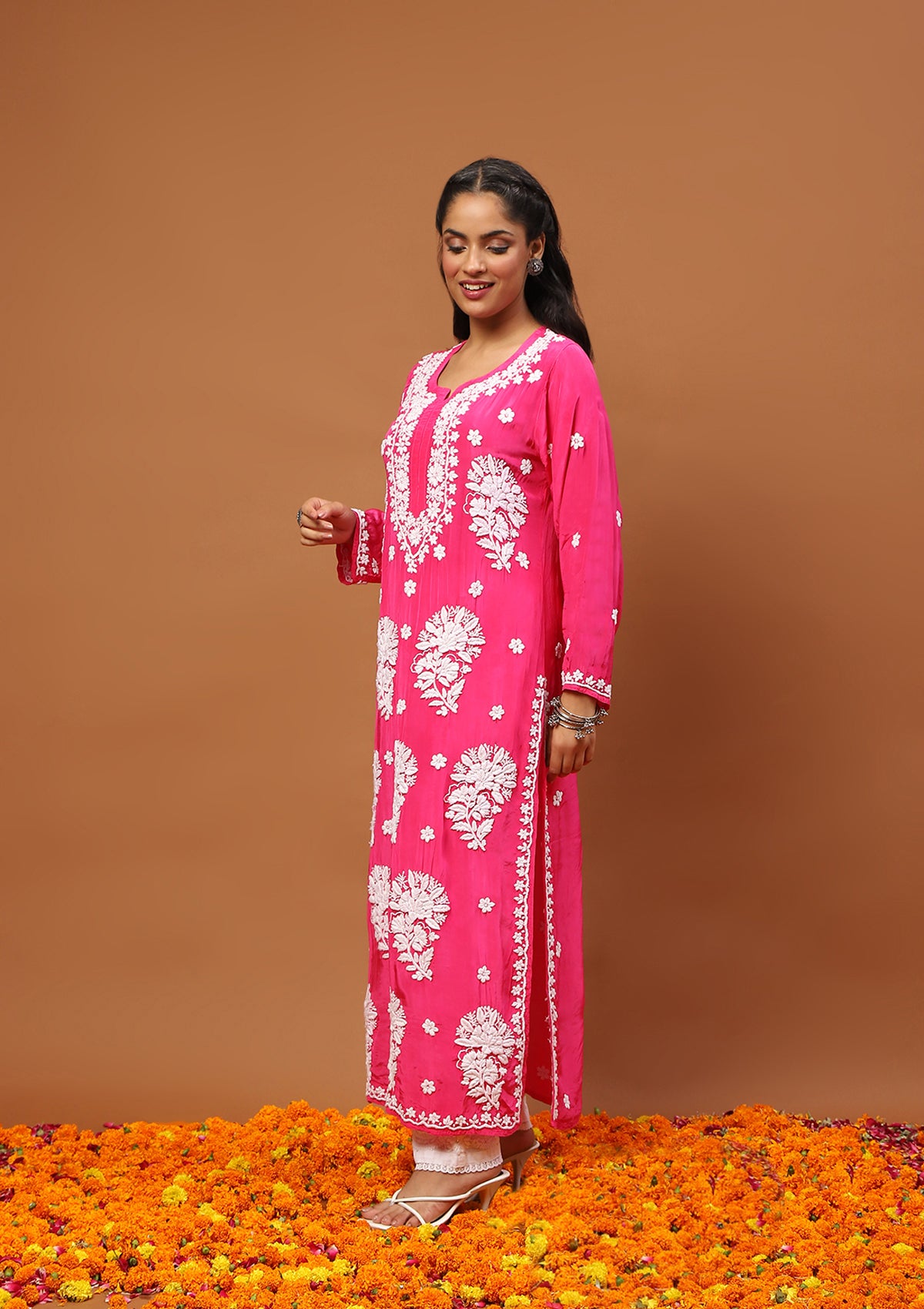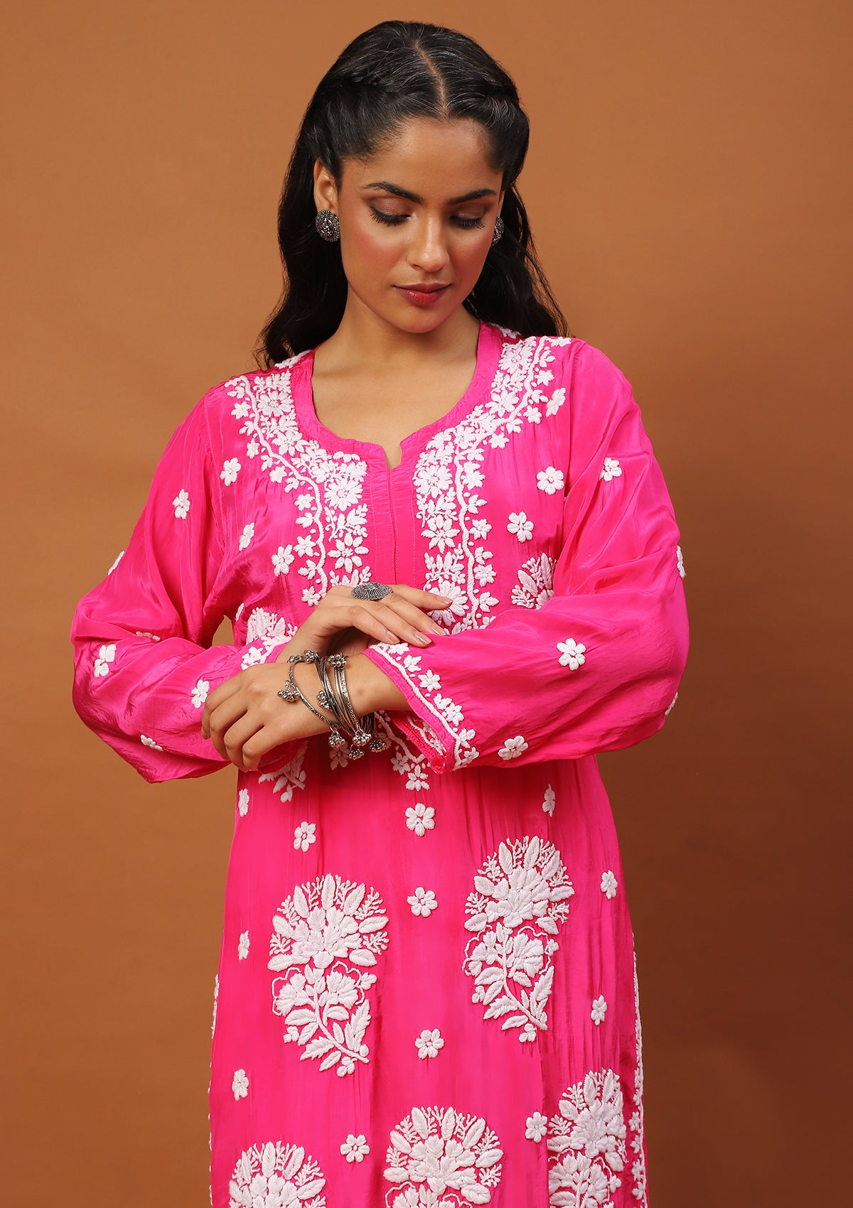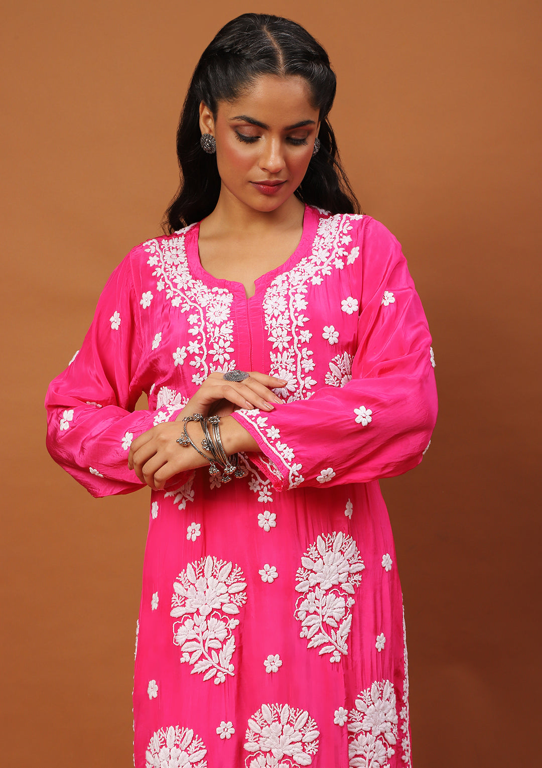 HOC Satin Crepe Chikankari Solid Women's Long Kurta - Dark Pink
