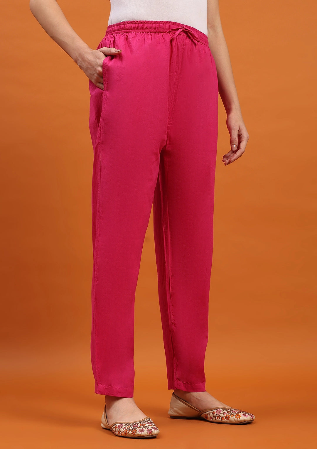 Straight-fit kurtas and Anarkali styles create a slimming effect by skimming the body and providing a graceful drape. Darker shades of pink, such as magenta or fuchsia, also help in creating a sleek silhouette.