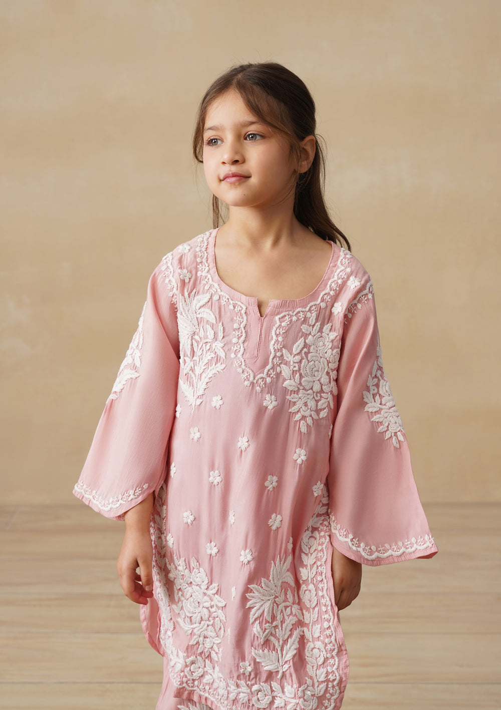 HOC Chanderi Chikankari Solid Girls 2 PC Long Kurta Set - Dust pink